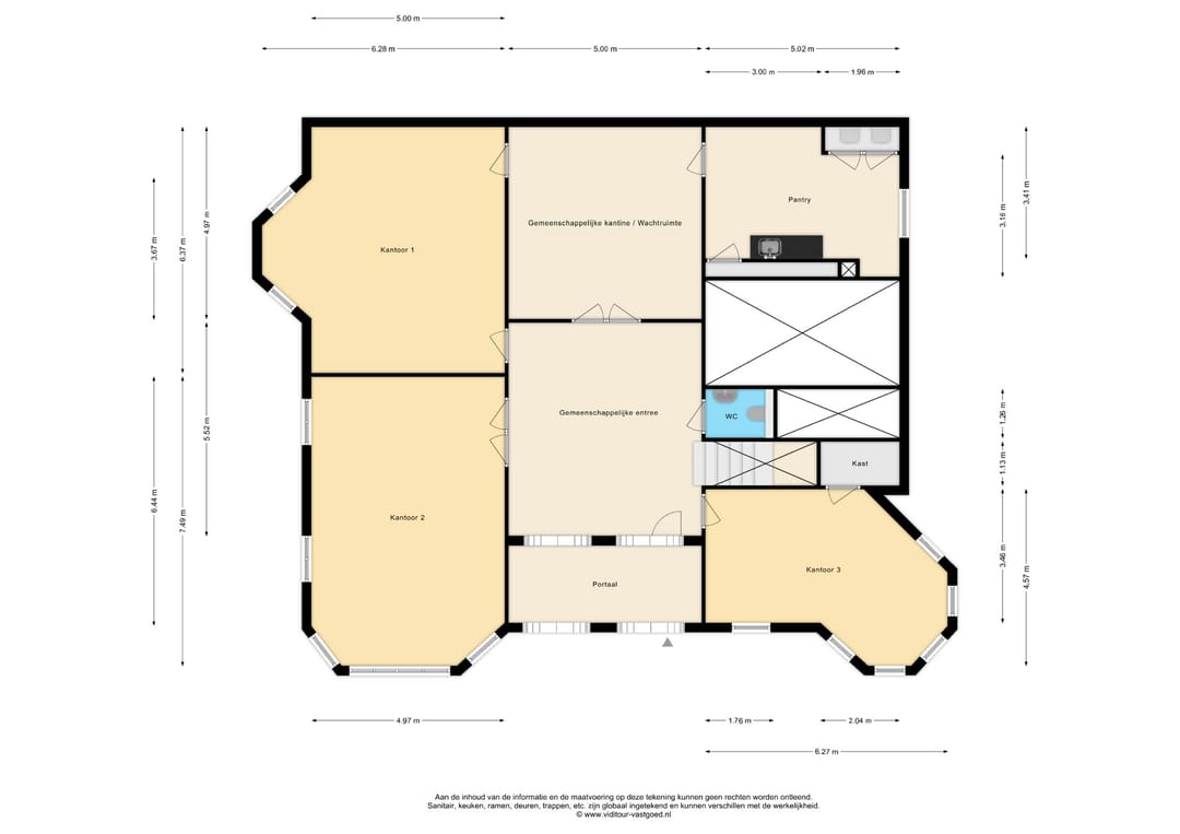 De ruimtes beschikken over een gezamenlijke entree met portaal. Er is een gezamenlijke gang die toegang biedt tot het toilet. Daarnaast is er een gemeenschappelijke kantine/wachtruimte met aansluitende pantry.