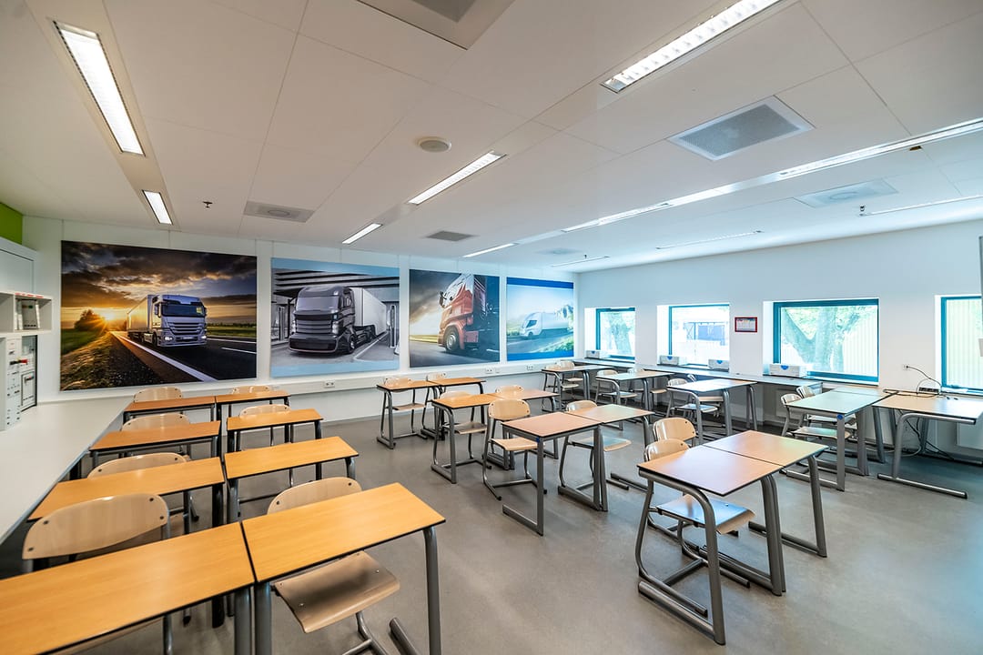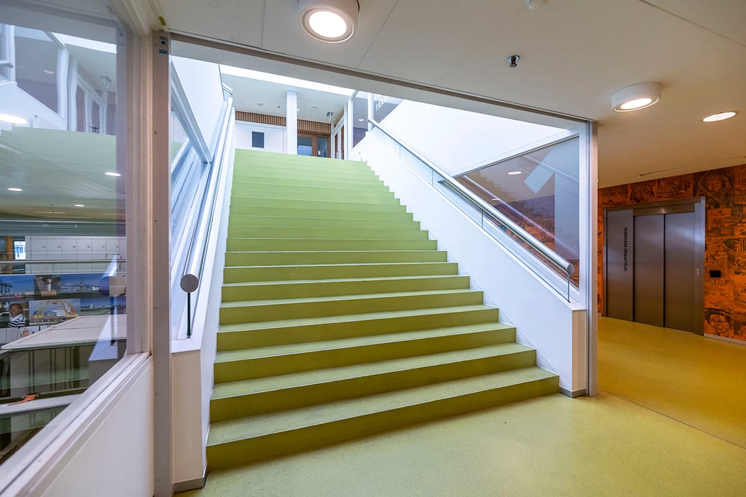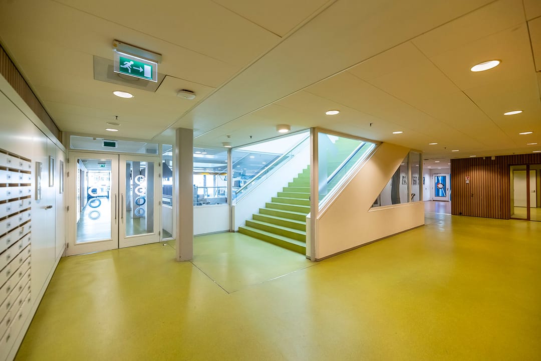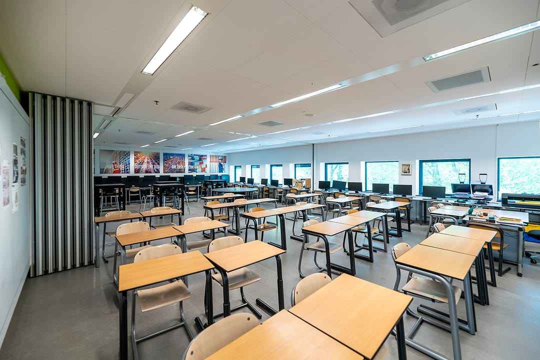 - brede gangen en trap uitgerust op grote verkeersstromen als alle lokalen gelijktijdig leeg moeten.