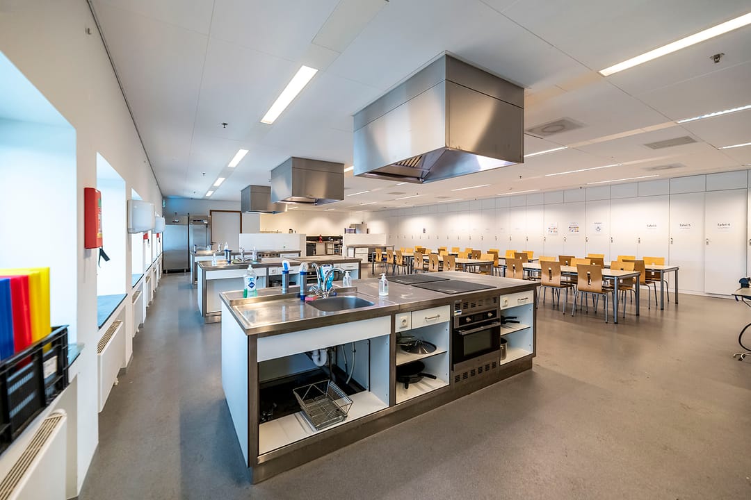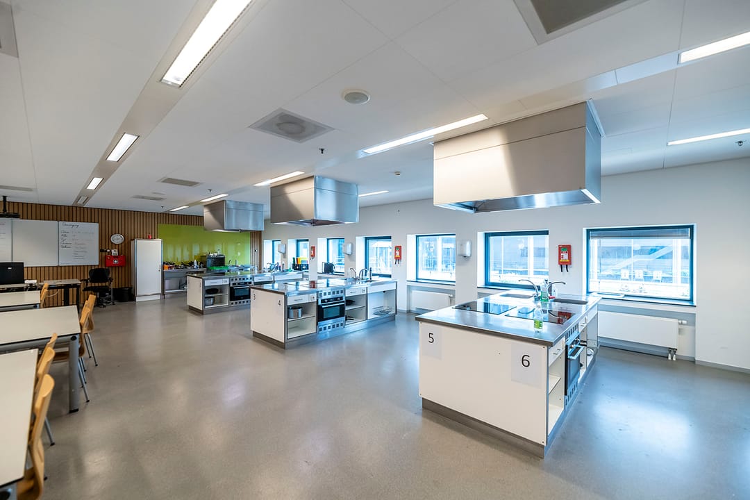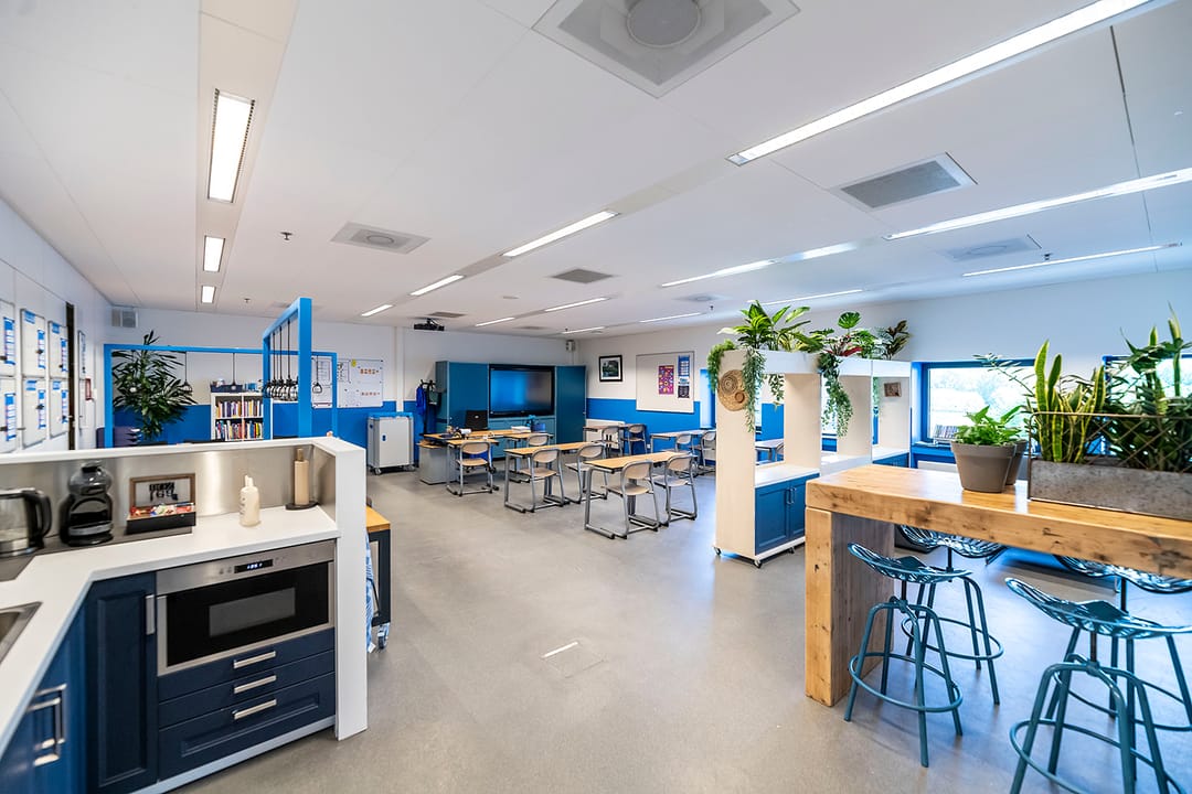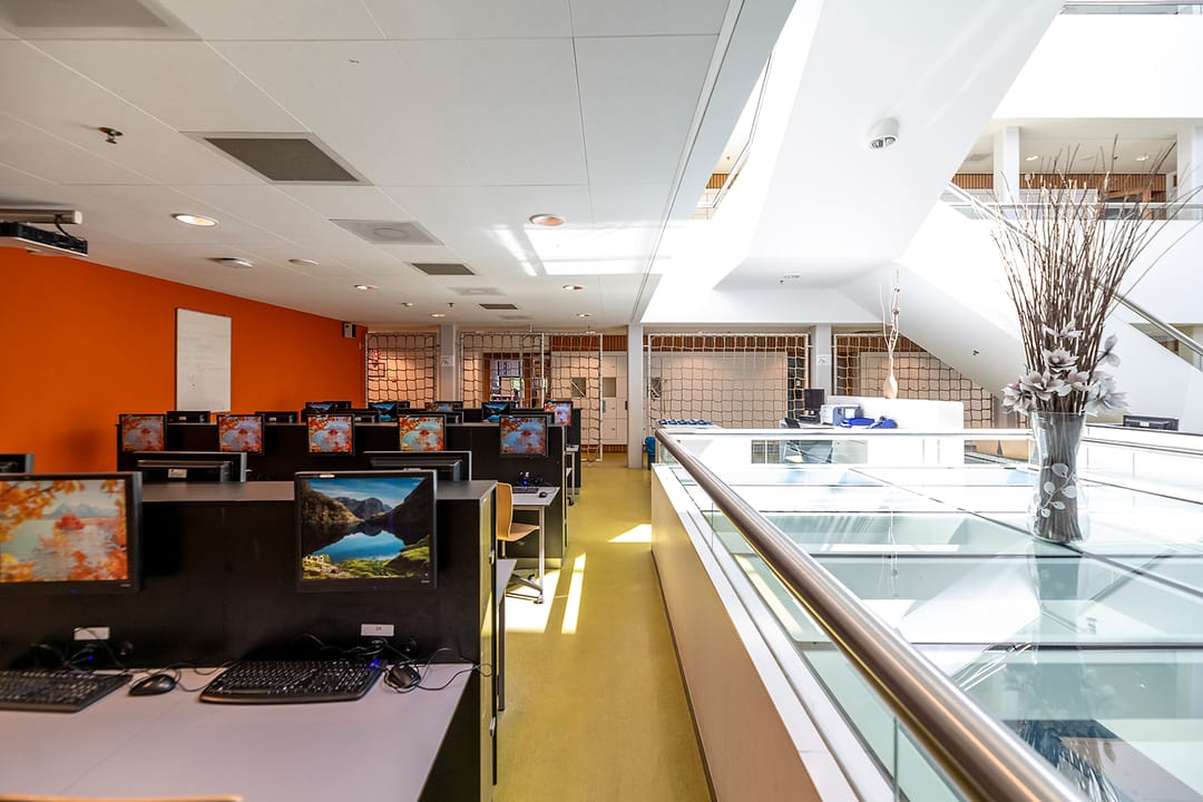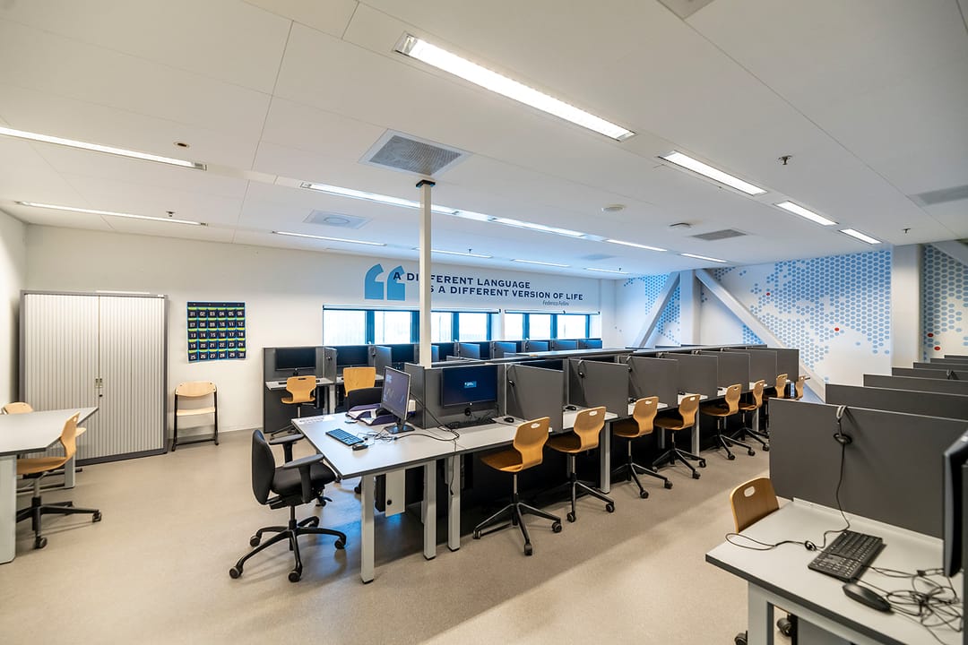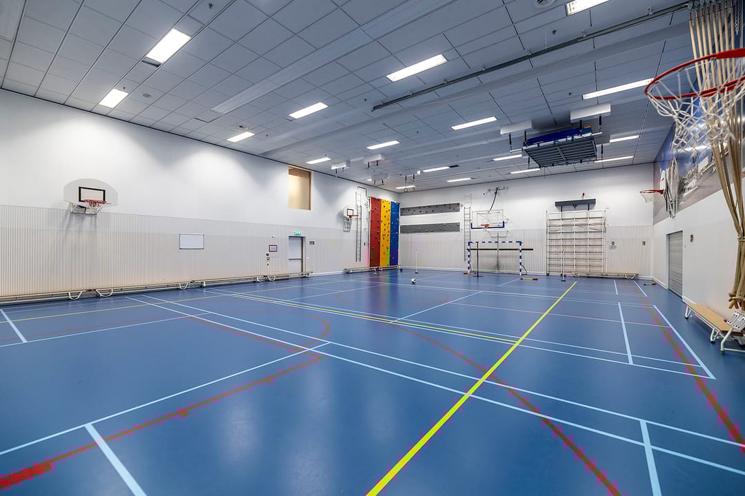 - spotverlichting in verkeersruimten, en lijn-armaturen in de klaslokalen