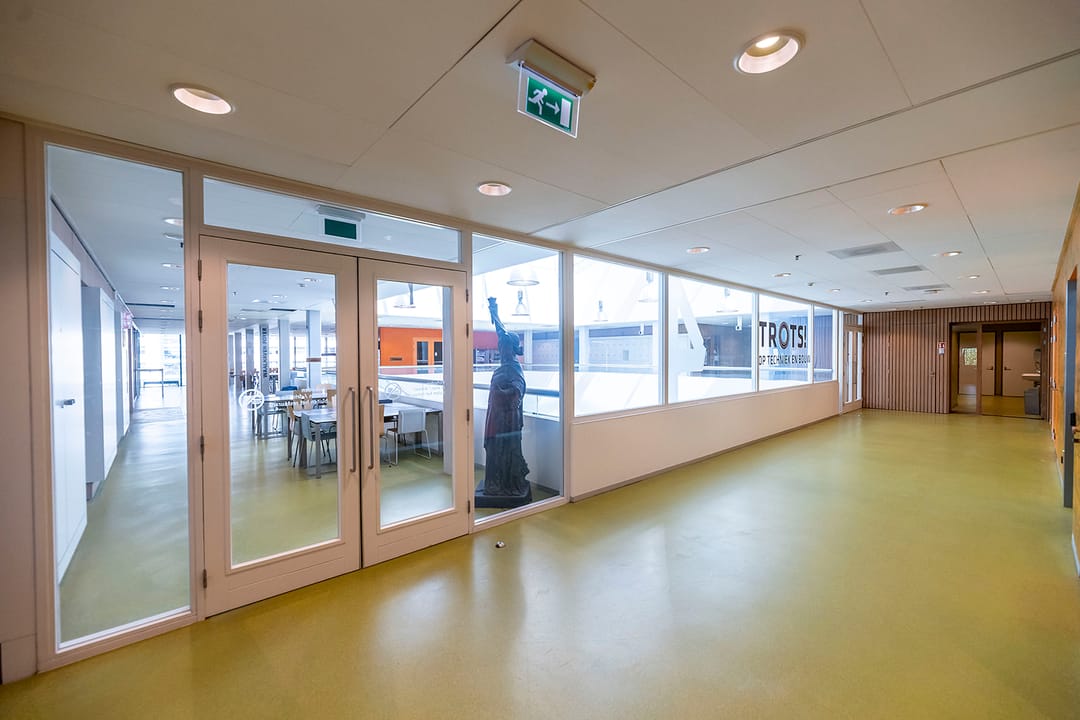 - op diverse plekken in het complex ruimten met dubbele verdiepingshoogte, waaronder technieklokaal verdieping 0, kantine achterzijde verdieping 0, technieklokaal verdieping 2, gymnastieklokaal verdieping 2;