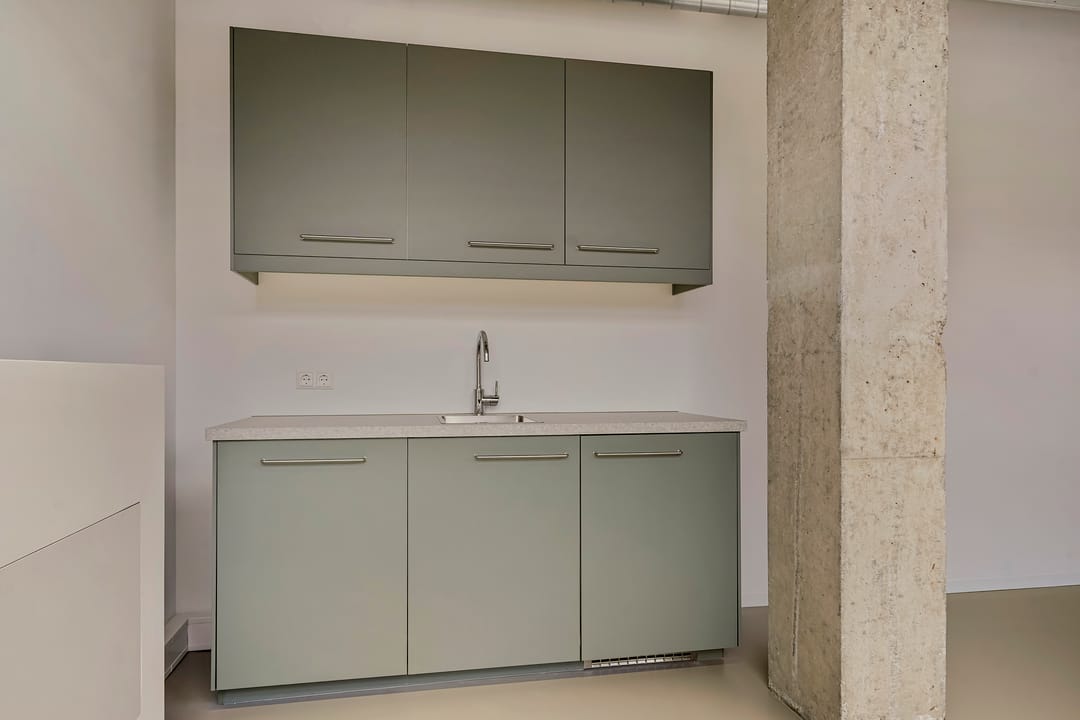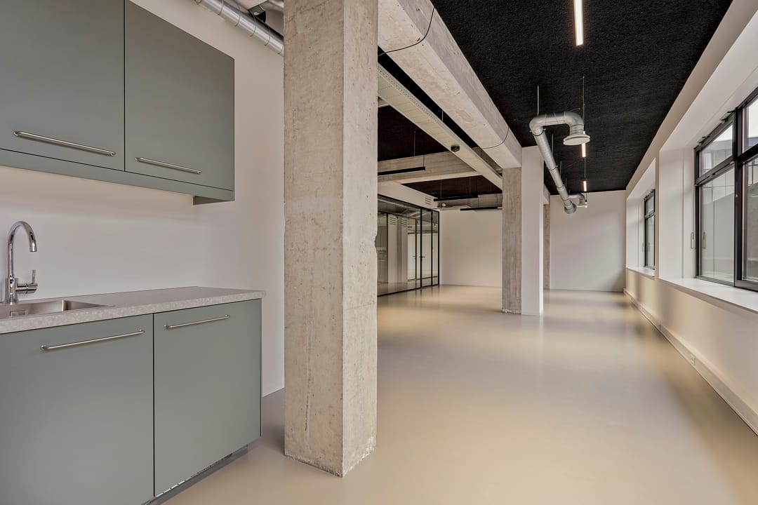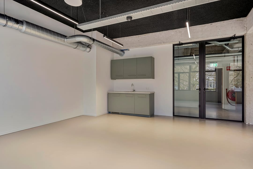 - Een industrieel plafond (akoestisch afgewerkt) inclusief vrij hangende LED verlichtingsarmaturen);