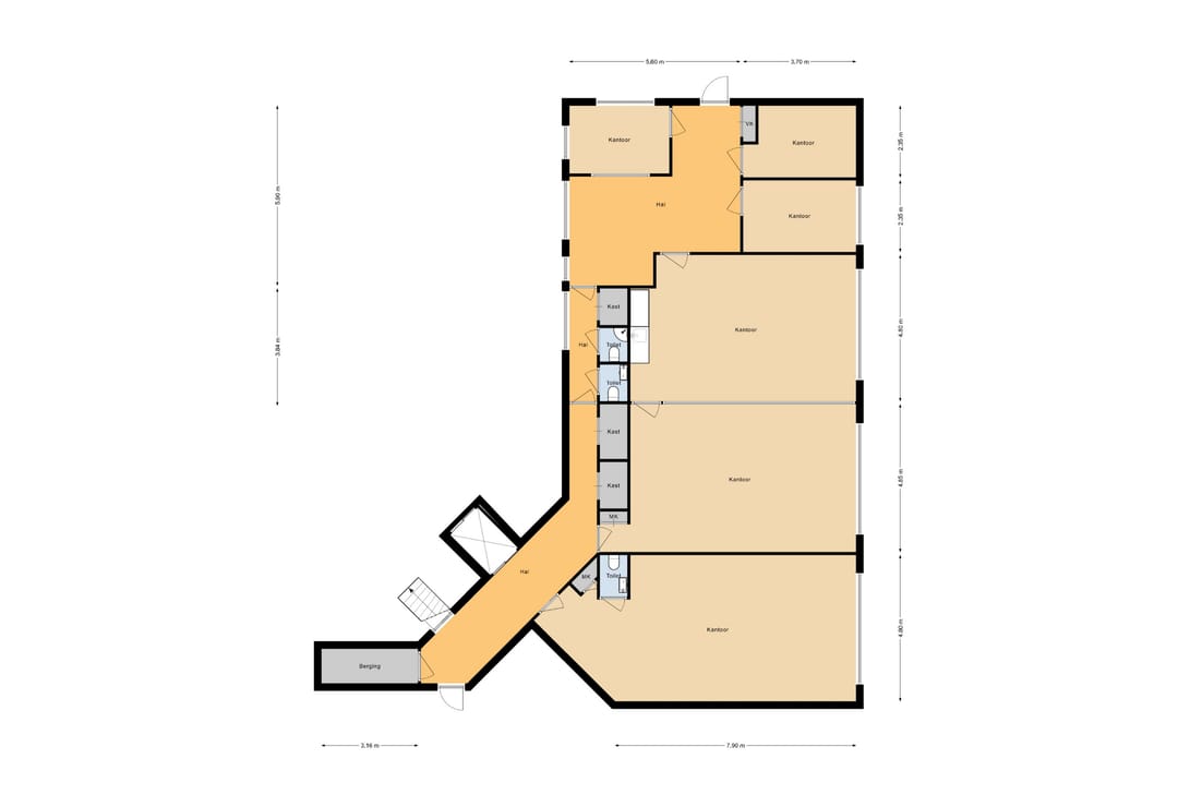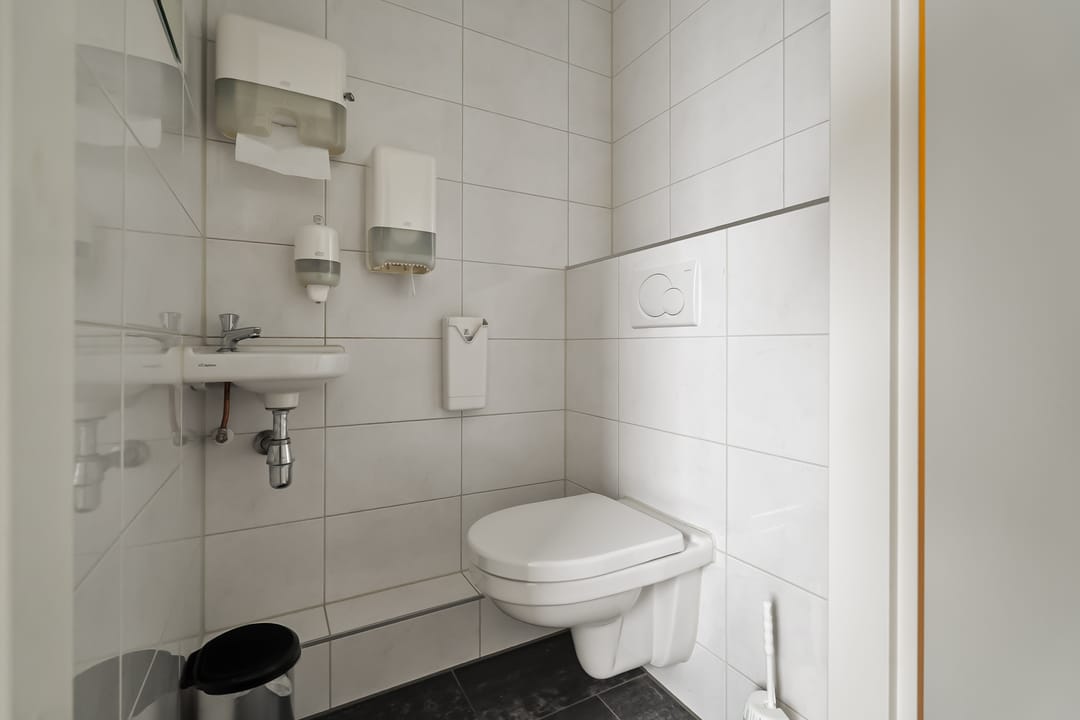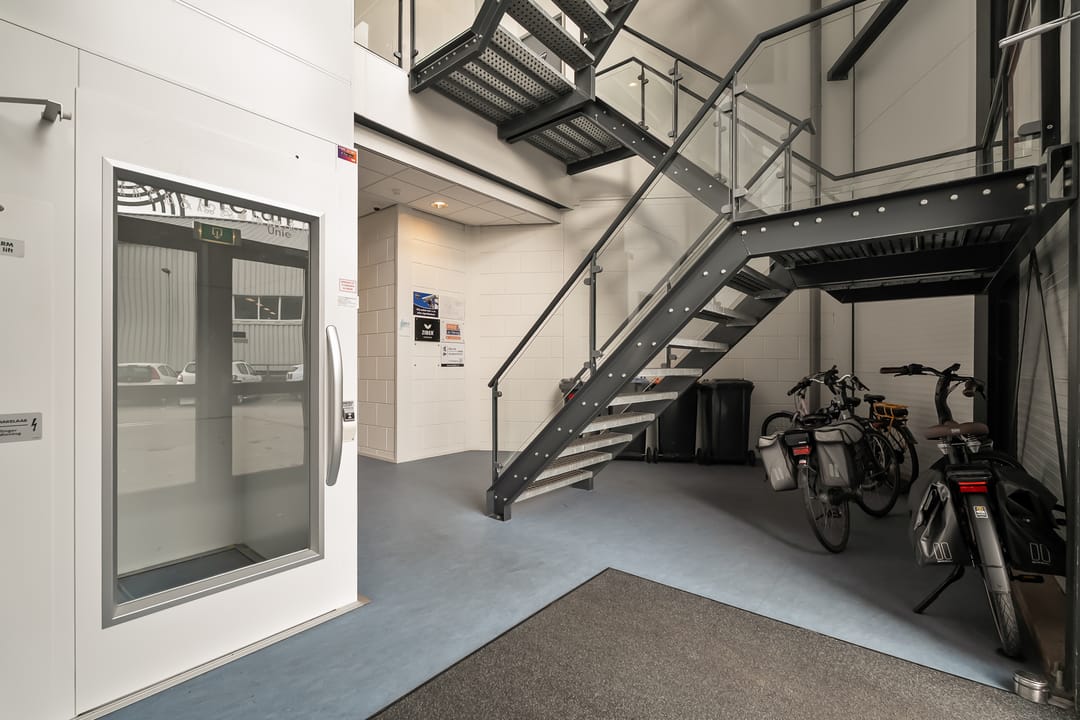 De ruimte is bereikbaar via de centrale hal met trappenhuis en goederenlift, wat het pand ook praktisch maakt voor dagelijks gebruik.