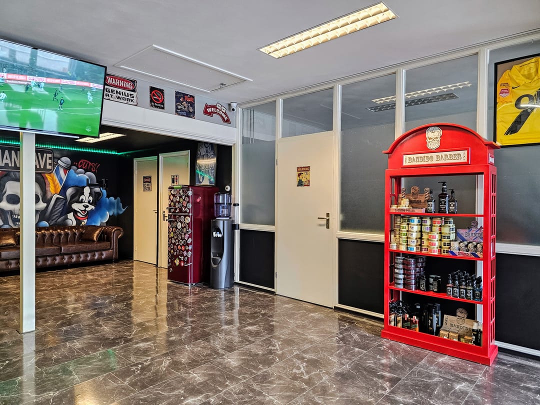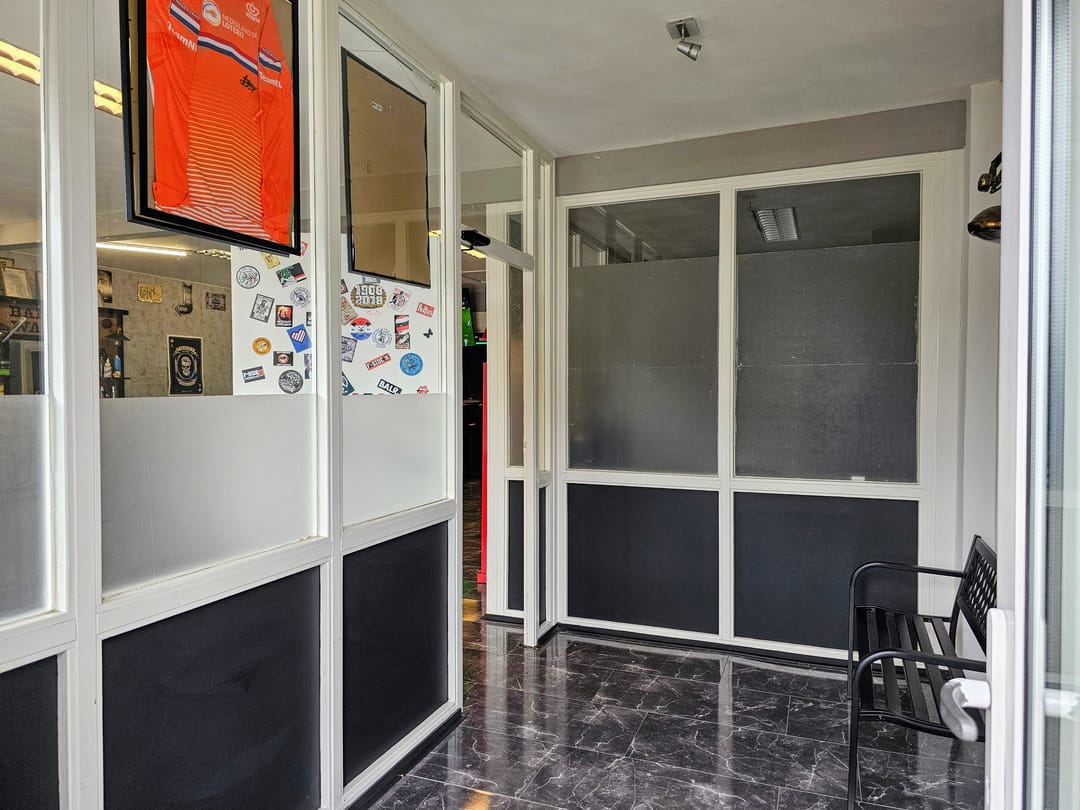 U komt binnen in de ruime hal (kan eventueel als wachtruimte dienen) welke toegang geeft tot de algemene ruimte. Deze is voorzien van een keukenblok en er is een separaat kantoor/werkruimte. Er is een bergkast en een dames- en herentoilet.