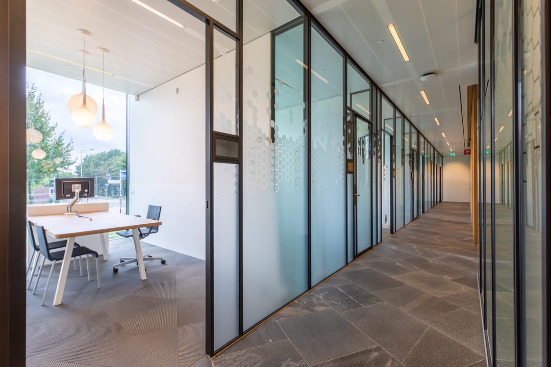 Het geheel kent een imposante ontvangsthal/entree en is voorzien van zowel kantoortuinen, separate kantoren alsook vergaderzalen van diverse groottes.