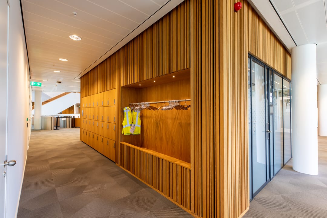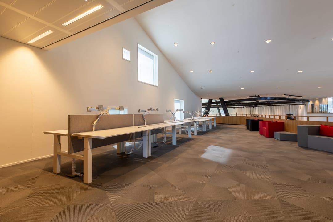 Door de open structuur ontstaat ruimtelijkheid met aan de vleugels alle functies die bij een modern kantoor