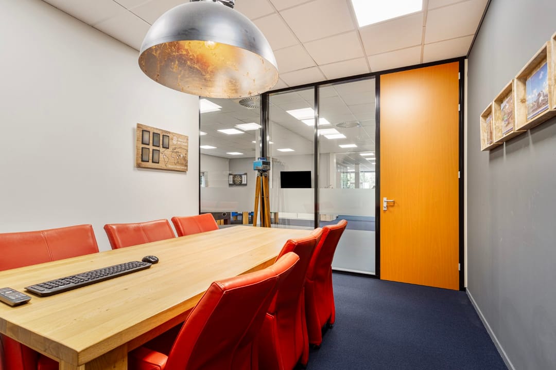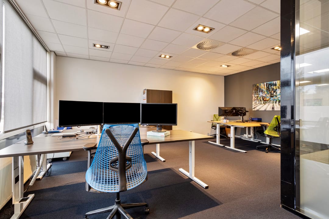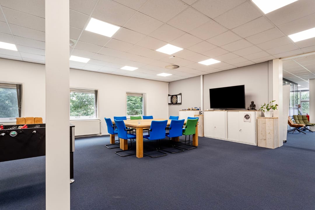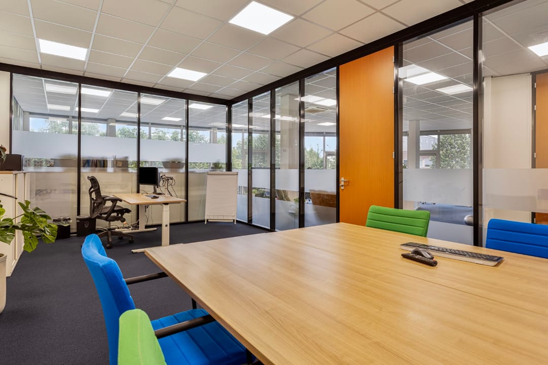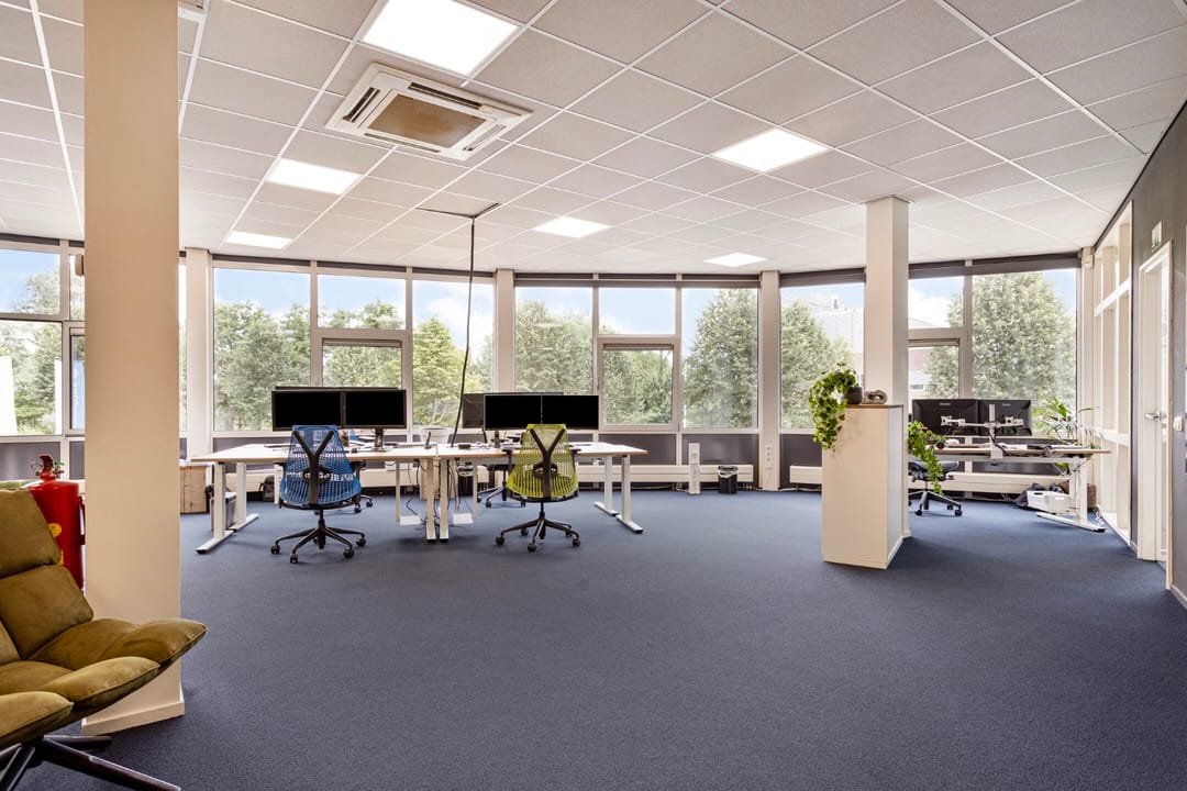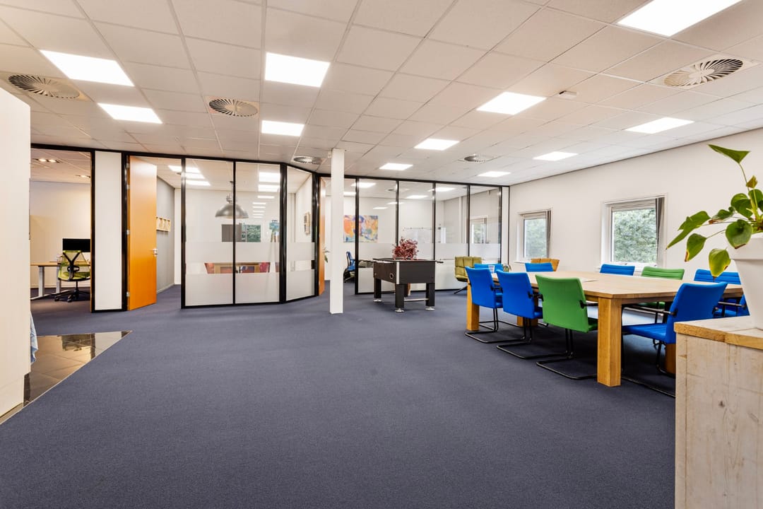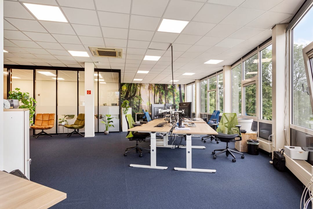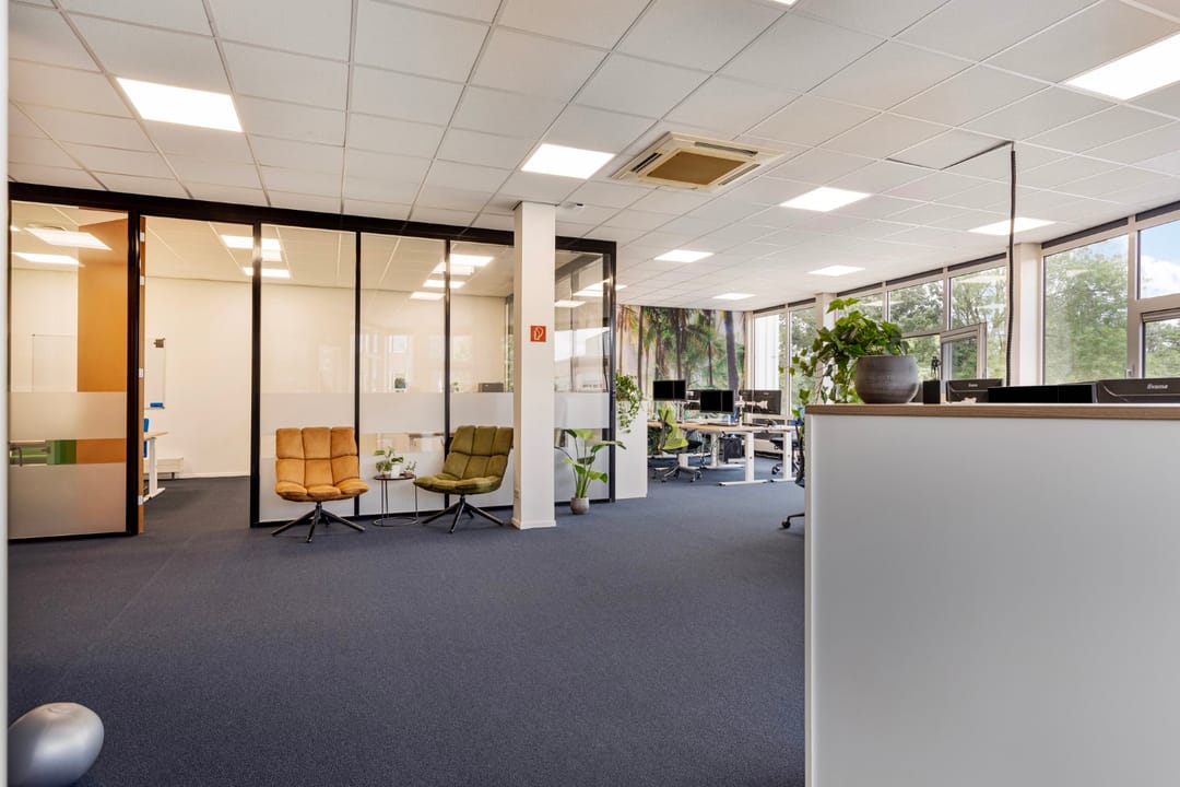 - Gedeeltelijk ingedeeld in kantoorkamers door middel van moderne zwarte verplaatsbare systeemwanden met veel glastoepassing;