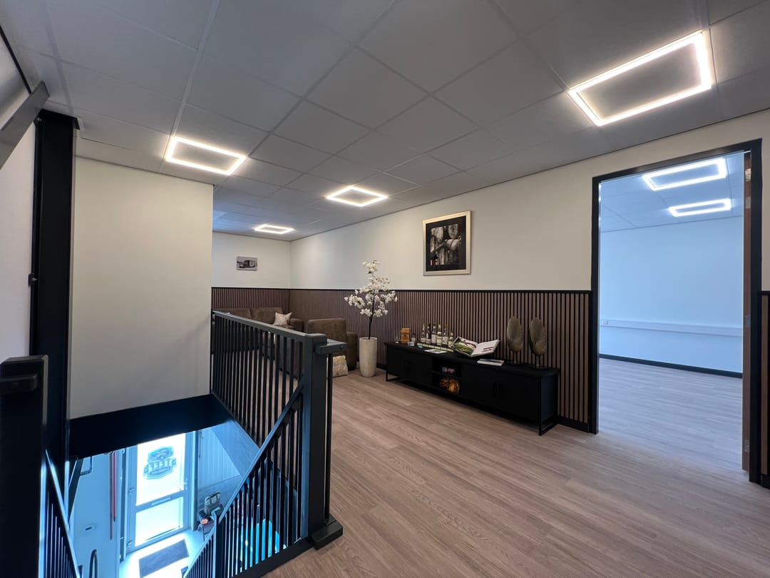 Moderne, luxe afgebouwde kantoorruimte van ca. 34 m² gelegen op de verdieping van een nieuwbouw bedrijfsunit op bedrijventerrein Nijverwaard in Sliedrecht.