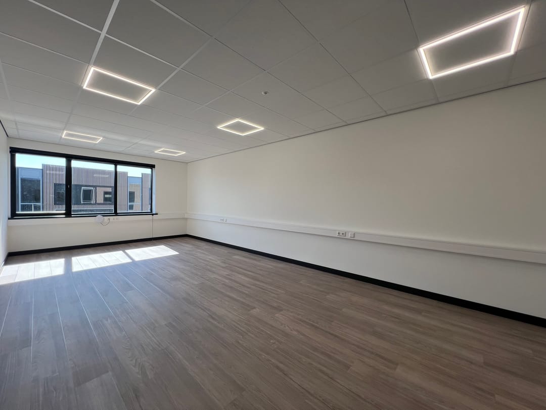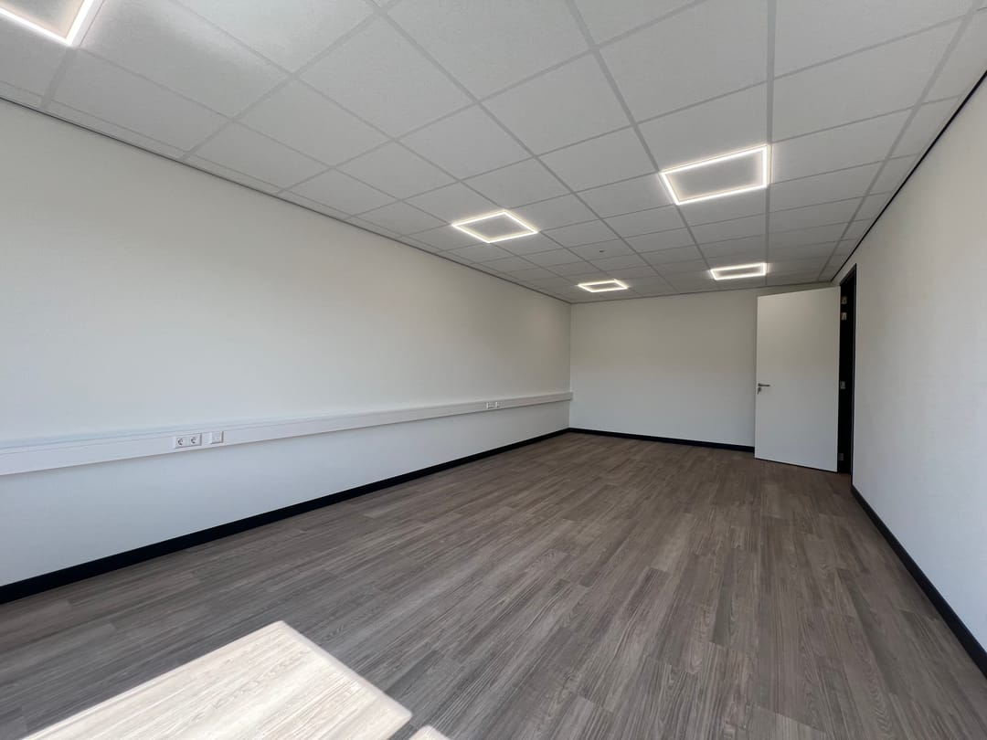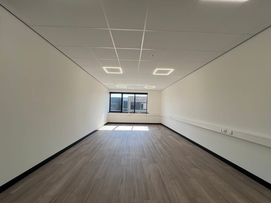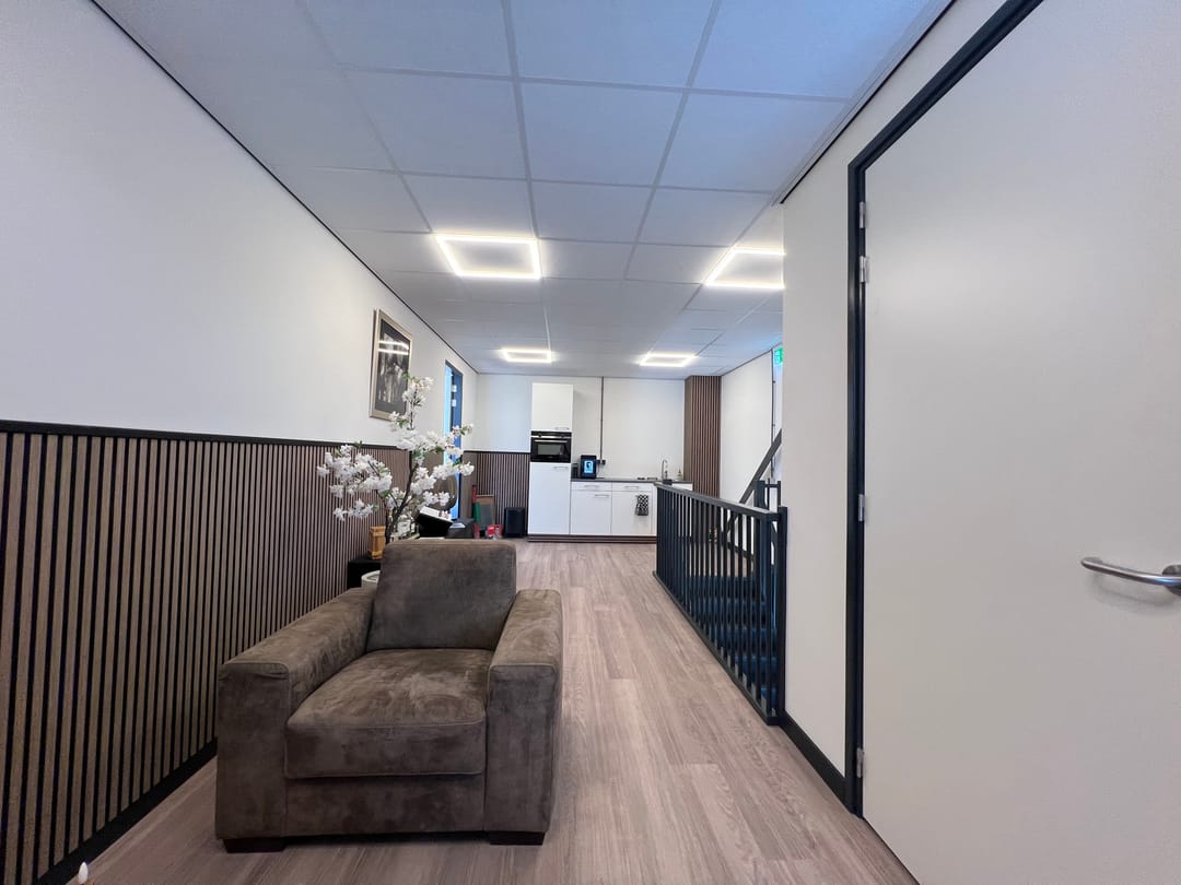 De kantoorruimte is toegankelijk door middel van een gezamenlijke entree op de begane grond. Op de verdieping bevinden zich een gedeelde ontvangstruimte van ca. 35 m² met pantry en een afsluitbaar kantoorcompartiment. Het kantoorcompartiment is o.a. voorzien van een systeemplafond met ledverlichting (3-traps dimbaar), een vrije hoogte van ca. 2,57 meter, een kabelgoot met data en elektra (glasvezel 100 MB), pvc-vloerafwerking, geïsoleerde en gesausde voorzetwanden, daglichttoetreding door middel van de te openen ramen, raamdecoratie en verwarming door middel van vloerverwarming via een warmtepomp.
