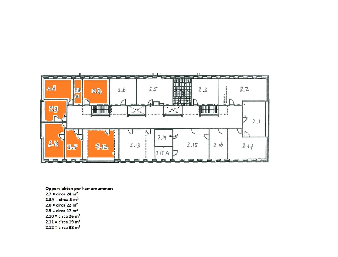 Totaal circa 200 m² inclusief een evenredig aandeel in de algemene ruimten. De kantoorruimte is verdeeld over in totaal 7 kantoorkamers. Optioneel zouden er 2 extra kantoorkamers kunnen worden bijgehuurd.