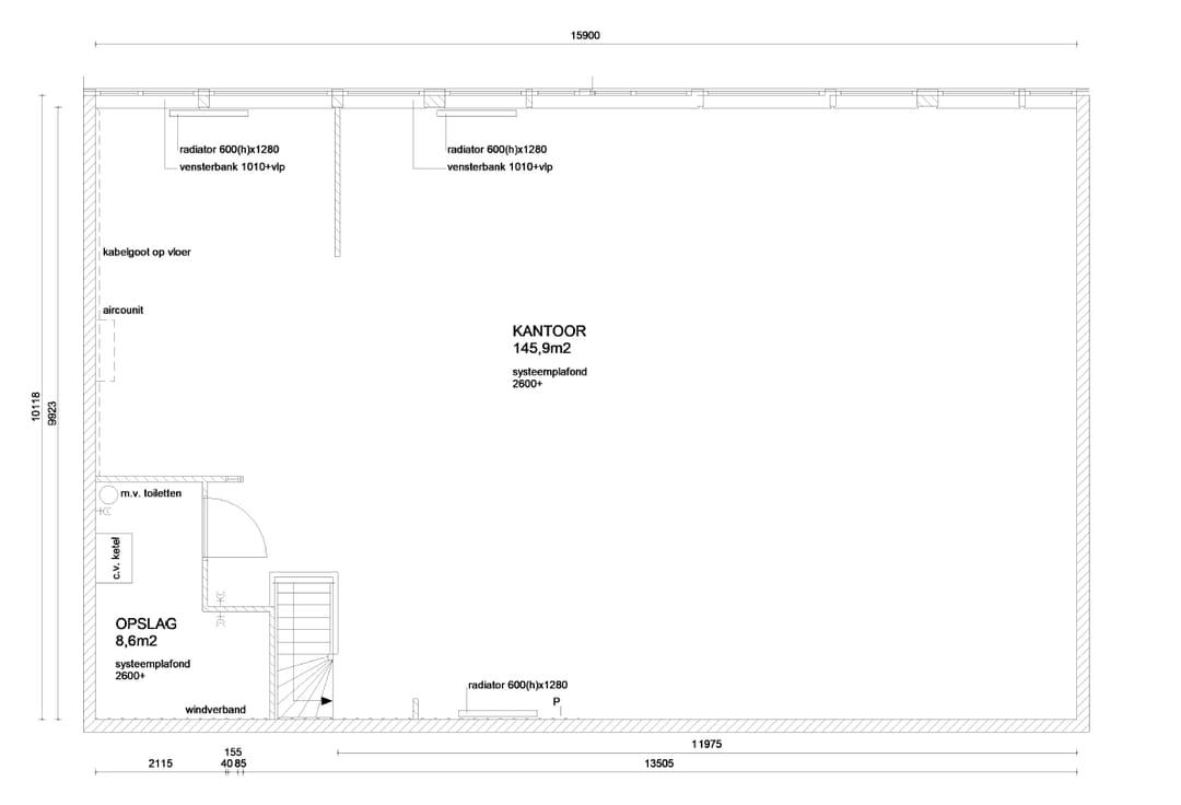 - Circa 150 m² kantoorruimte gelegen op de verdieping + circa 9 m² archiefruimte;