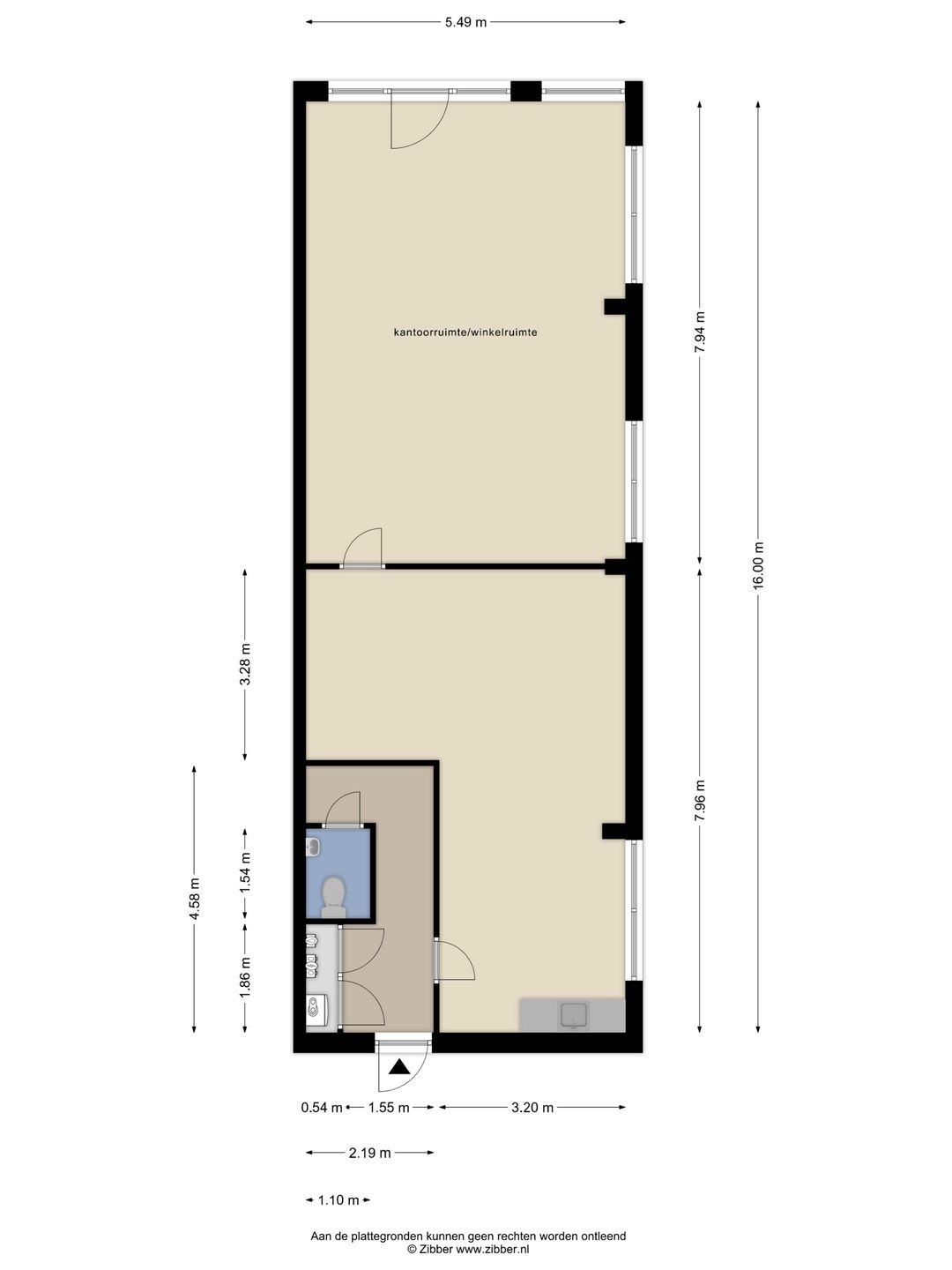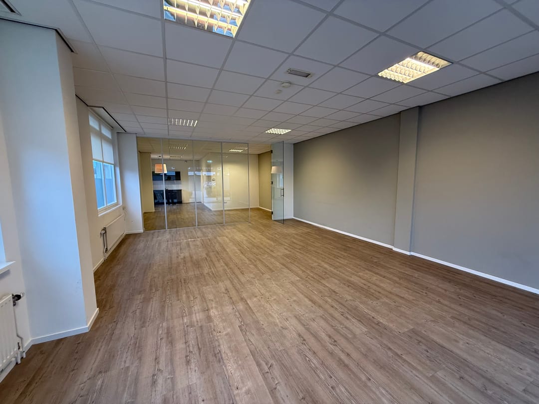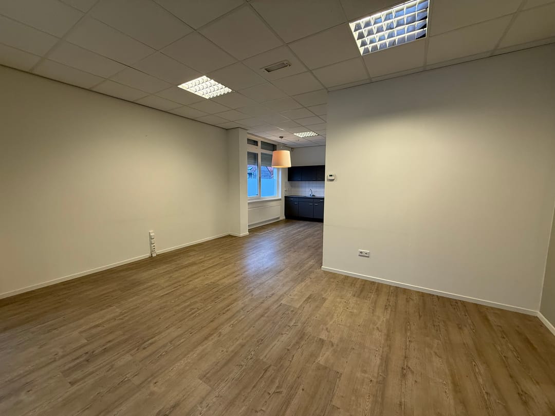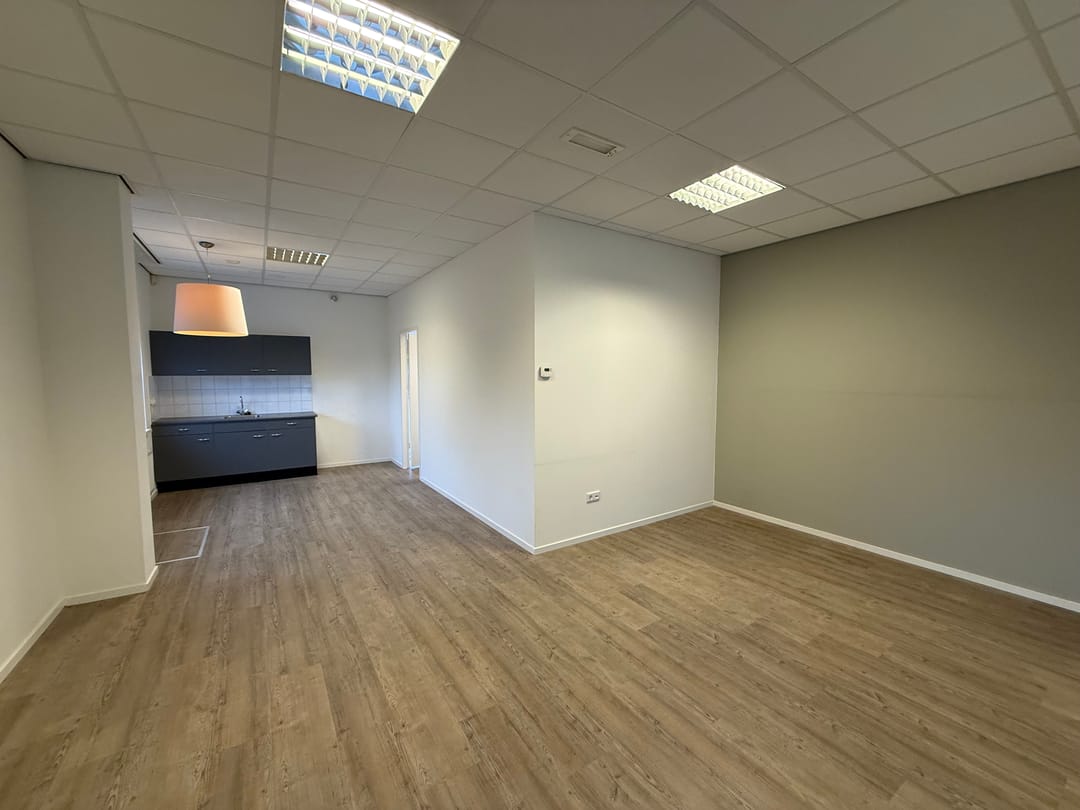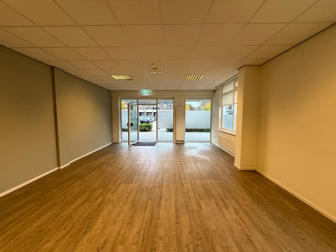 Entree, open kantoor/winkelruimte welke is opgesplitst middels een glazen wand, pantry, toilet en achteringang naar parkeerterrein.