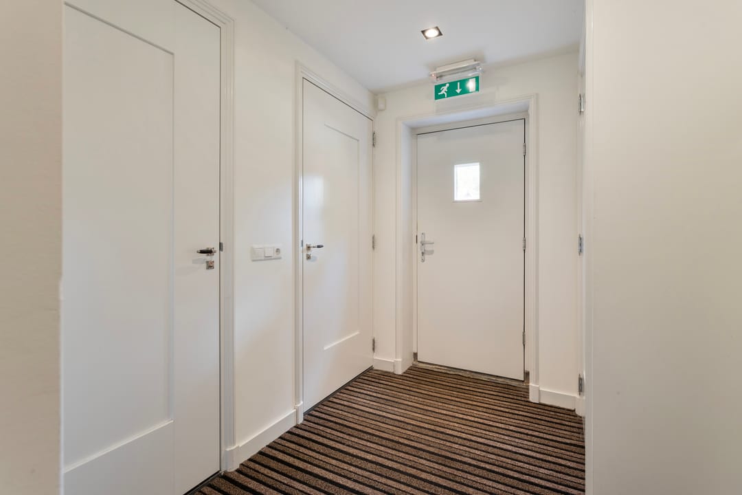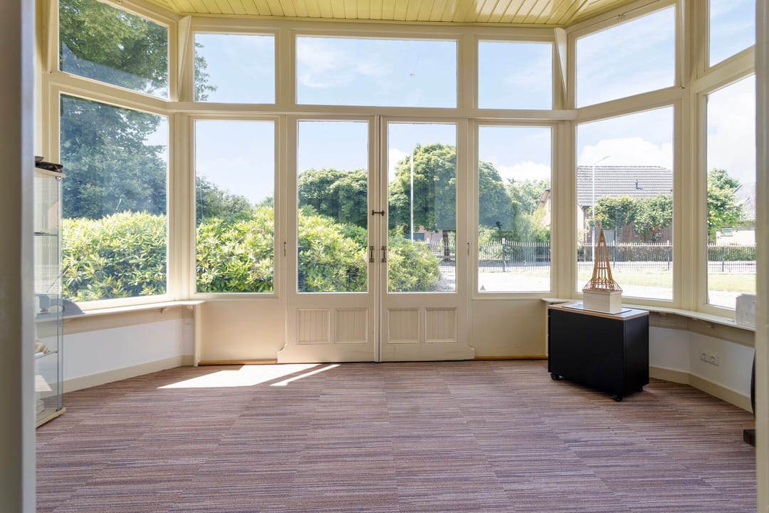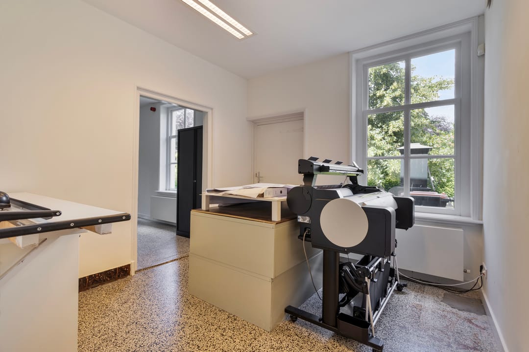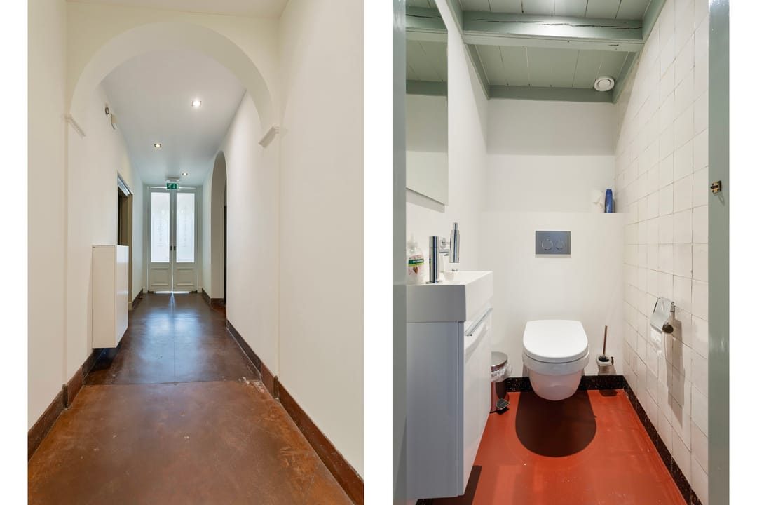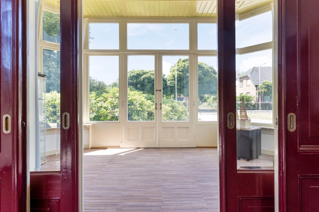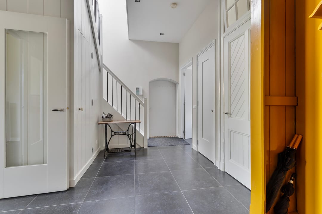 Indeling voorzijde, de voormalige notariswoning: entree, vestibule, hal marmeren vloeren. woon-, werkkamer met schouw en fraai rijk gedecoreerd stucplafond, zomer- en winterdeuren naar de aangebouwde serre met originele oude wandtegels. Een tweede woon- werkkamer aan de voorzijde met doorloop naar de voormalige keuken met granito vloer en oude schouw, hal met twee separate toiletten en zijentree. Toegang tot de praktische kelder. met opstelplaats voor de warmtepomp. Aan de andere zijde van de woning zijn ruime werkkamers waarvan twee met oude openslaande deuren naar de tuin. Het betreffen onder andere de voormalige werkkamers van de notarisklerk en het kantoor van de notaris. Er zijn diverse nog originele vaste kasten en fraaie oude schouwen.