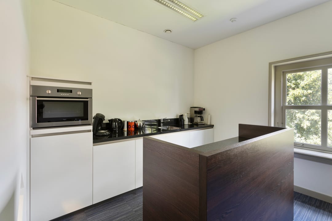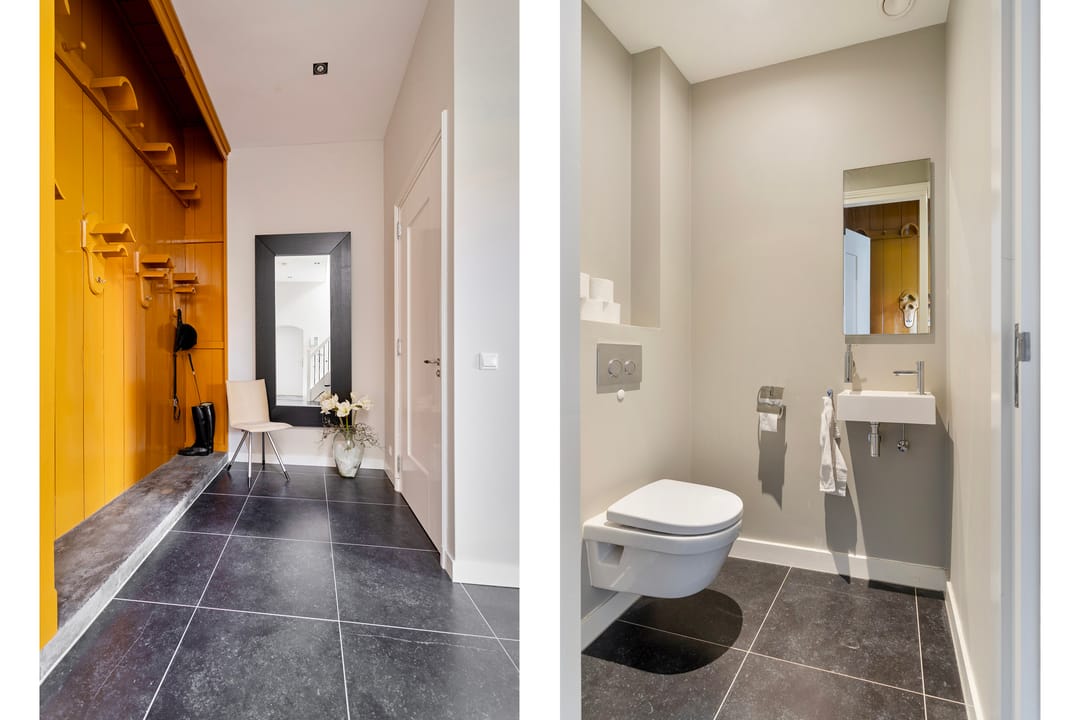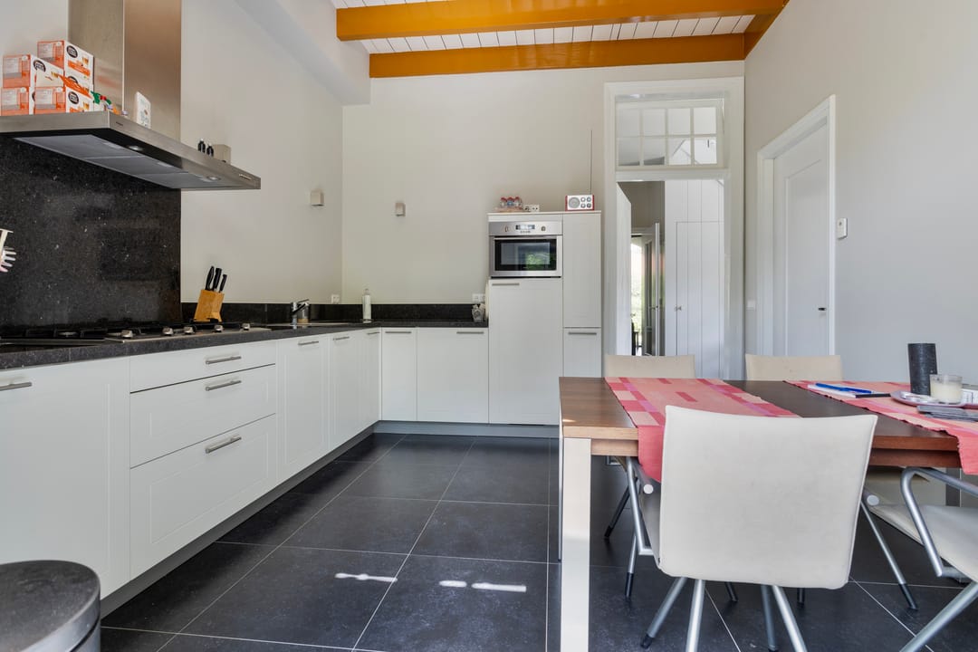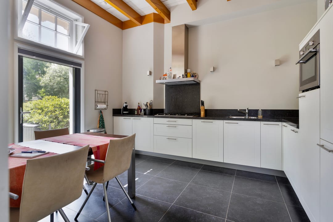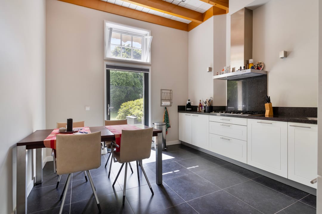 entree, ruime hal met de nog originele tuigkast thans in gebruik als garderobe, toilet met inbouwreservoir en fontein. Toegang tot de voormalige koetsruimte welke thans in gebruik is als ruime en lichte woonkamer met fraai hoog plafond en een mooie oude balkconstructie nog in het zicht. De woonkamer is voorzien van vloerverwarming en koeling. De nog originele deuren van het koetshuis staan open en zorgen voor veel lichtinval en bieden zicht op de tuin. Op de plek van de oorspronkelijke paardenstallen is een woonkeuken gerealiseerd. De gezellige keuken heeft een tuindeur naar het terras en de zij-tuin. De goede en moderne inrichting. De keukeninrichting is geplaatst in een hoekopstelling en onder andere voorzien van een gaskookplaat met rvs afzuigschouw, combimagnetron, koelkast en vaatwasmachine. Daarnaast is er een bijkeuken met opstalplaats voor apparatuur zoals wasmachine en droger.