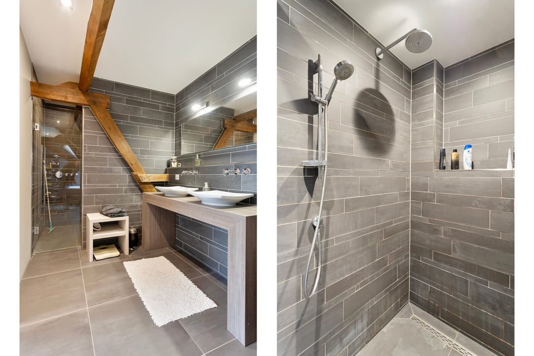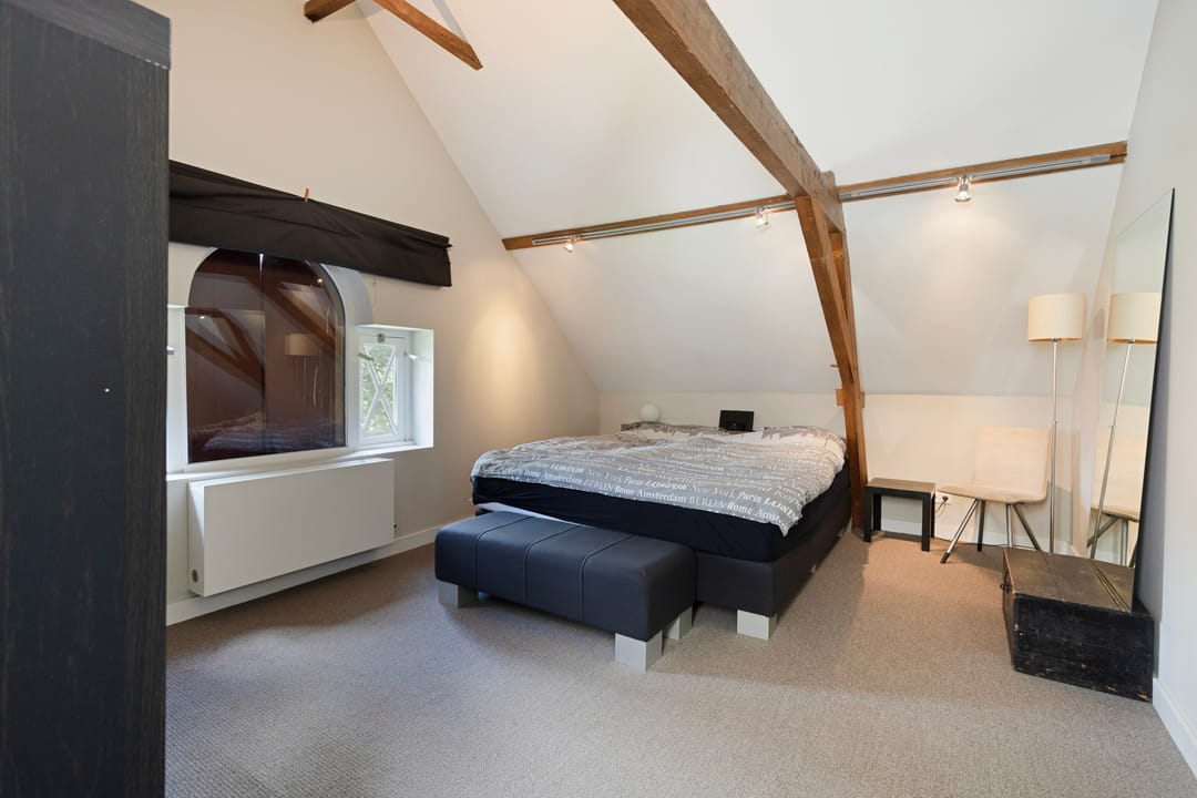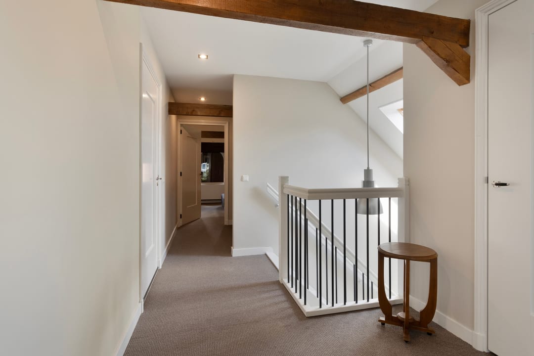 Vaste trap naar de eerste verdieping met overloop en drie ruime slaapkamers. Fraaie en luxe badkamer met douchehoek met stortdouche, ligbad, wandcloset en badmeubel. De badkamer is voorzien van vloerverwarming.
