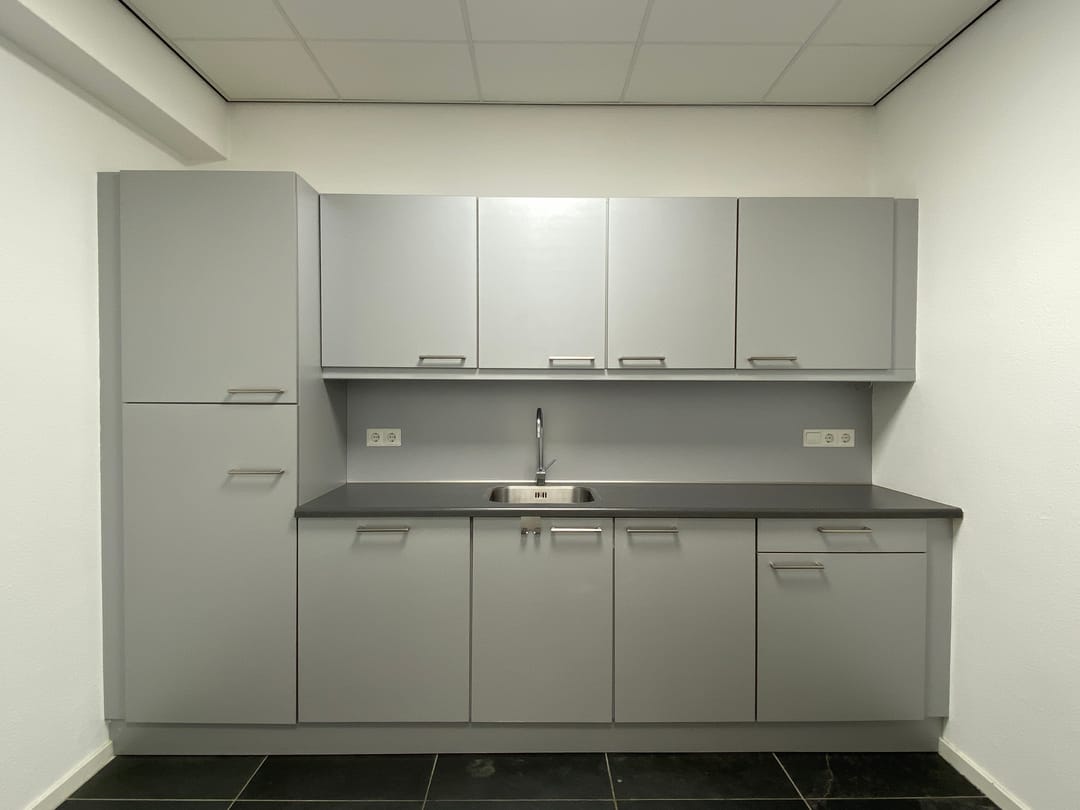 Entree naar centrale hal met binnenberging, meterkasten en trapopgang. Vanuit de centrale hal toegang tot de kantoorunits. Het betreft hier een zelfstandige kantoorunit voorzien van een keuken met inbouwkeuken, garderobe kast en twee toiletten.