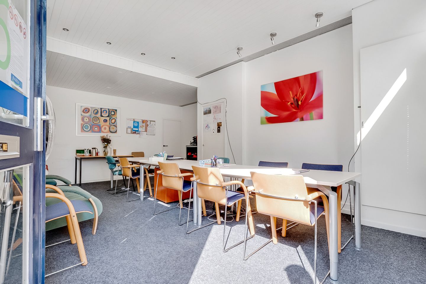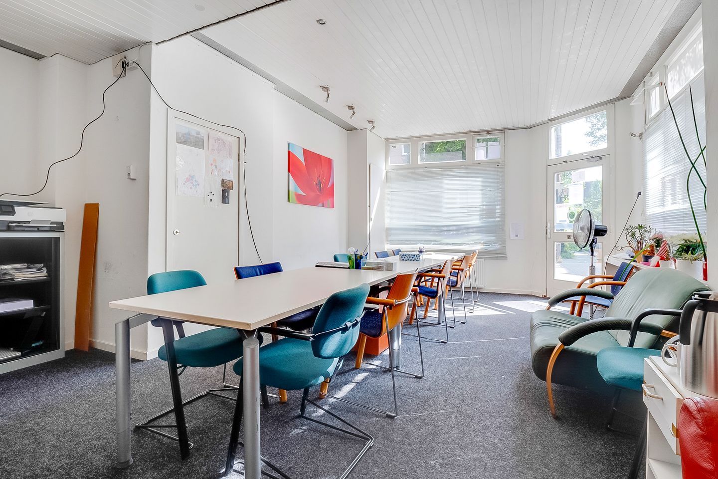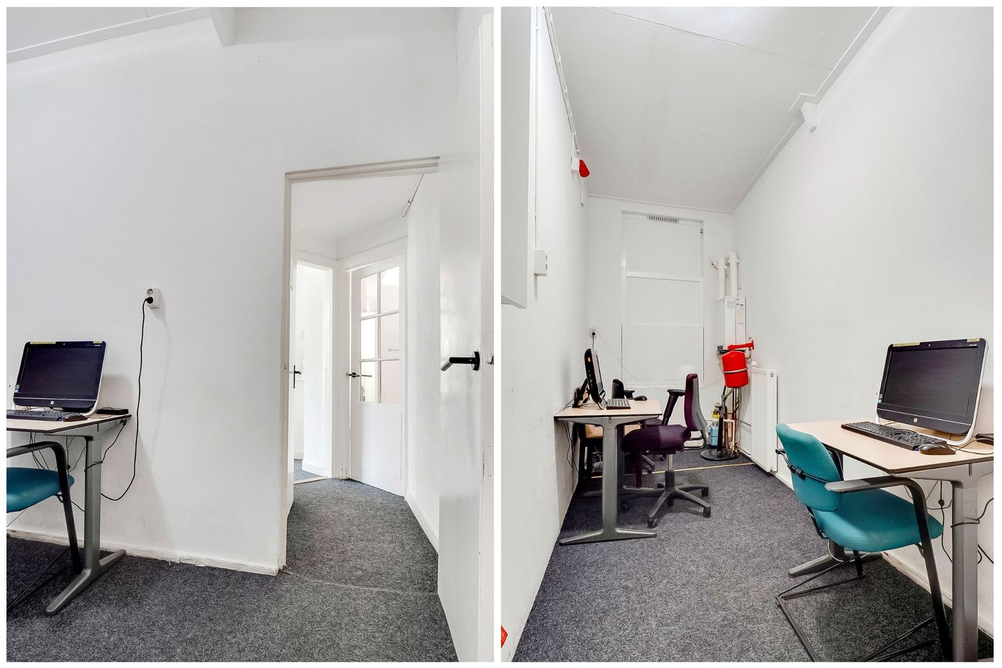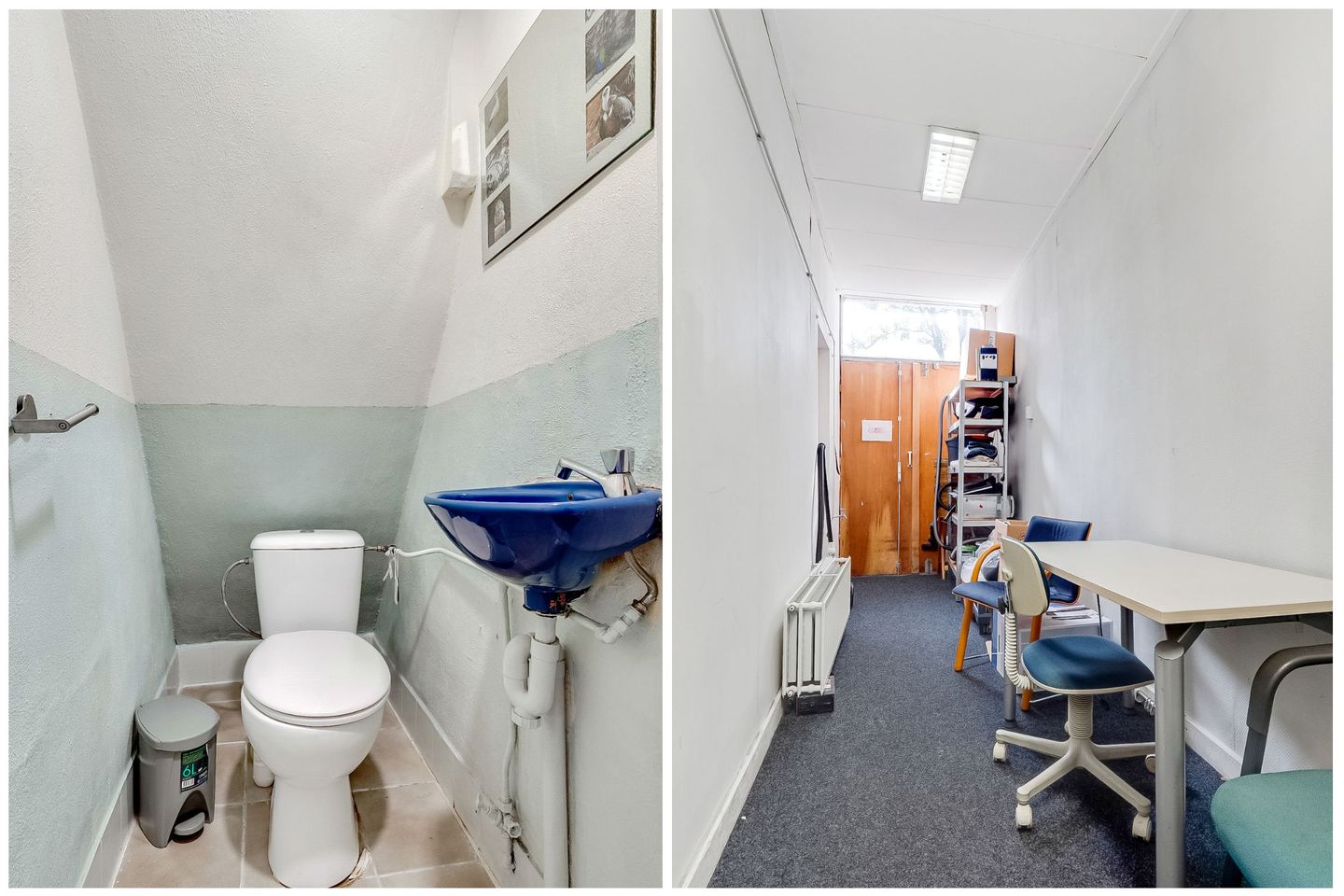 Entree met kantoorruimte, doorloop naar 2 werkruimtes, toilet, pantry en grote bergruimte met een openslaande toegangsdeuren naar de straat.