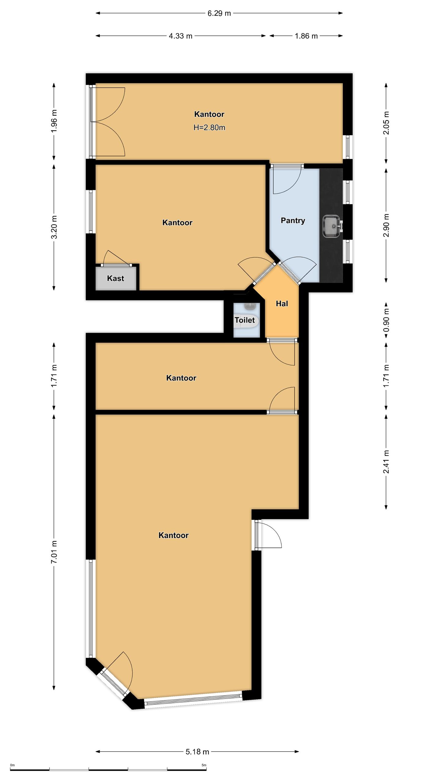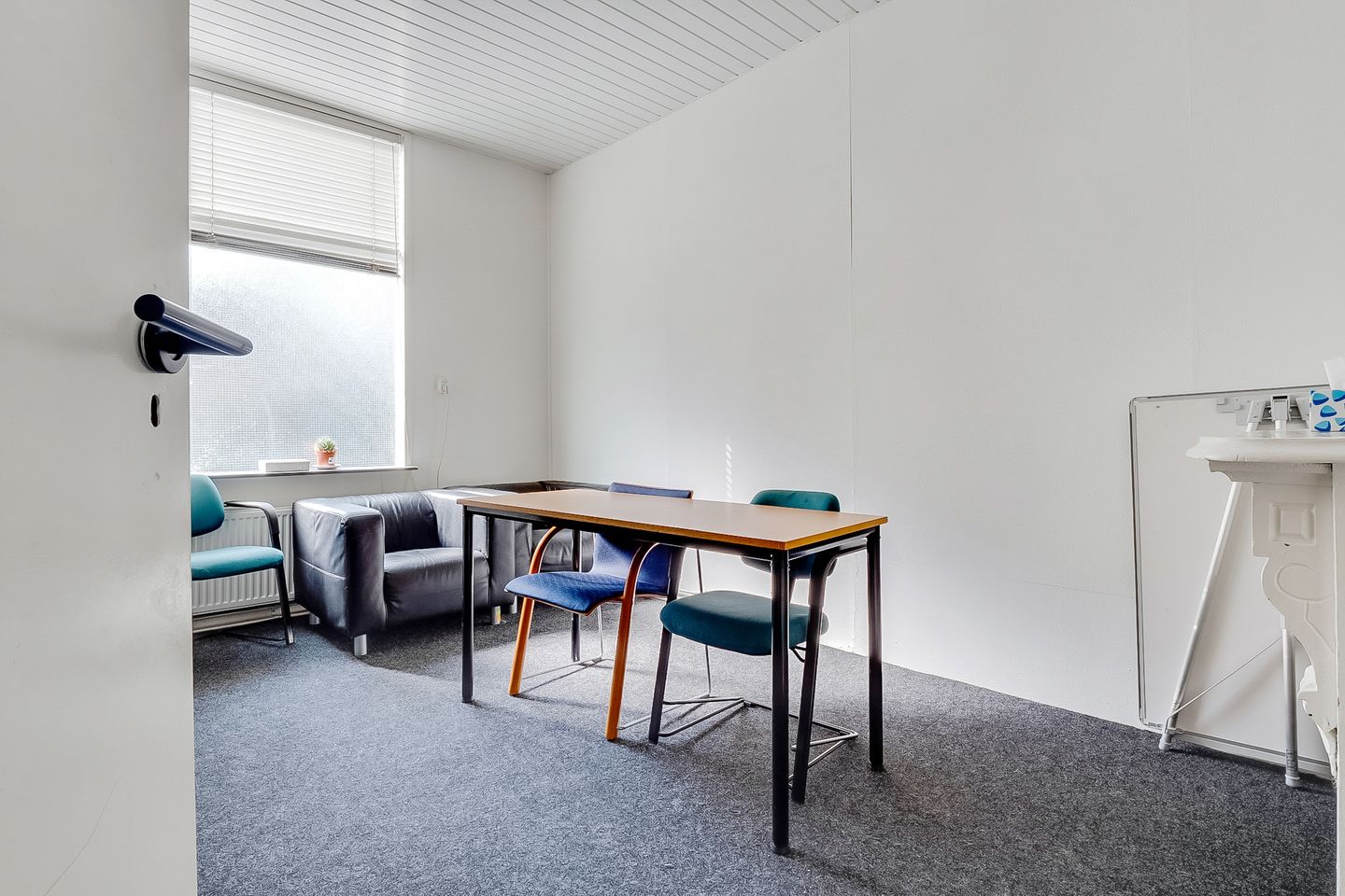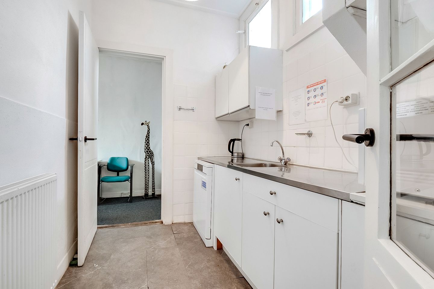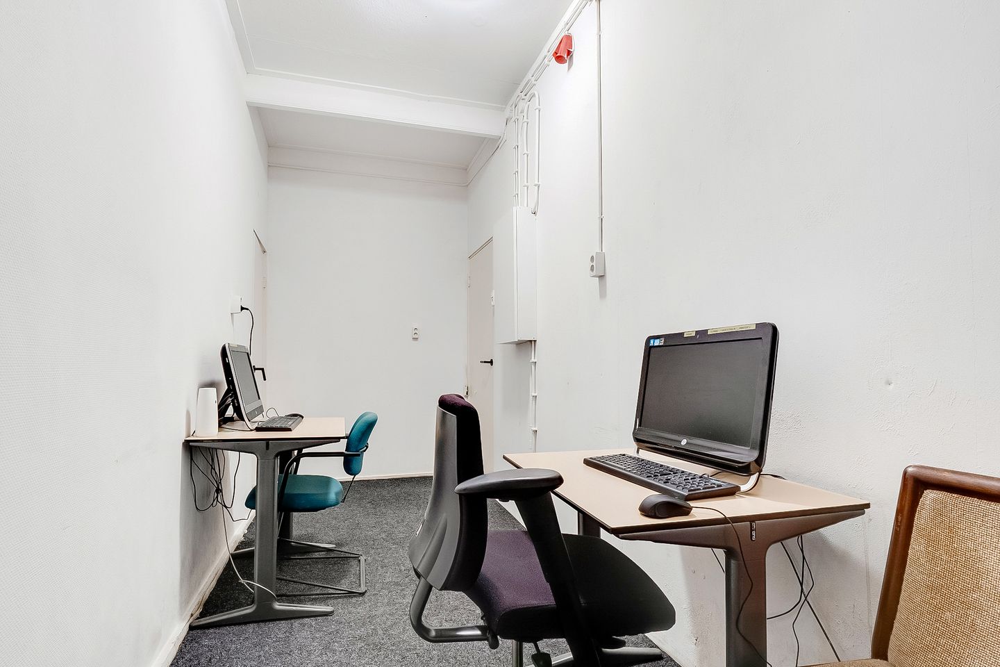 Entree met kantoorruimte, doorloop naar 2 werkruimtes, toilet, pantry en grote bergruimte met een openslaande toegangsdeuren naar de straat.