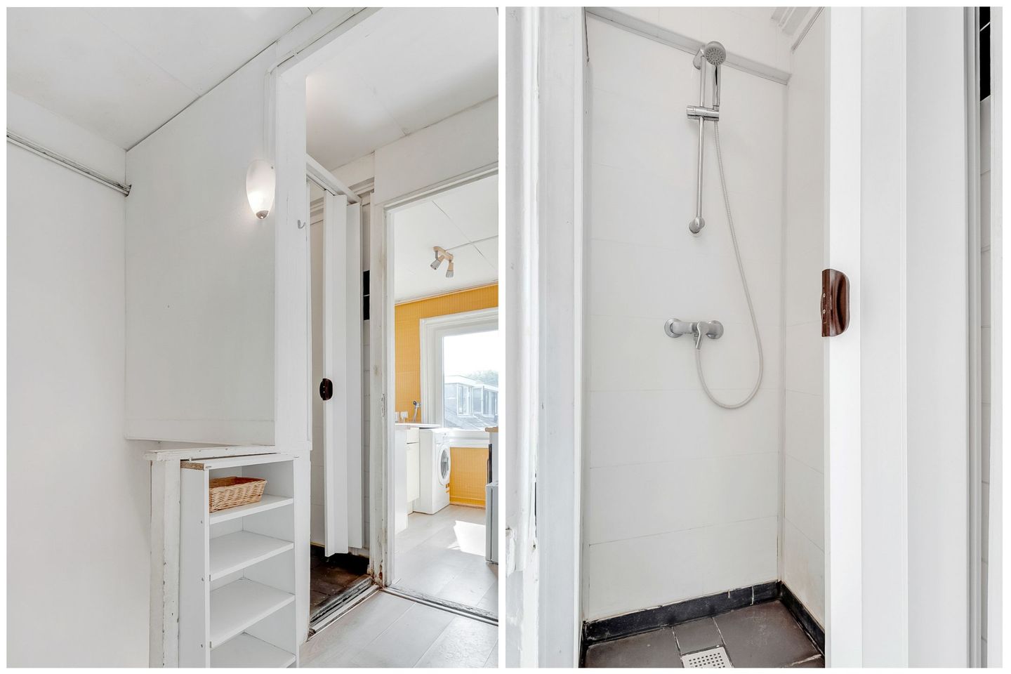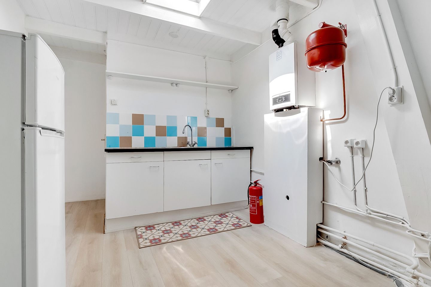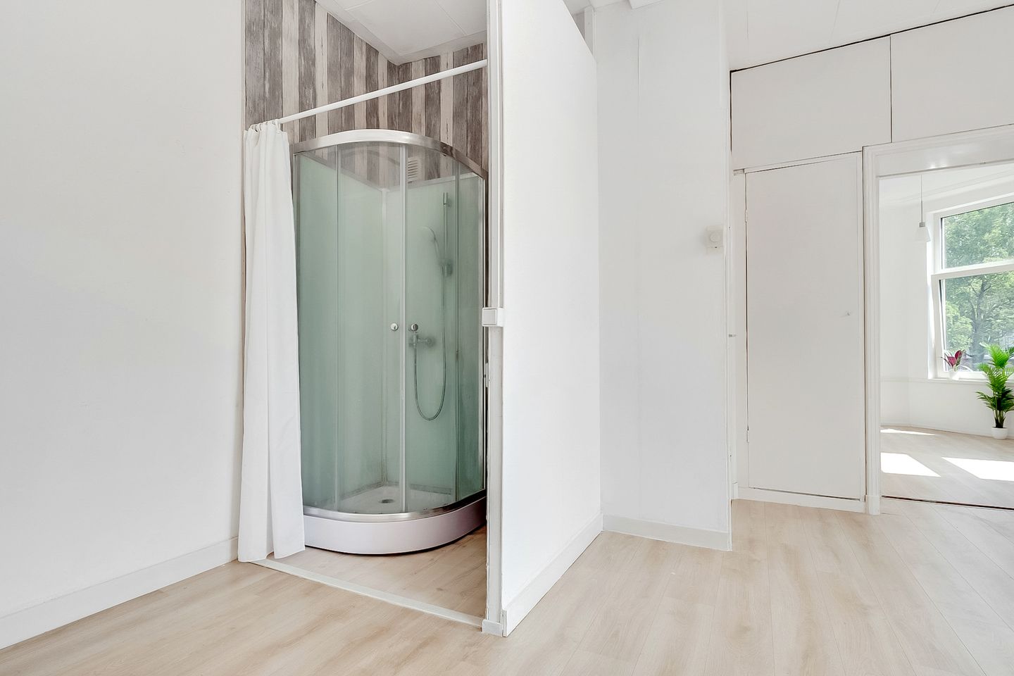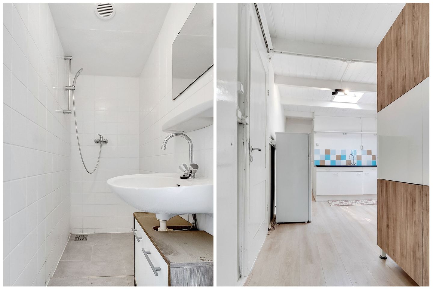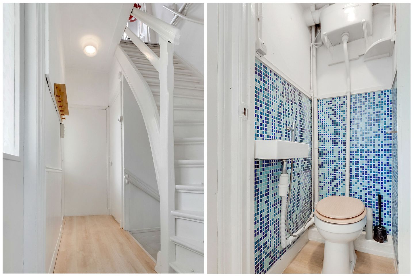 Eerste verdieping: overloop met toilet en toegang tot een eenvoudige keuken. Woonkamer met voor- en achterkamer en vaste kastruimte. Vanuit de achterkamer toegang tot een eenvoudige badkamer met douche en wastafel.