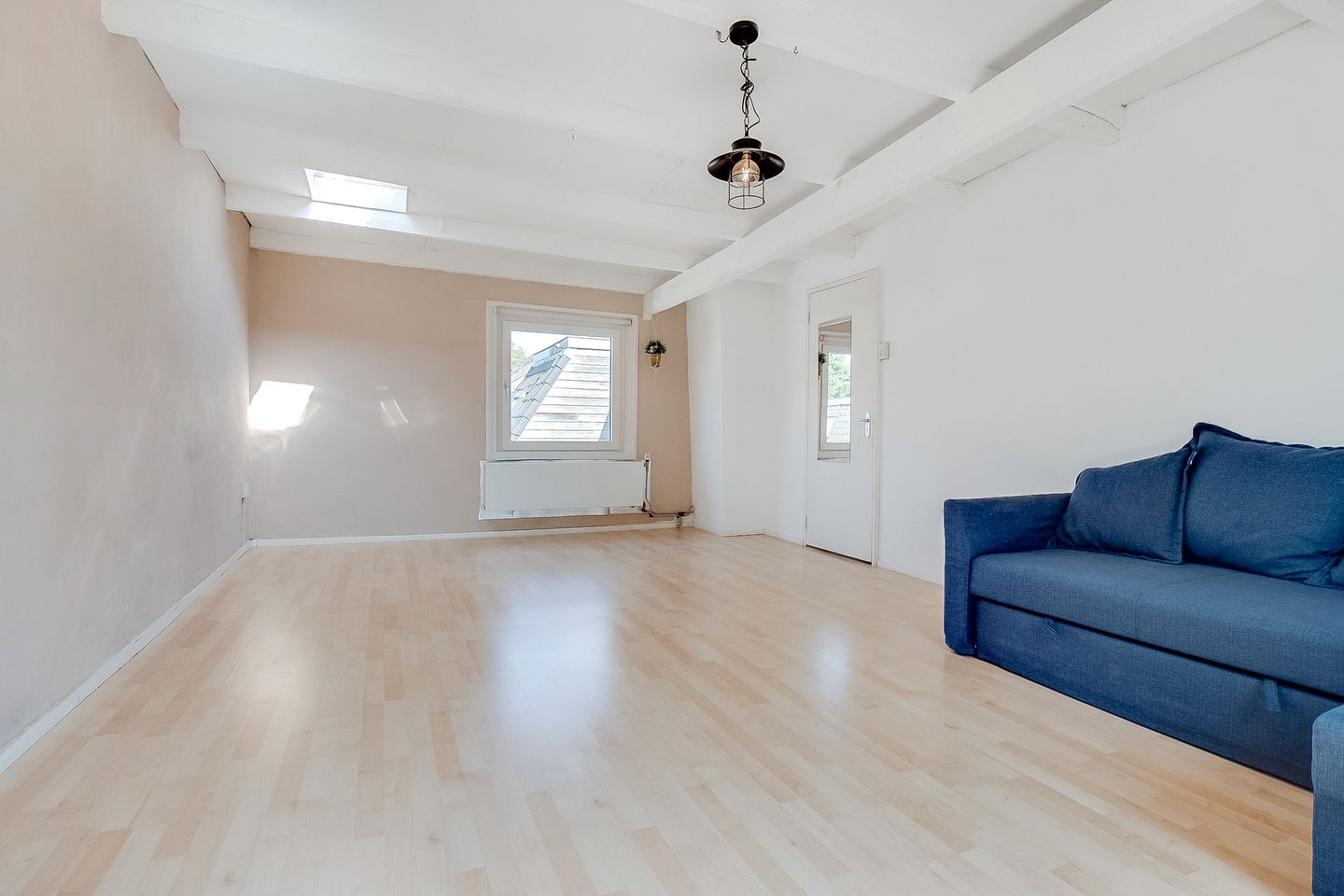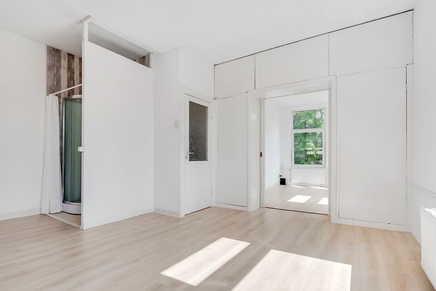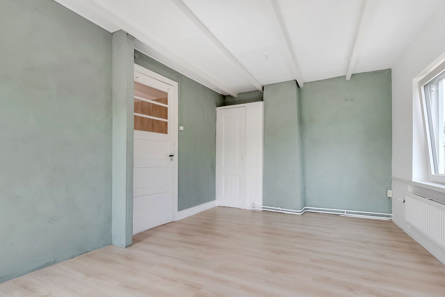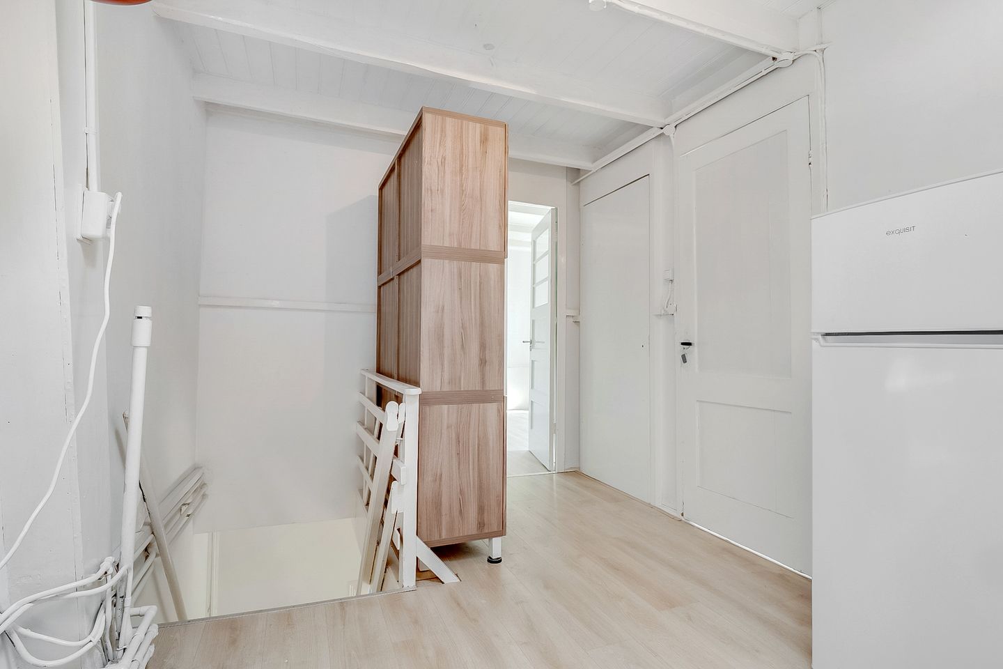Eerste verdieping: overloop met toilet en toegang tot een eenvoudige keuken. Woonkamer met voor- en achterkamer en vaste kastruimte. Vanuit de achterkamer toegang tot een eenvoudige badkamer met douche en wastafel.