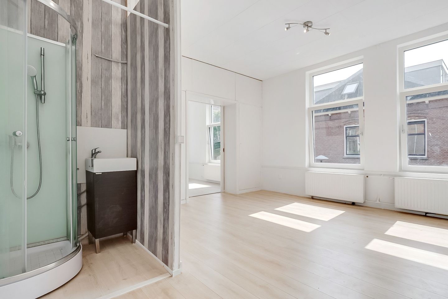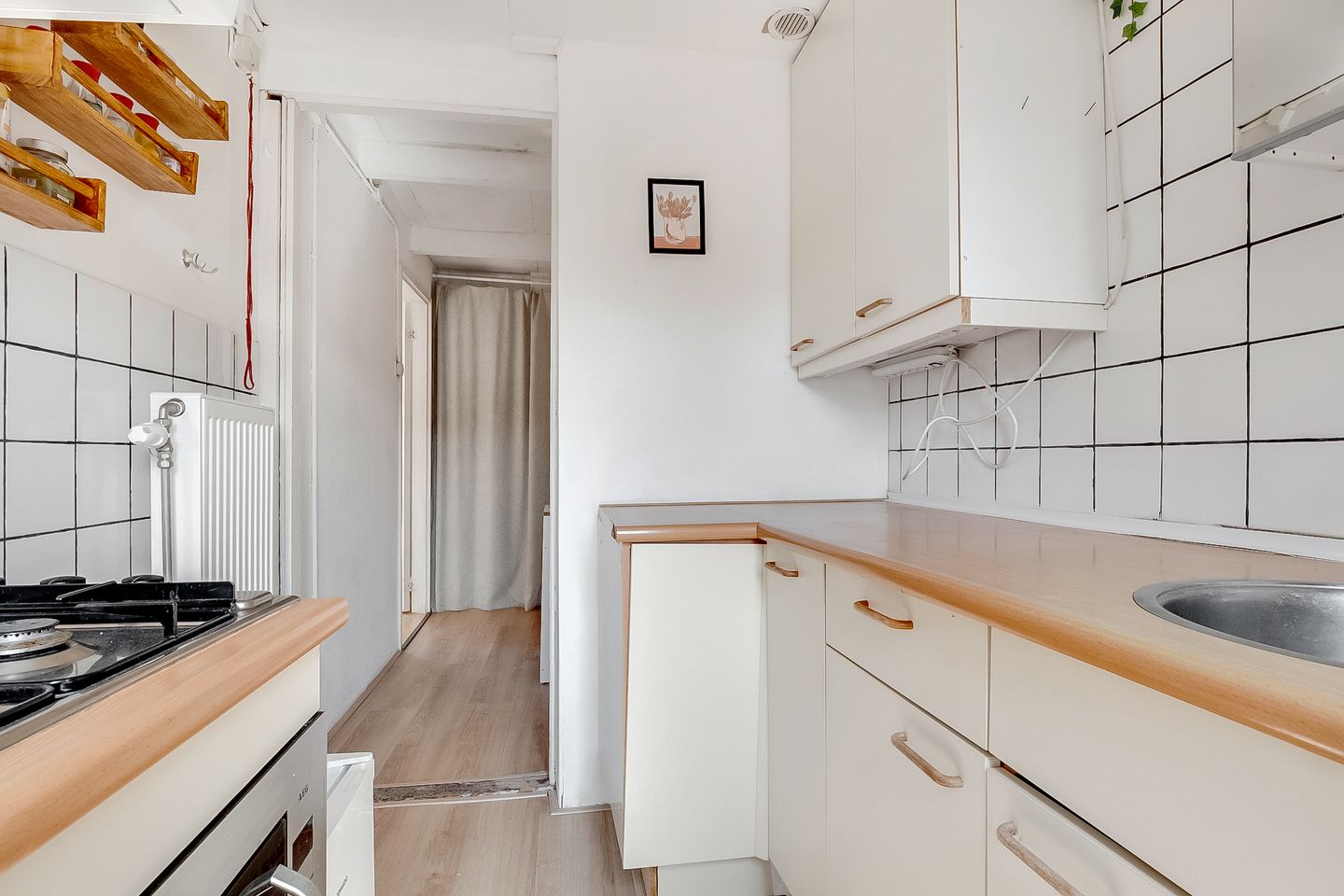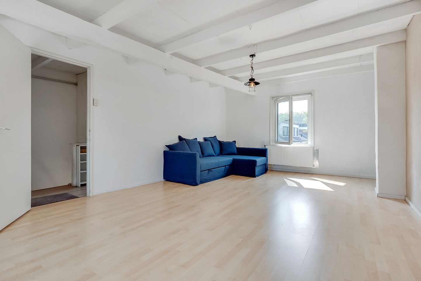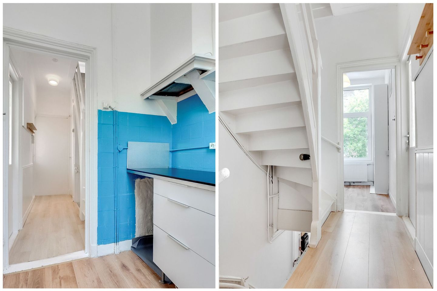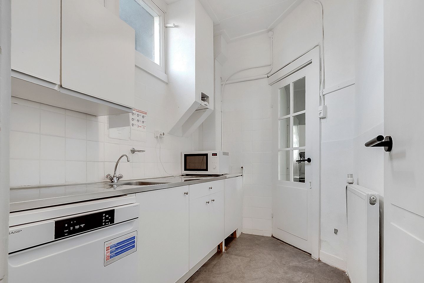 Eerste verdieping: overloop met toilet en toegang tot een eenvoudige keuken. Woonkamer met voor- en achterkamer en vaste kastruimte. Vanuit de achterkamer toegang tot een eenvoudige badkamer met douche en wastafel.