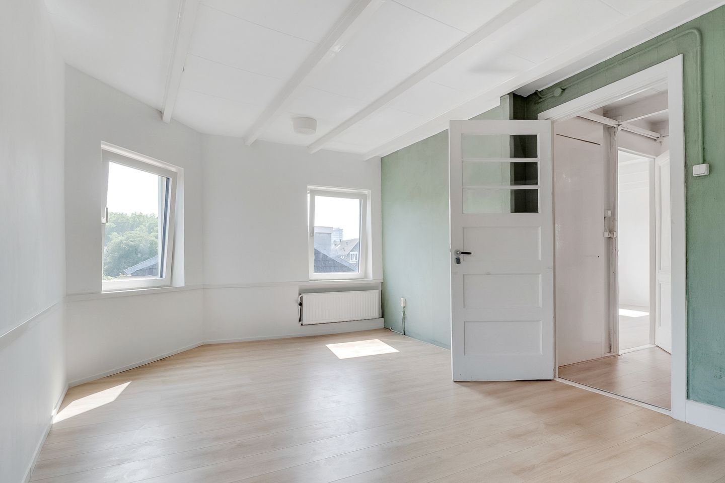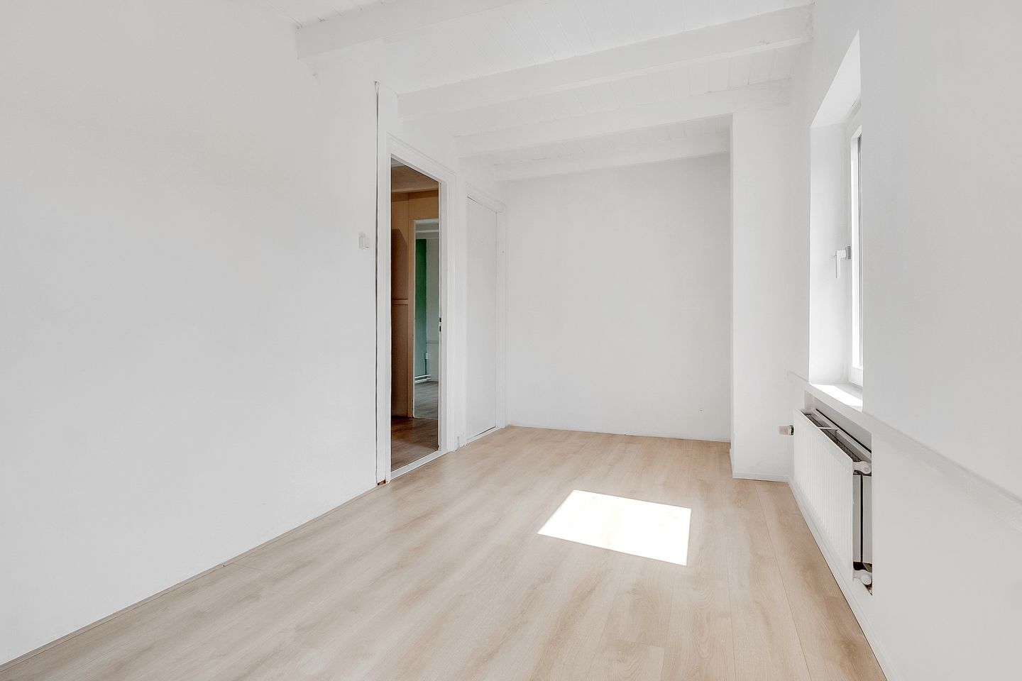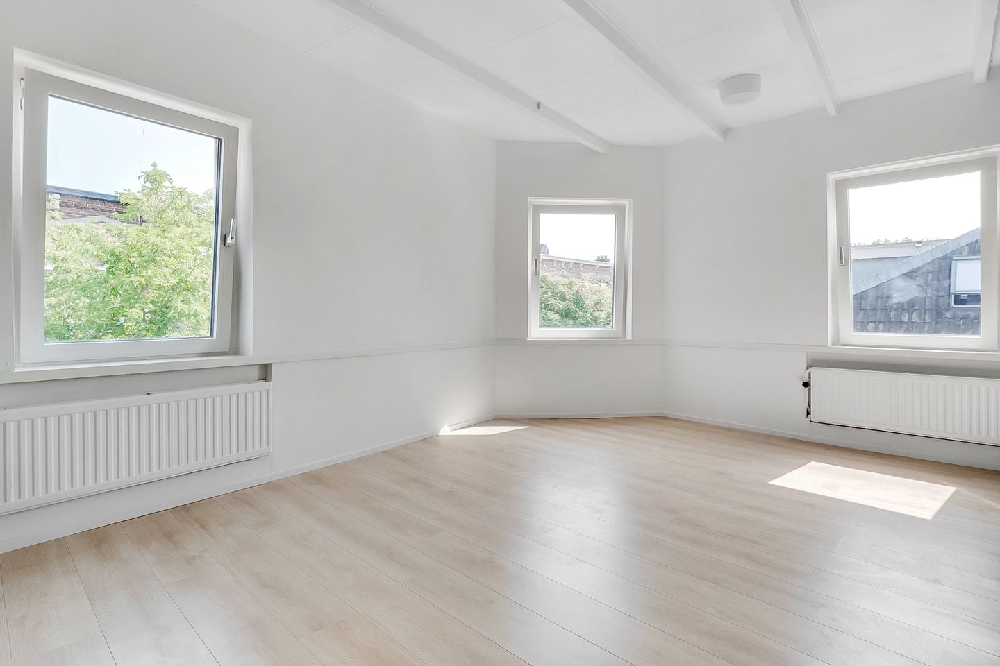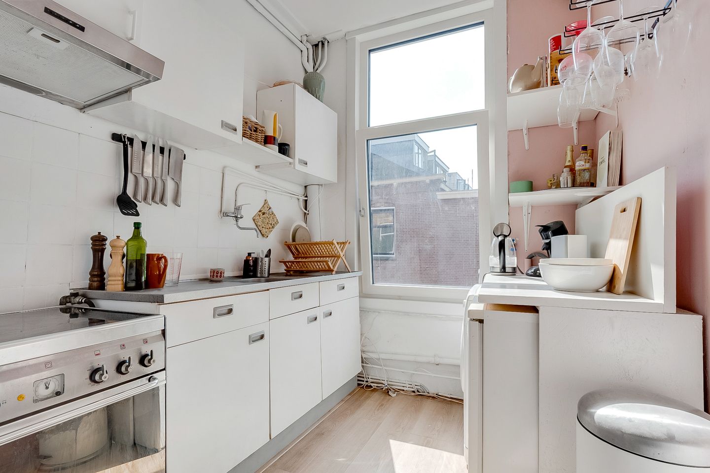 Eerste verdieping: overloop met toilet en toegang tot een eenvoudige keuken. Woonkamer met voor- en achterkamer en vaste kastruimte. Vanuit de achterkamer toegang tot een eenvoudige badkamer met douche en wastafel.