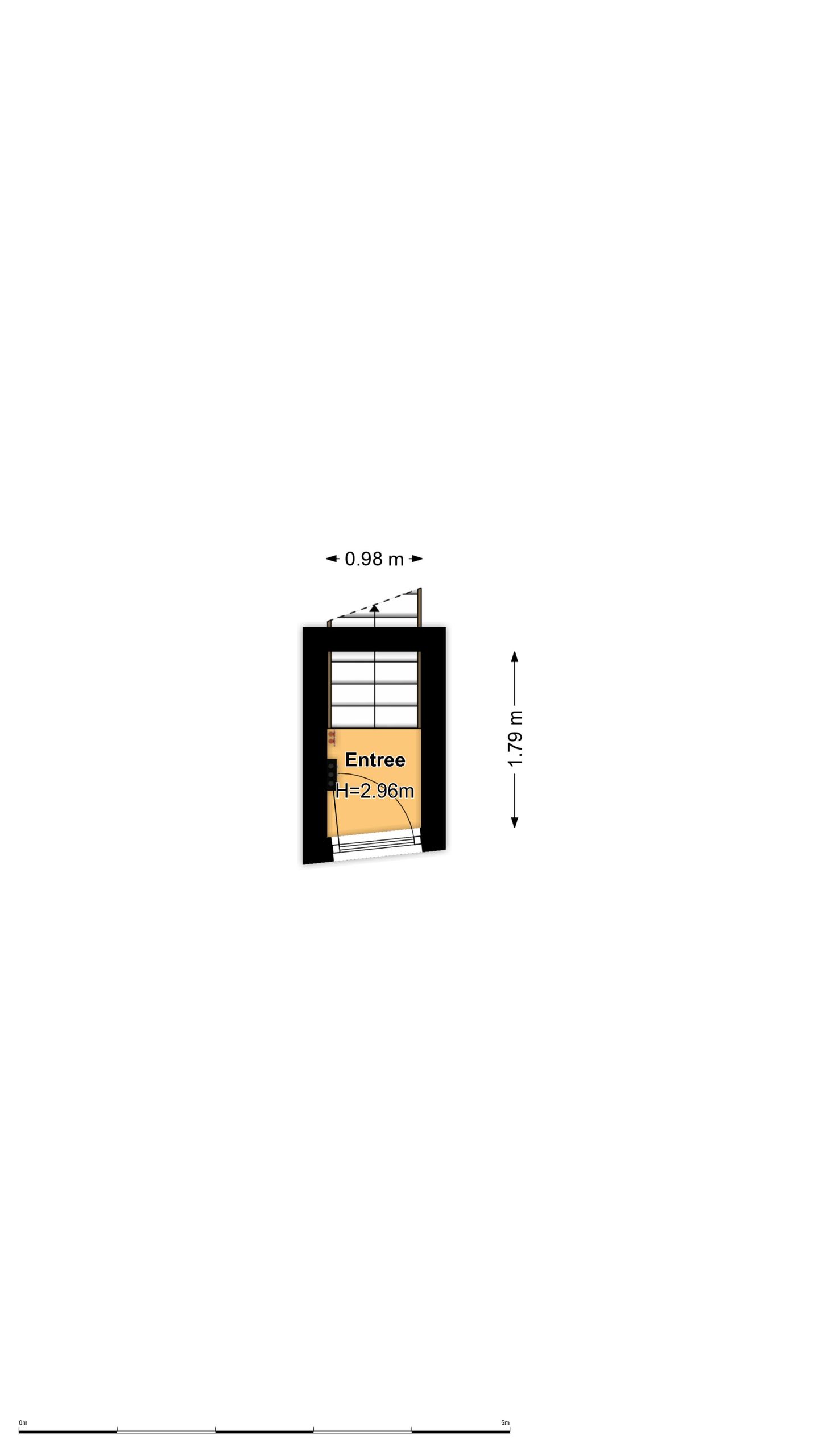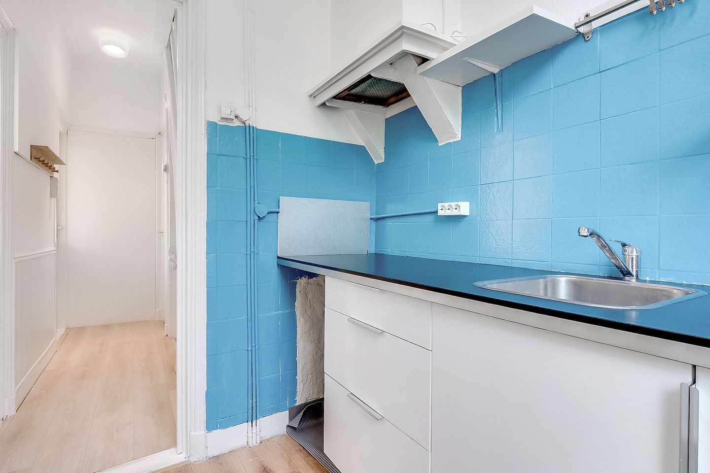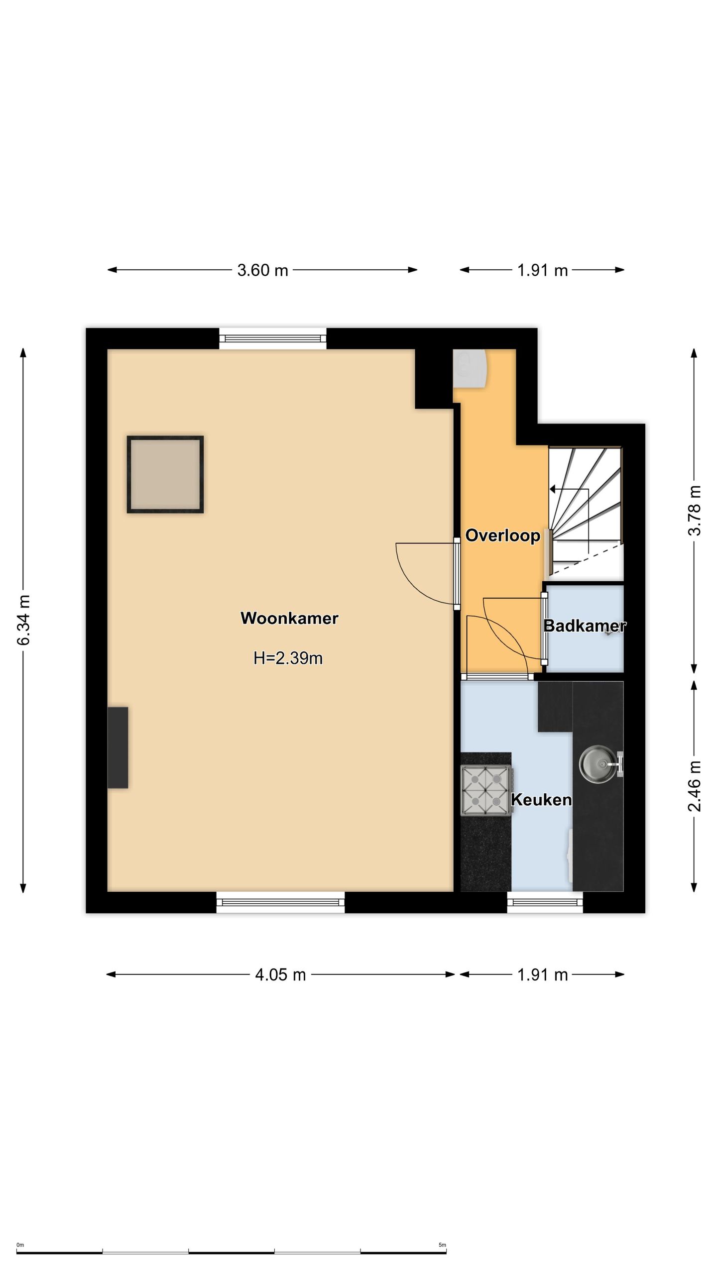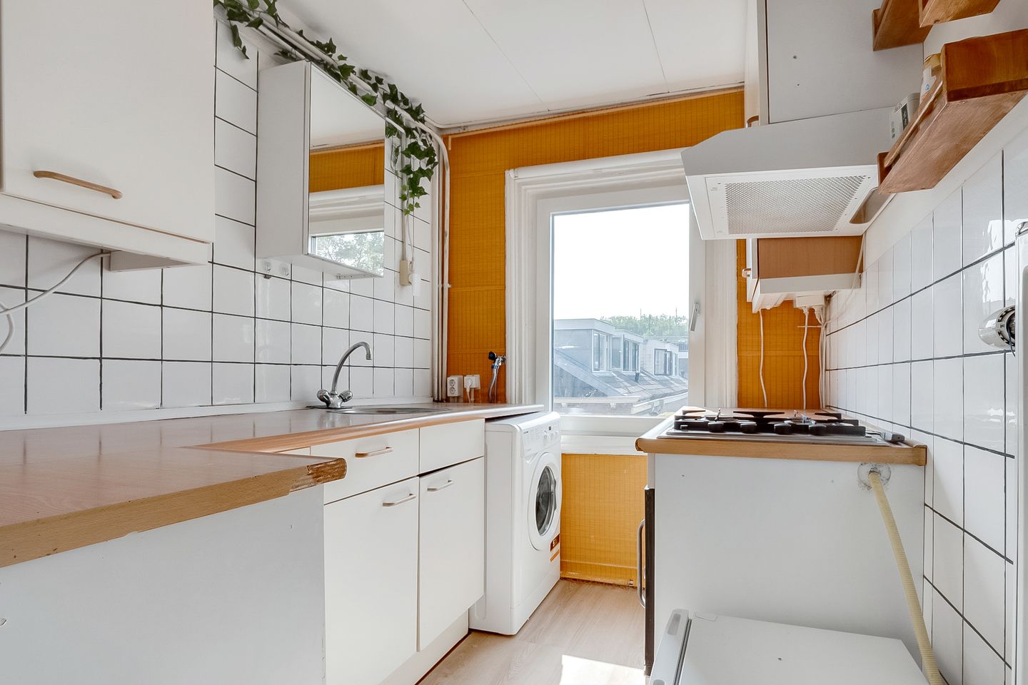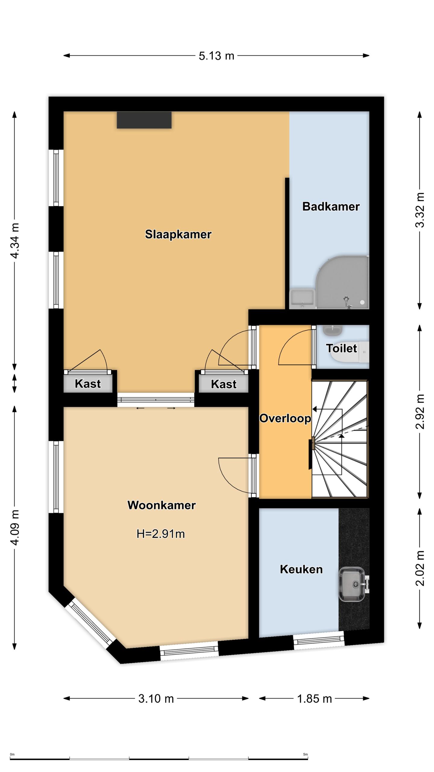 Eerste verdieping: overloop met toilet en toegang tot een eenvoudige keuken. Woonkamer met voor- en achterkamer en vaste kastruimte. Vanuit de achterkamer toegang tot een eenvoudige badkamer met douche en wastafel.