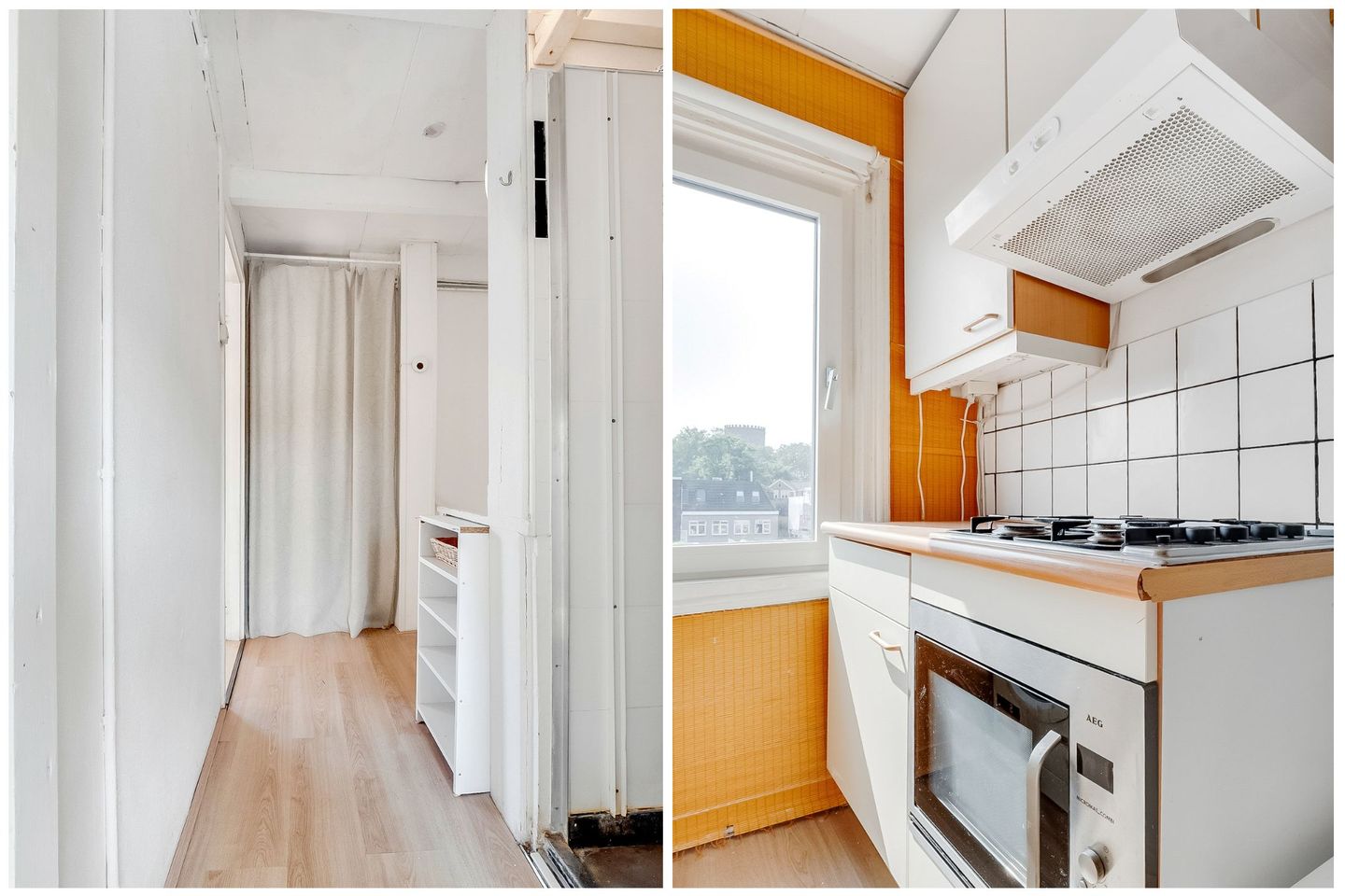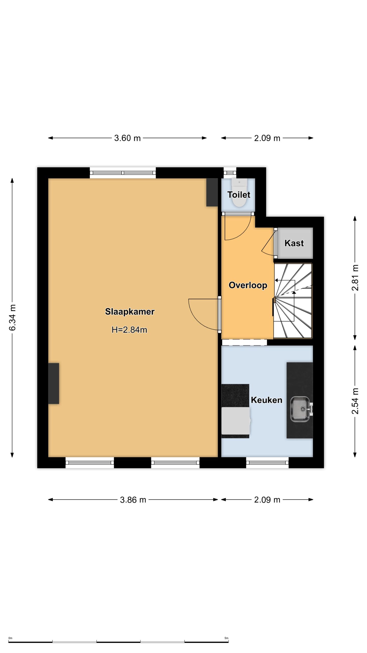 Eerste verdieping: overloop met vaste kast en toilet, eenvoudige keuken en woonkamer.