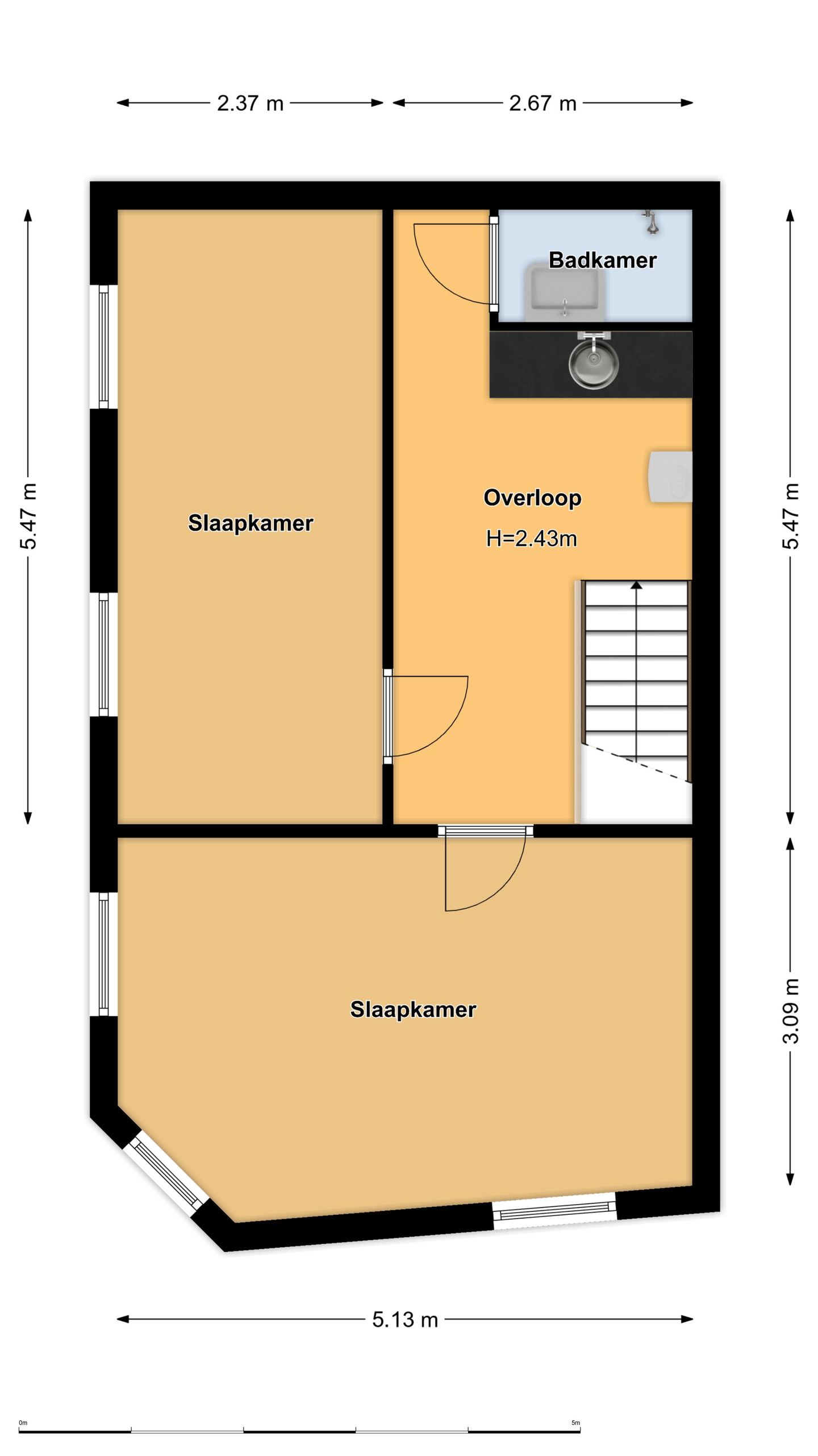 Tweede verdieping: ruime overloop, eenvoudige badkamer en twee ruime slaapkamers.
