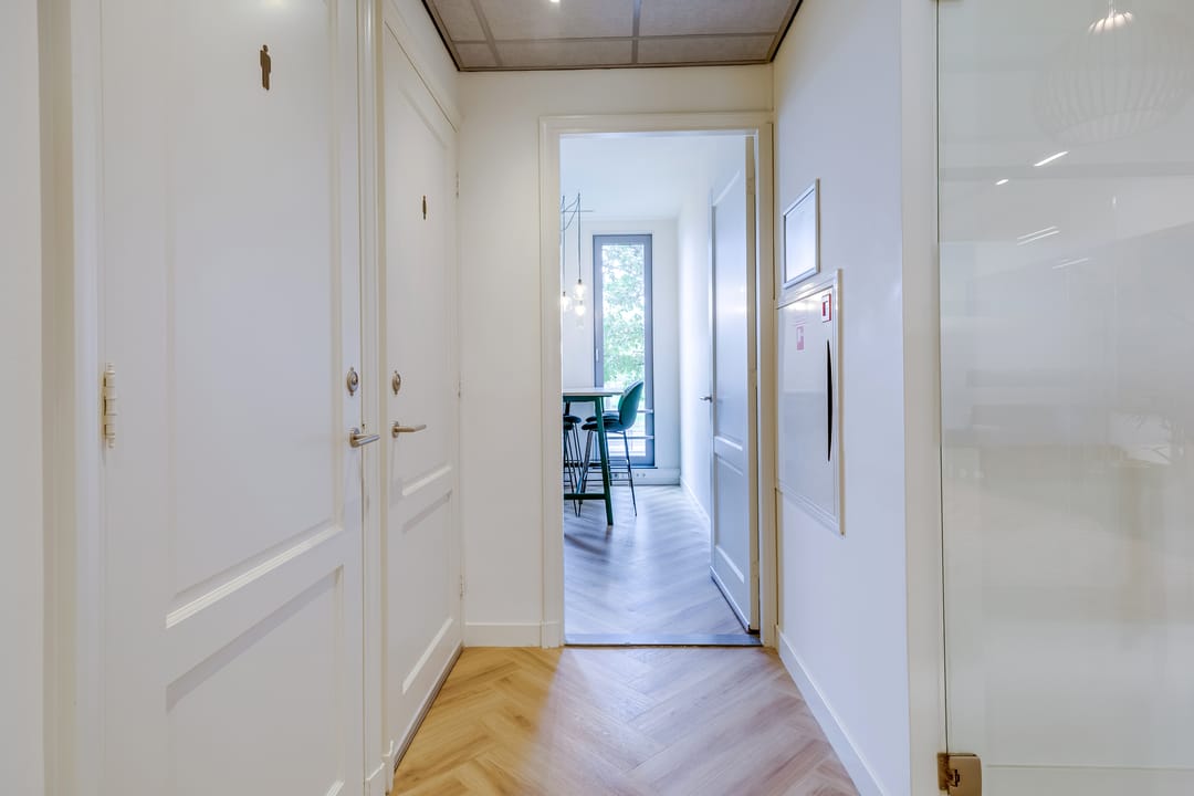 - huidig glad gestuukte metalstud-wanden met een glazen schuifdeur, glastoegangsdeur en xerdiepingshoge paneeldeuren;