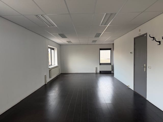 De etage is ca. 58 m2 BVO en is voorzien van een kleine keuken, zelfstandig toilet en een open werkruimte met bergkasten