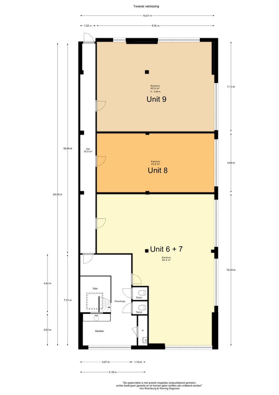 Deze kantoorruimte (samengevoegde units 6 en 7) is ruim opgezet en biedt veel mogelijkheden. De grote ramen aan 2 zijden maken de ruimte heerlijk licht en de airconditioning en cv-installatie zorgen voor een comfortabele werkplek. De kantoorruimte zelf is ca. 84m² VVO. Inclusief het aandeel gemeenschappelijke ruimte met pantry en 2 toiletten, betreft het ca. 103m² VVO.