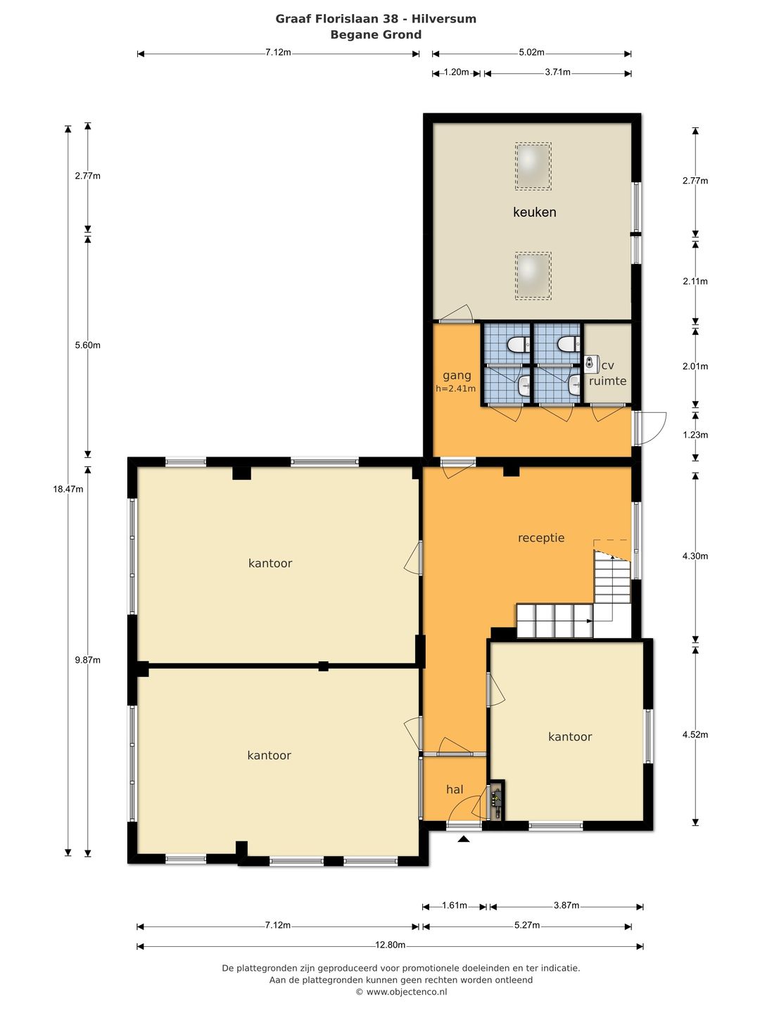 Ruime entreehal met hoofd- en zijingang, 3 lichte werkkamers in variërende grootte (waarvan 1 met airco), een toiletgroep en een royale lunchruimte voorzien van keukenblok met diverse inbouwapparatuur. Via openslaande deuren is er direct toegang tot het terras en het achterterrein.