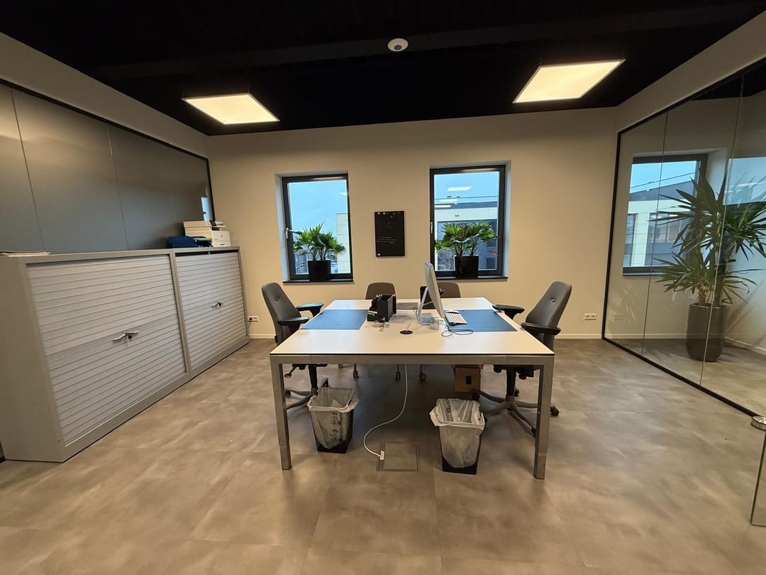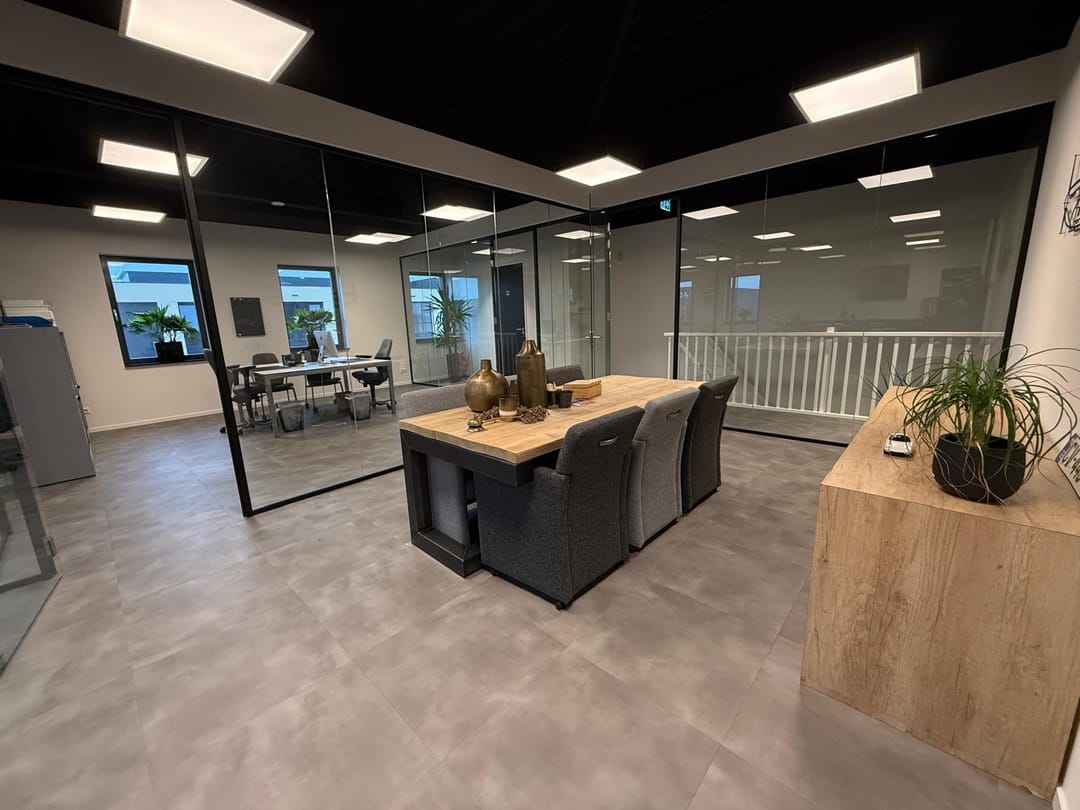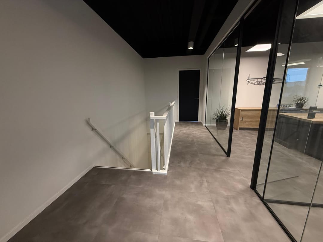 Aan de Smitspol 16A komt een nette kantoorruimte te huur. De ruimte maakt deel uit van een bedrijfsverzamelgebouw dat een moderne uitstraling heeft met een hoogwaardige afwerking. Bij binnenkomst valt direct het eigentijdse, industriële karakter op. De combinatie van het zwarte plafond, de strakke witte wanden en de moderne gietvloer-look geeft de ruimte een professionele en rustige uitstraling.