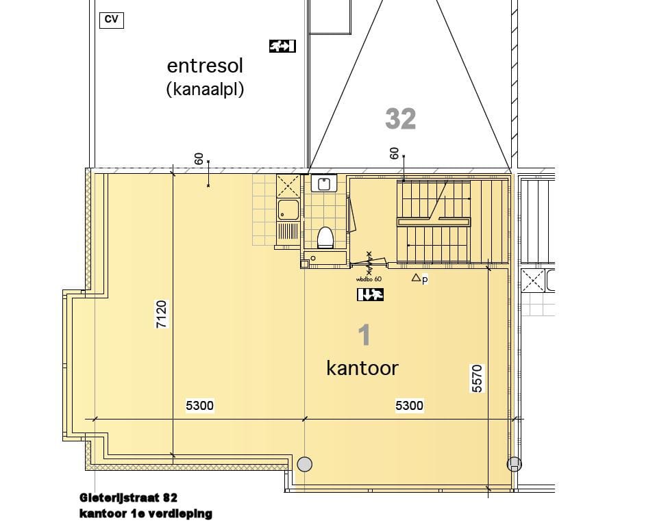 - 2e verdieping: overloop met toilet, alsmede een kantoorruimte ingedeeld in twee kantoorcompartimenten;