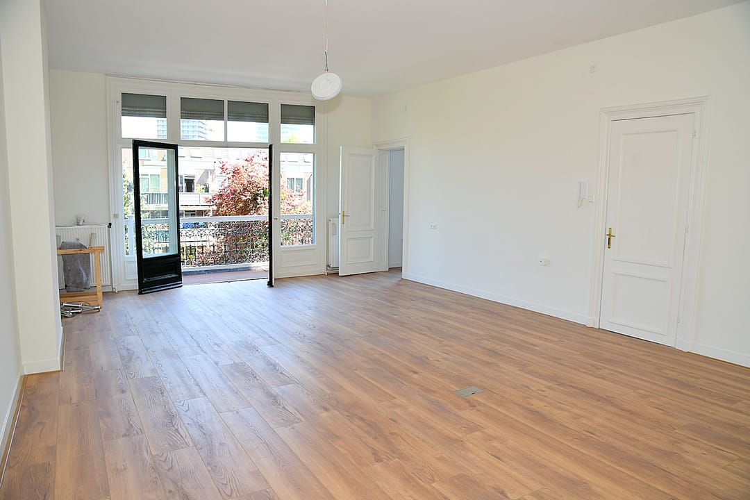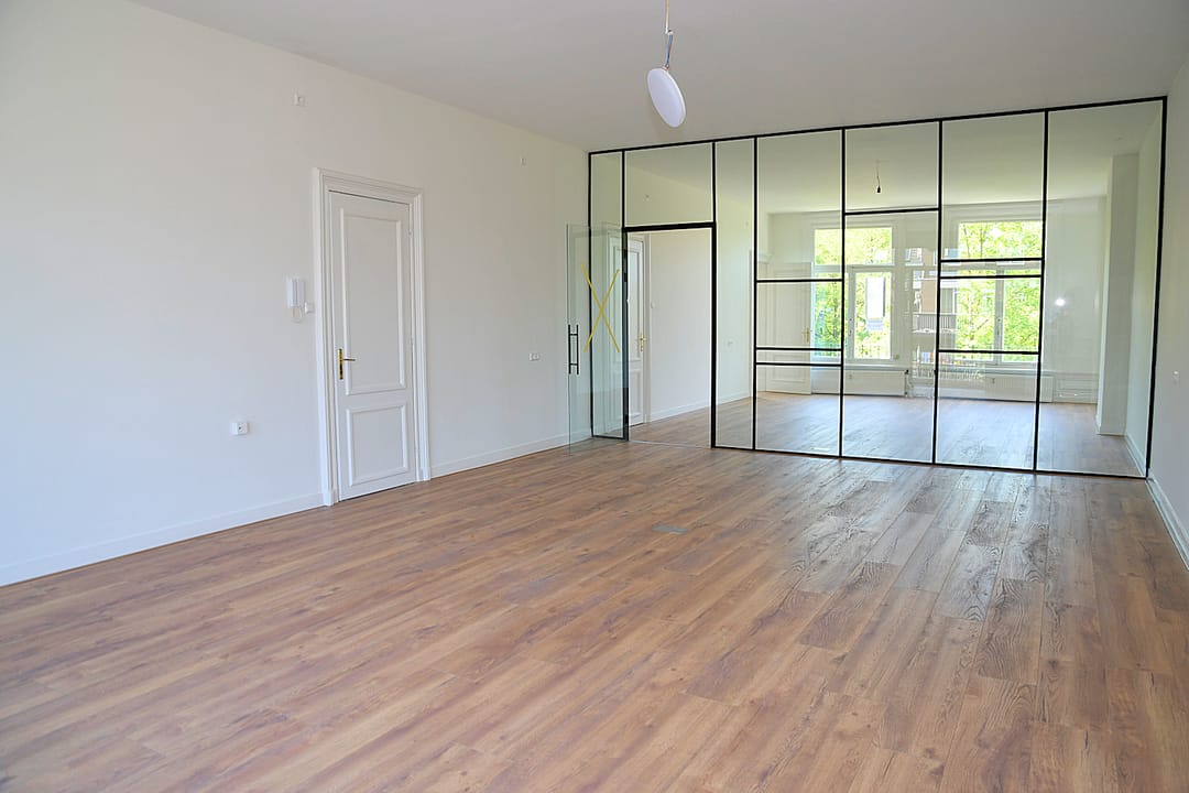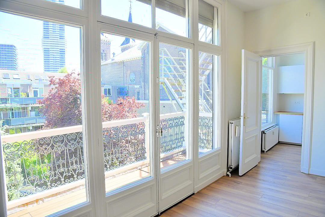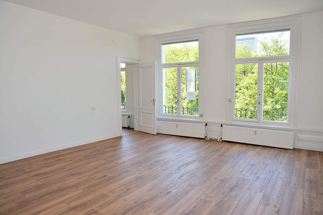 grote lichte kantoorruimte van voor- tot achtergevel (voorkamer 6.6 x 5.5 en achterkamer 9.0 x 5.5) met glazen scheidingswand , openslaande deuren naar zonnig terras ca. 5,5 x 1,5 en schitterend vrij uitzicht over de Westersingel,