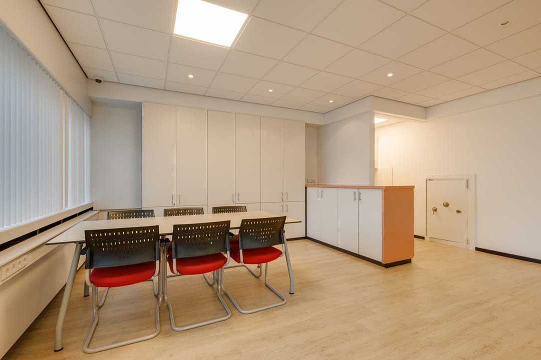 - Vaste werkplekken in een nette kantoorruimte, ingericht met bureaustoel en tafel, afsluitbare kastruimte;