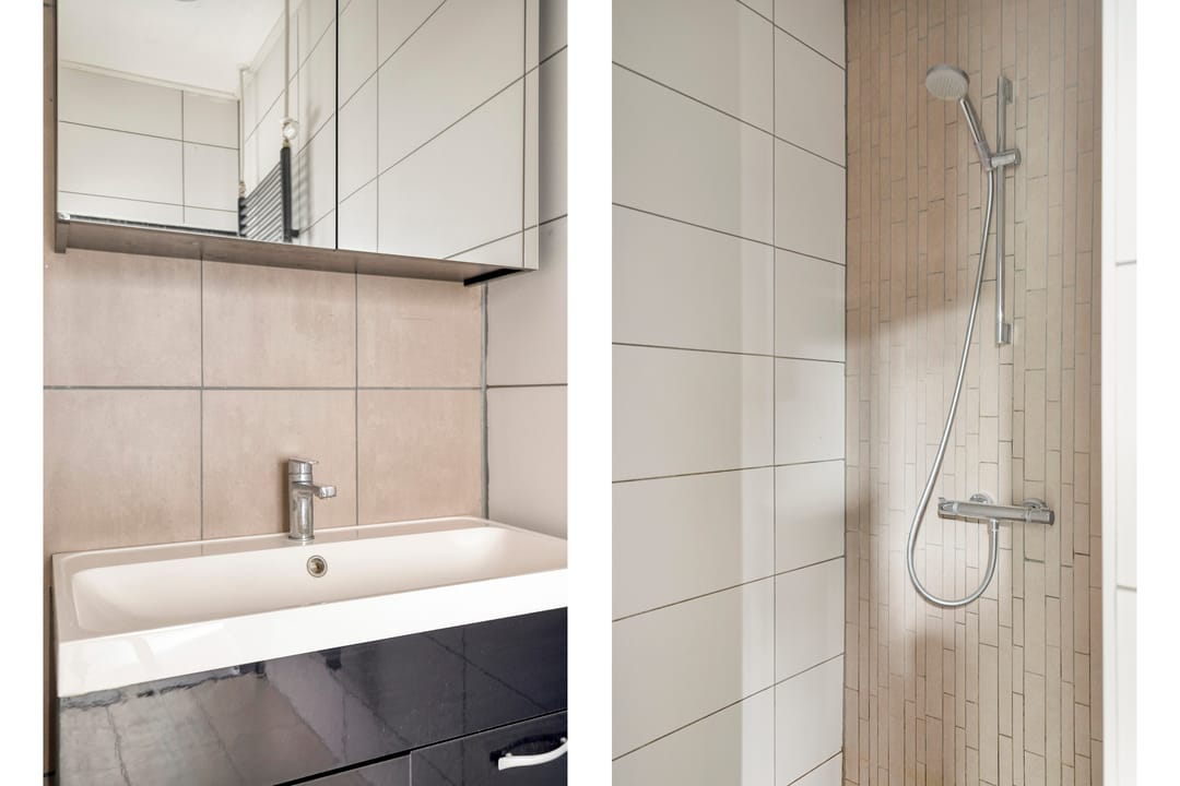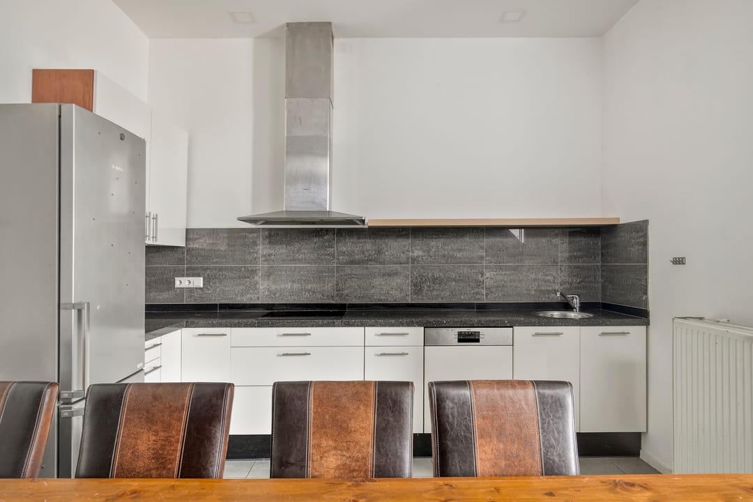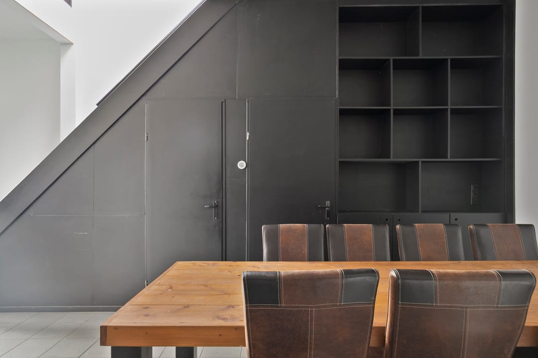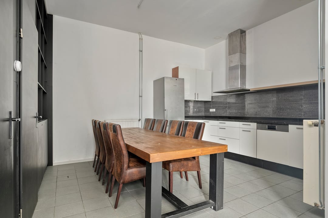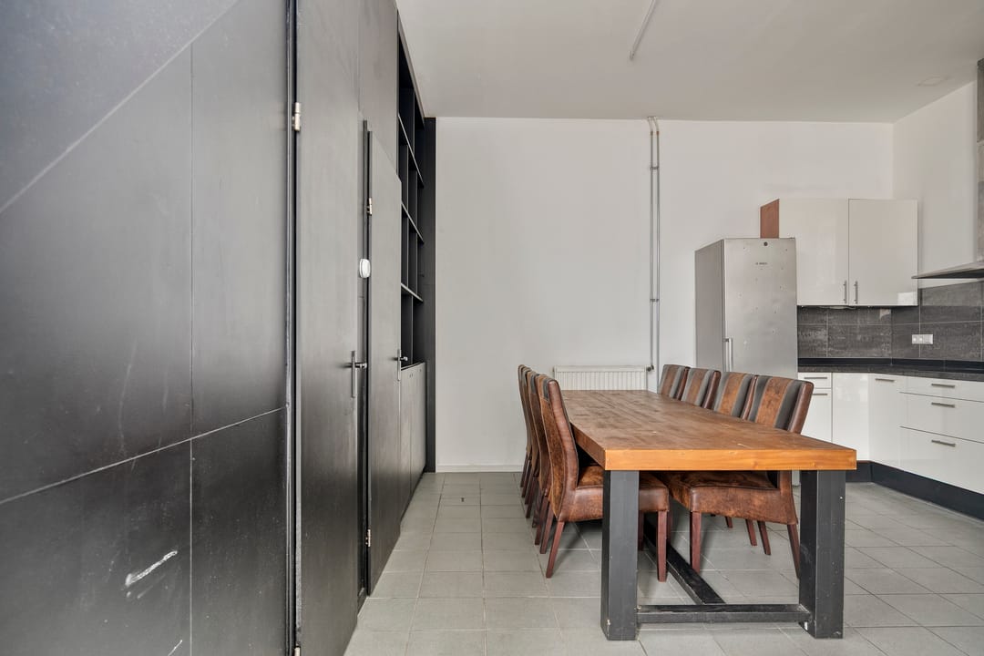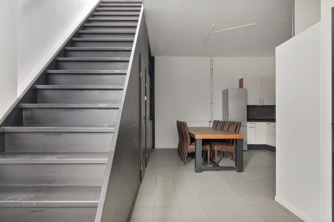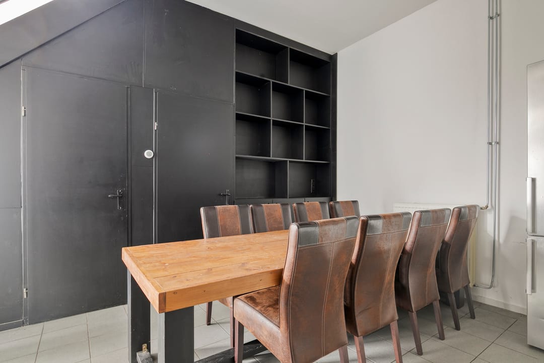 De kantine is ruim van opzet en voorzien van een hoekkeuken met diverse inbouwapparatuur, waaronder een vaatwasser, 4-pits gaskookplaat met afzuigkap, spoelbak, koelkast en voldoende kastruimte. Hier is genoeg plek voor een grote tafel, ideaal voor gezamenlijke lunches of informele overleggen. Onder de trap bevindt zich extra bergruimte, en daarnaast treft u een badkamer met wastafelmeubel met spiegelkast, designradiator en douche.