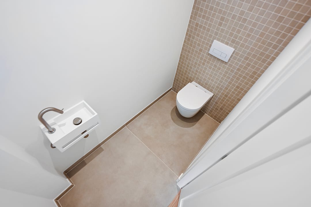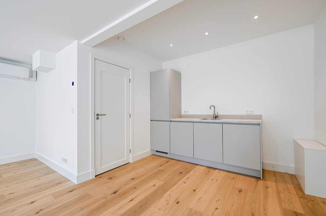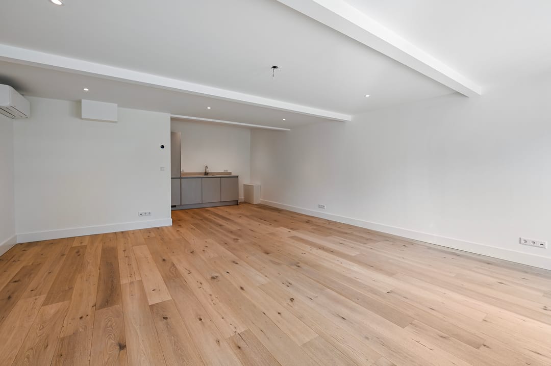 Dubbele openslaande entreedeuren, grote open ruimte, aan de achterzijde gelegen nieuwe keuken met vaatwasser en koelkast, modern toilet met fontein.