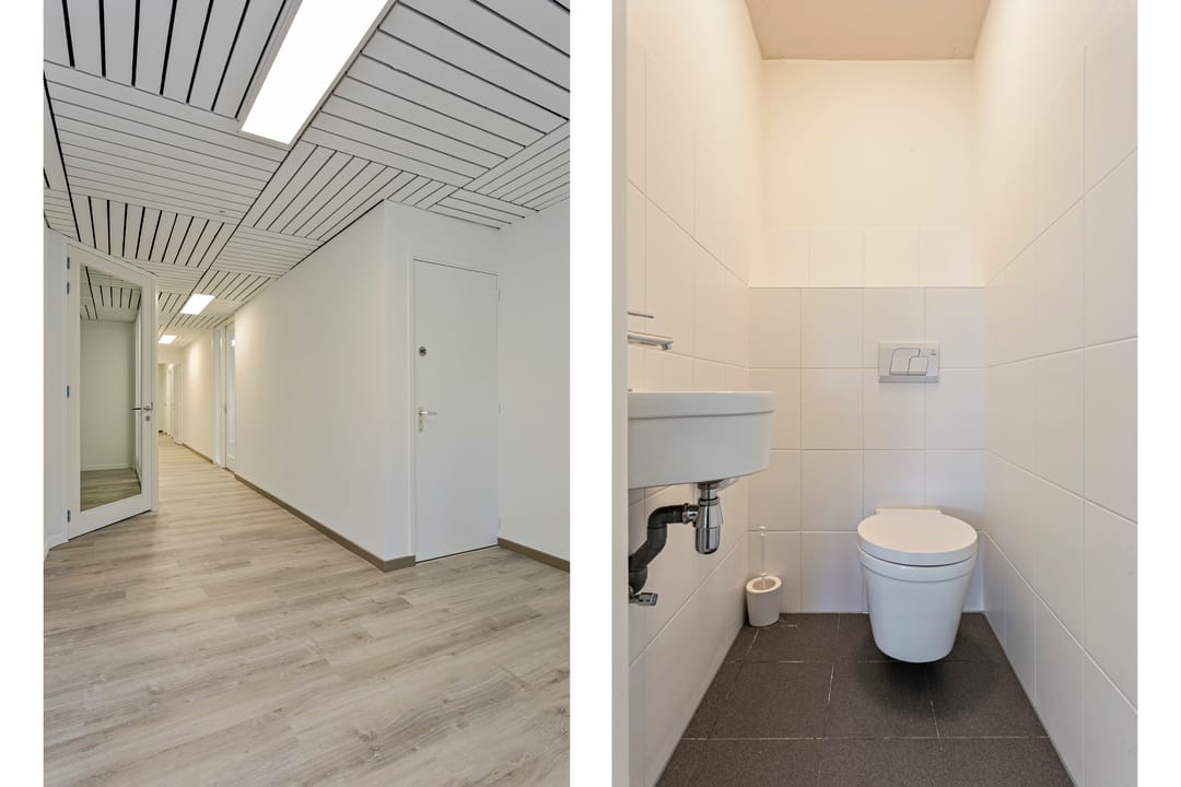 Gezamenlijke entree met toegang tot de diverse kantoorunits / praktijkruimtes, pantry en toiletten.