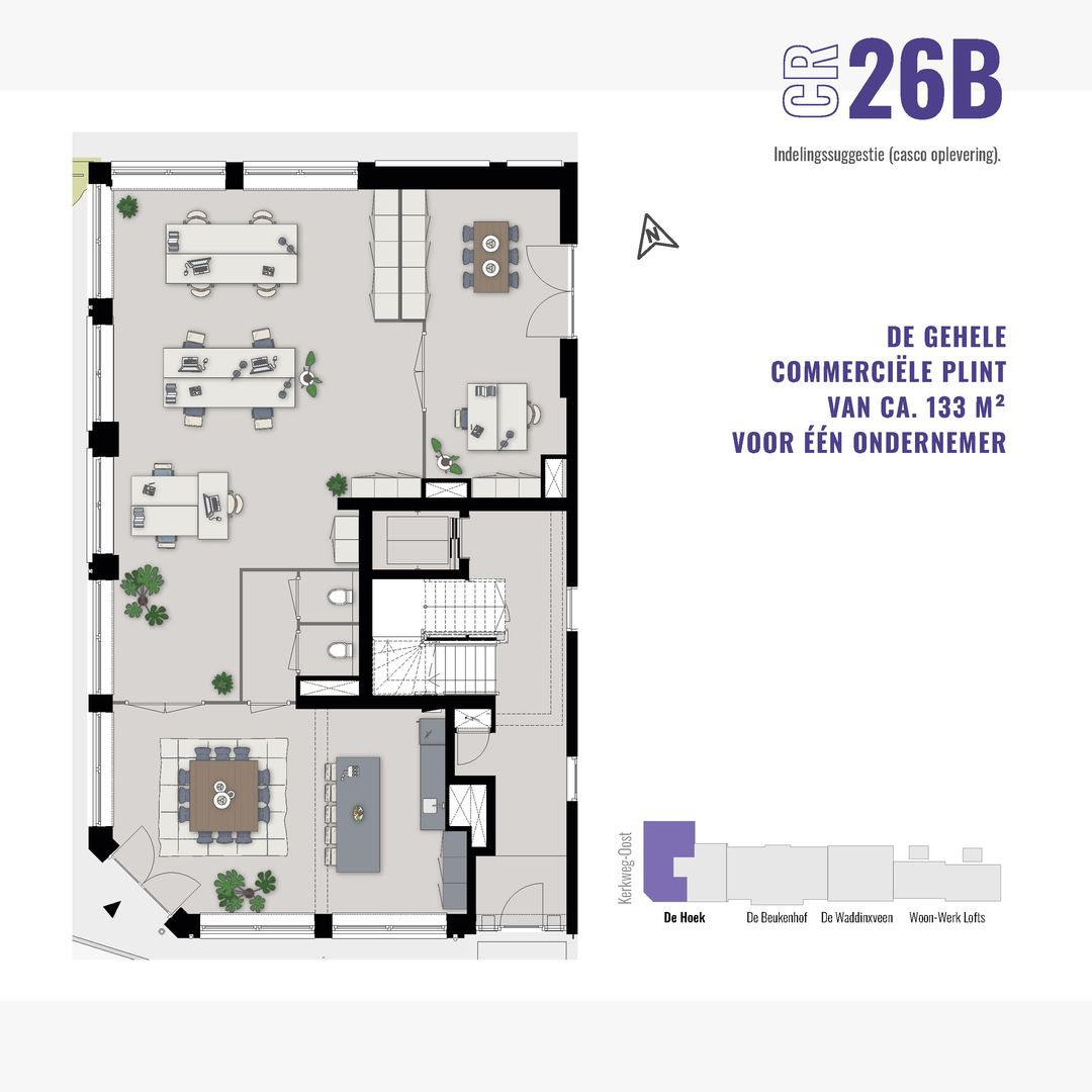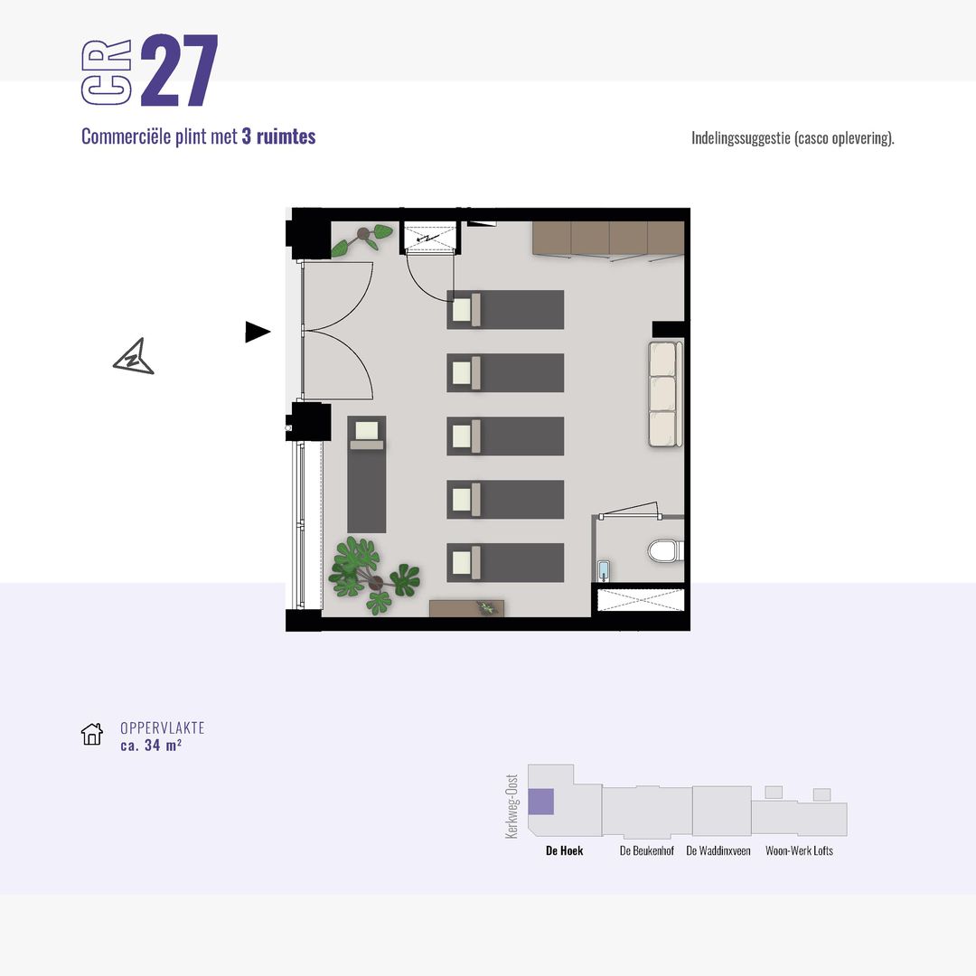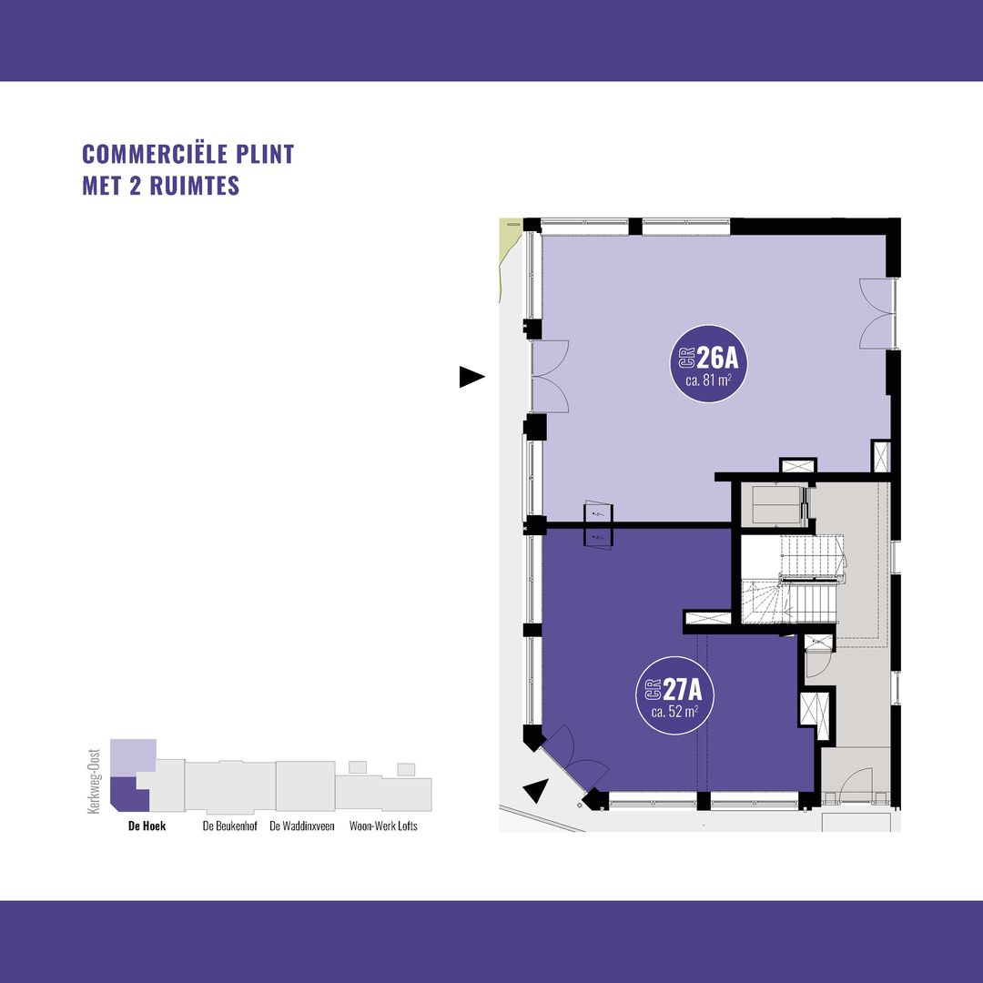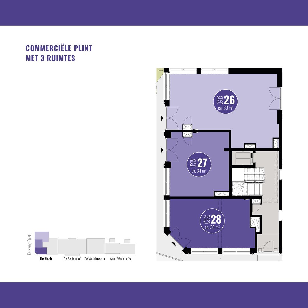 De commerciële ruimte(s) beginnen al bij 34 m2. Hier kun je klein beginnen of groter groeien. In totaal is de gehele commerciële plint 133 m² en flexibel indeelbaar voor één of maximaal drie ondernemers. De ruimte(s) worden te koop aangeboden, zodat jij een duurzame investering kunt doen in jouw eigen plek.