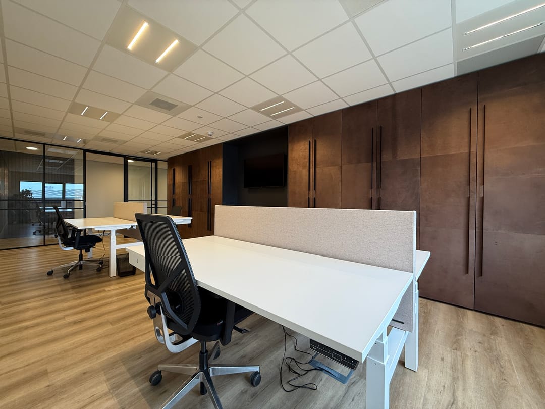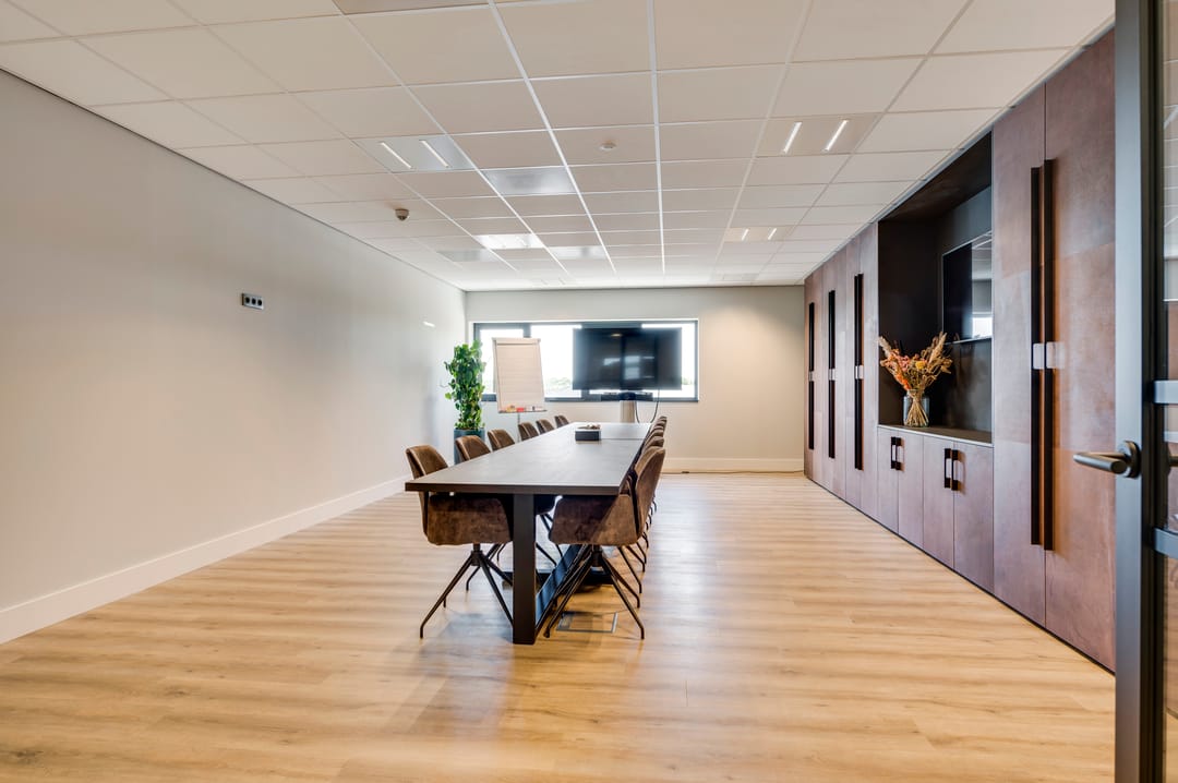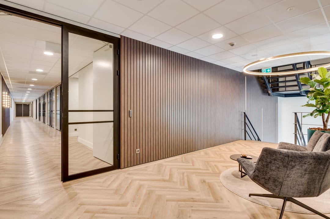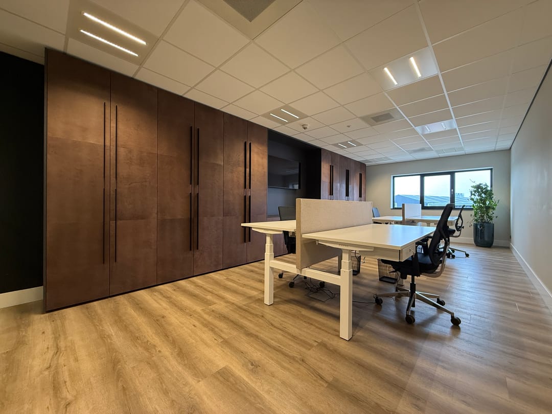 - strakke wandafwerking waarbij de kantoren zijn ingericht met maatwerk inbouwkasten;