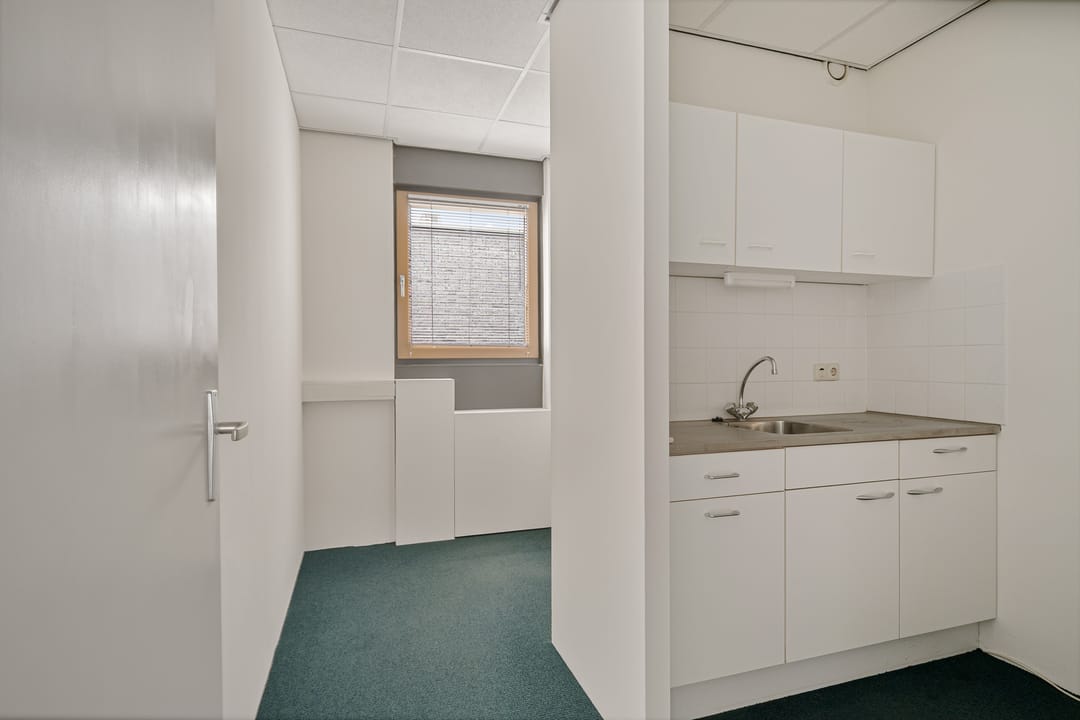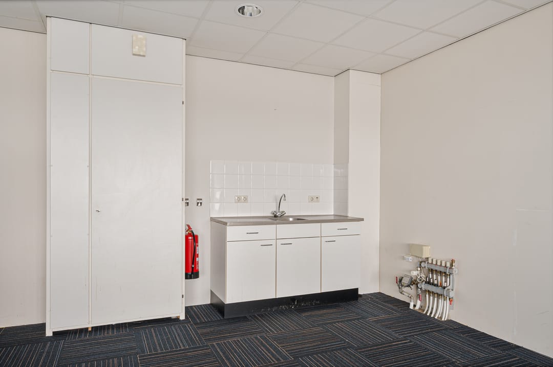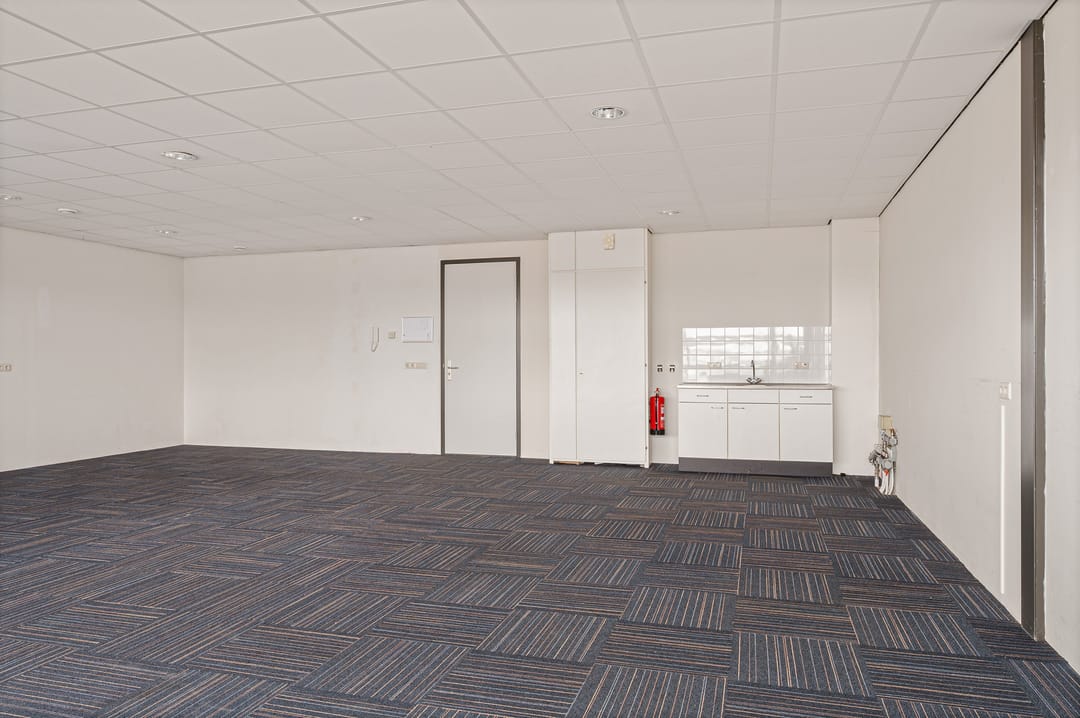 ca. 85 m² kantoorruimte in hoek van het hoofdgebouw met twee toegangsdeuren en is gelegen op de eerste verdieping voorzien van eigen meterkast in de unit, met klein keukenblok voorzien van boiler en gemeenschappelijke toiletruimte op de begane grond. De verdieping is bereikbaar via een vaste trap.