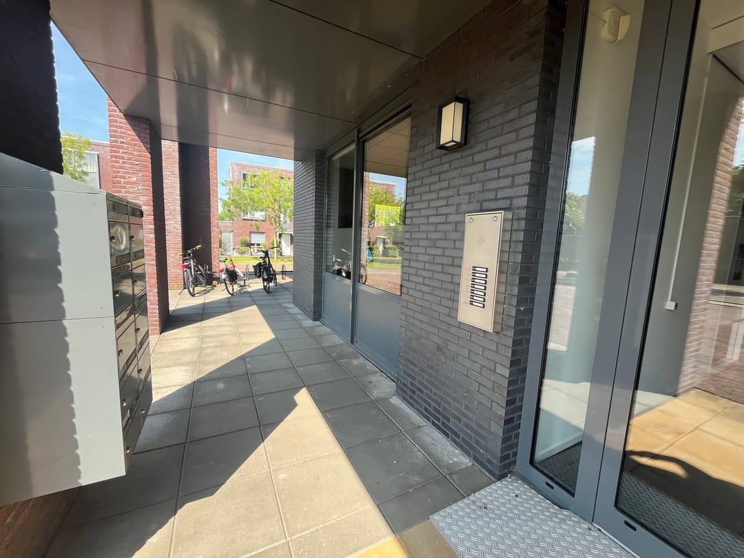 De hoofdentree / toegangsdeur is voorzien van een automatische opener. Hier bevind zich het intercomsysteem en de brievenbussen.