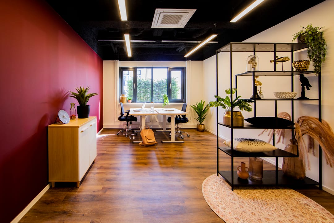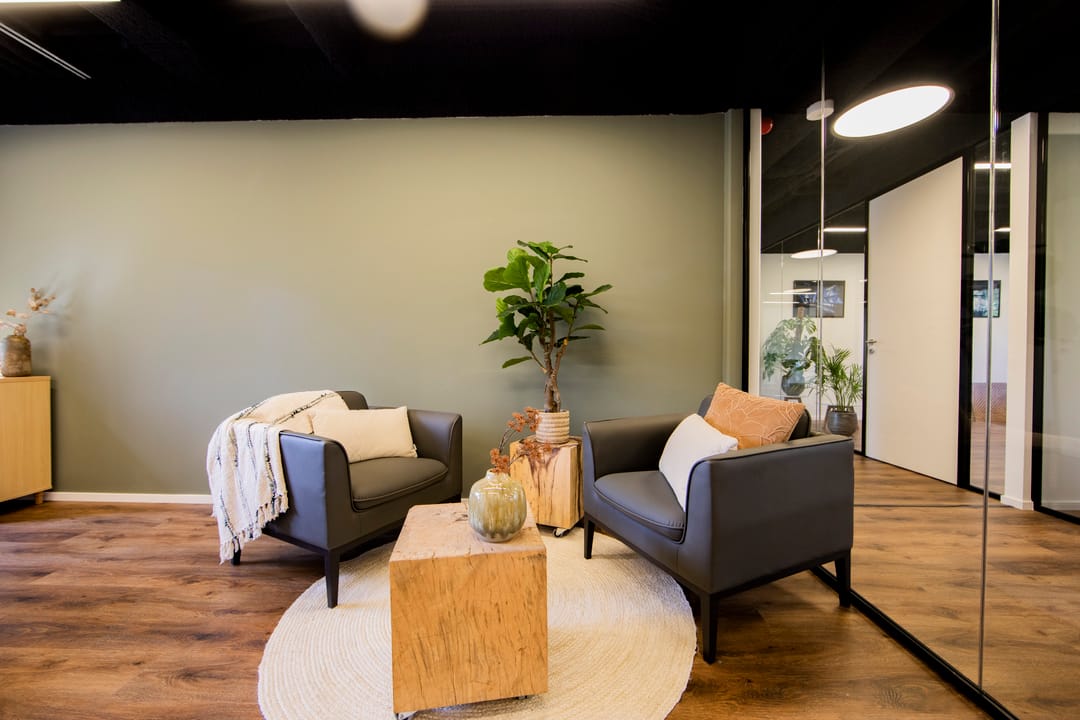 De centrale ontvangstruimte biedt overleg- en werkplekken. Het gebouw biedt een inspirerende werkomgeving en netwerkmogelijkheden met glasvezelverbinding, eigen IP-adres en eigen netwerk.