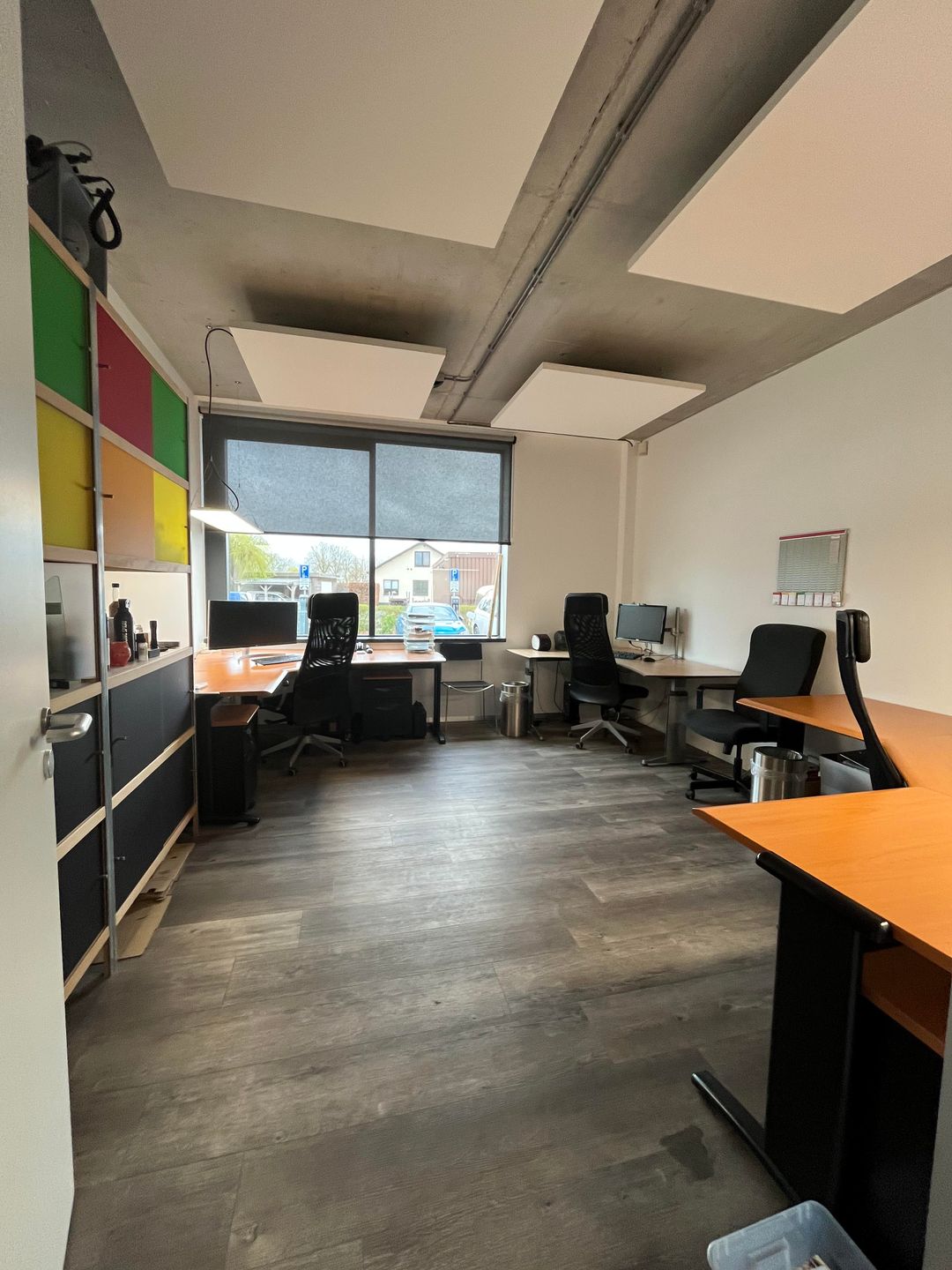 • open kantoorruimte met hoge deur, systeemscheidingswanden en daglichttoetreding;