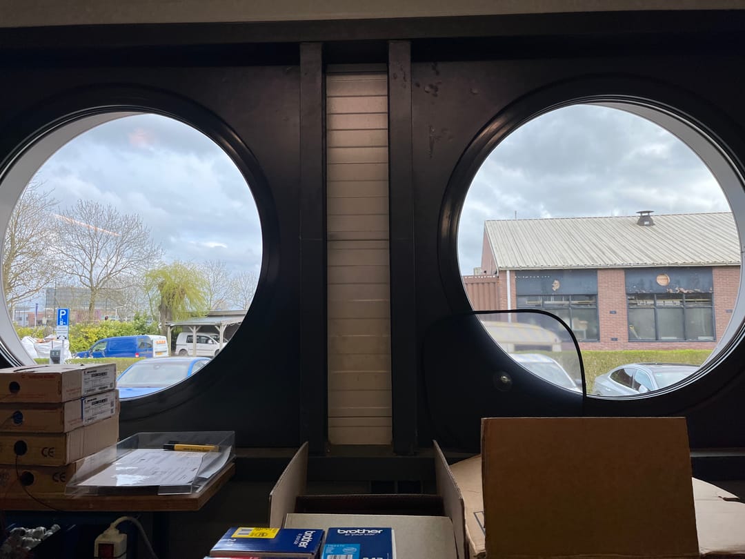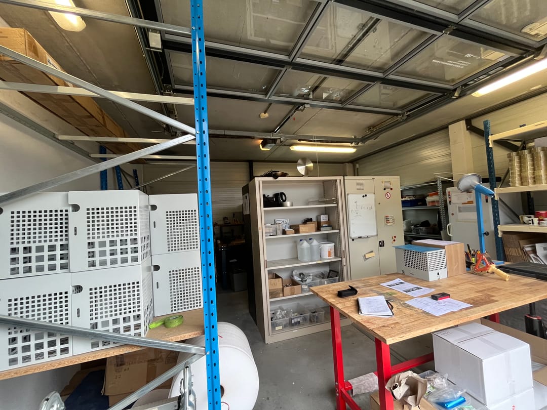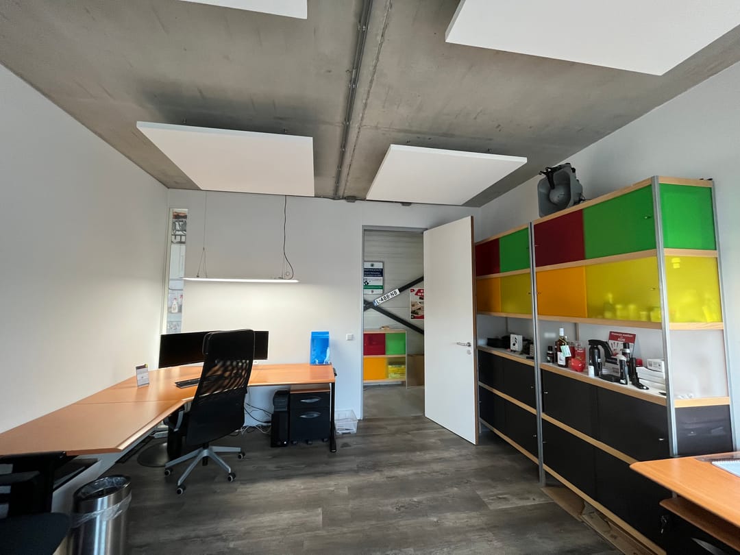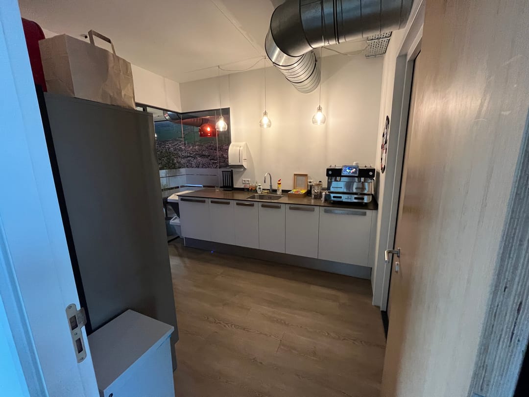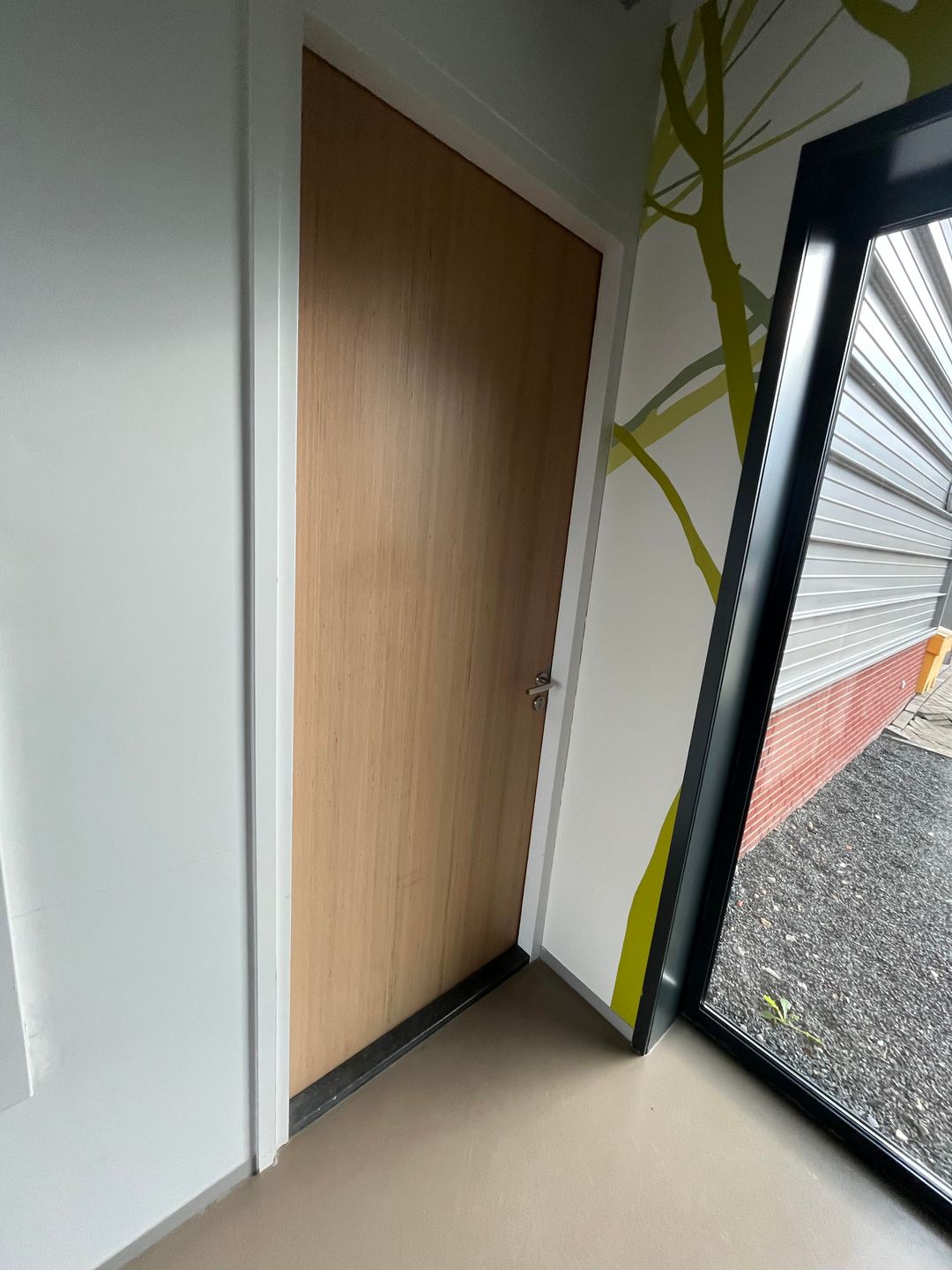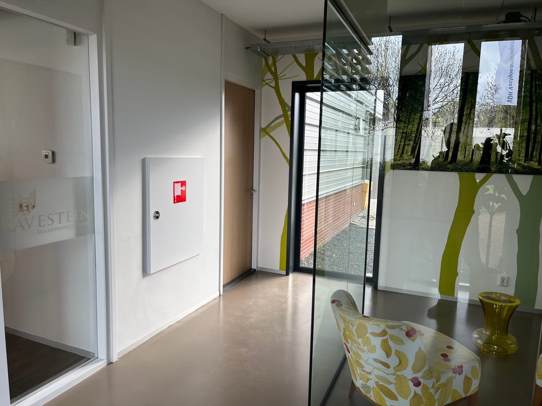 • pvc vloerafwerking in kantoor en betonvloer in de bedrijfsruimte;