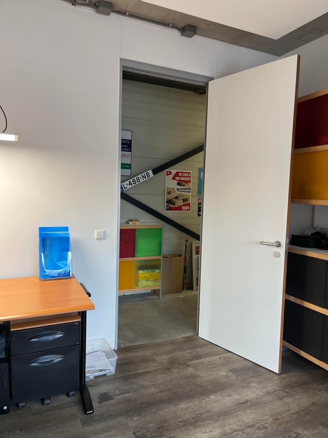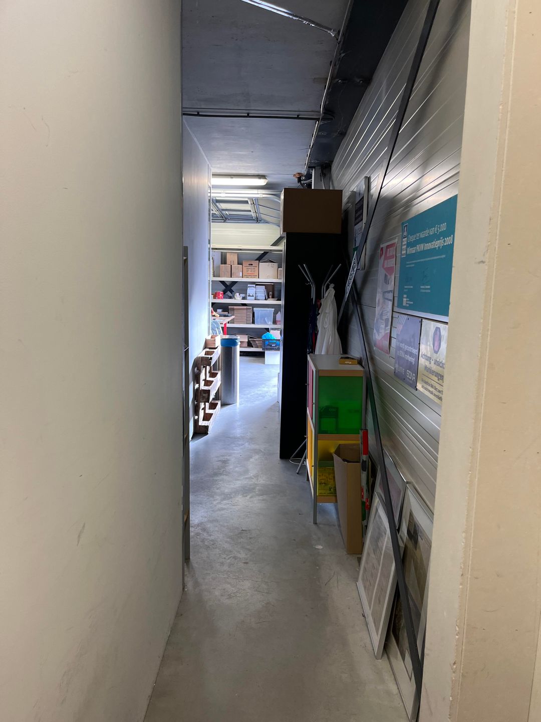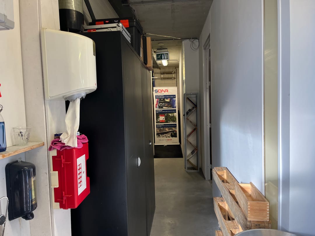 Bij binnenkomst in ruimte A0.2 betreedt u een gang die leidt naar het kantoor, gesitueerd aan de linkerzijde en v.v. een hoge deur. Aan het einde van de gang bevindt zich de bedrijfsruimte.