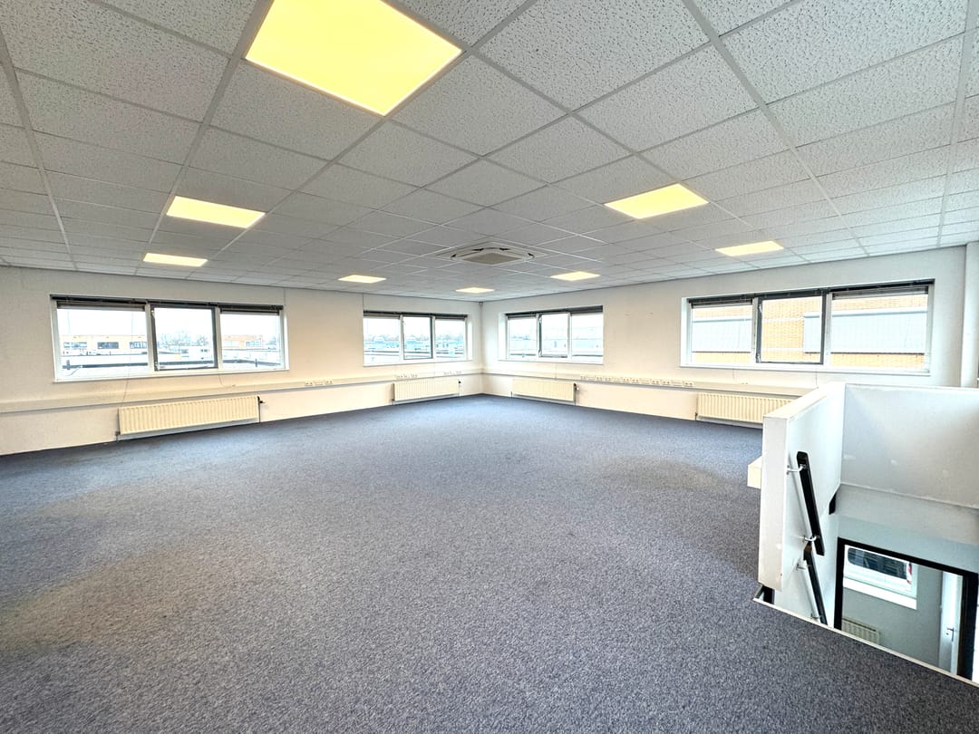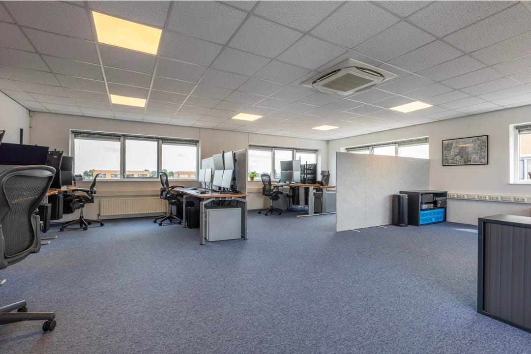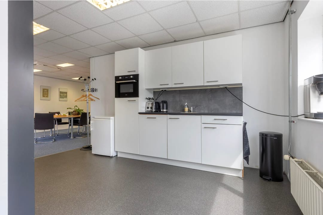 1e verdieping: Een riante lichte kantoorruimte met een nette keuken, en een tweede kantoorkamer met veel opbergruimte.