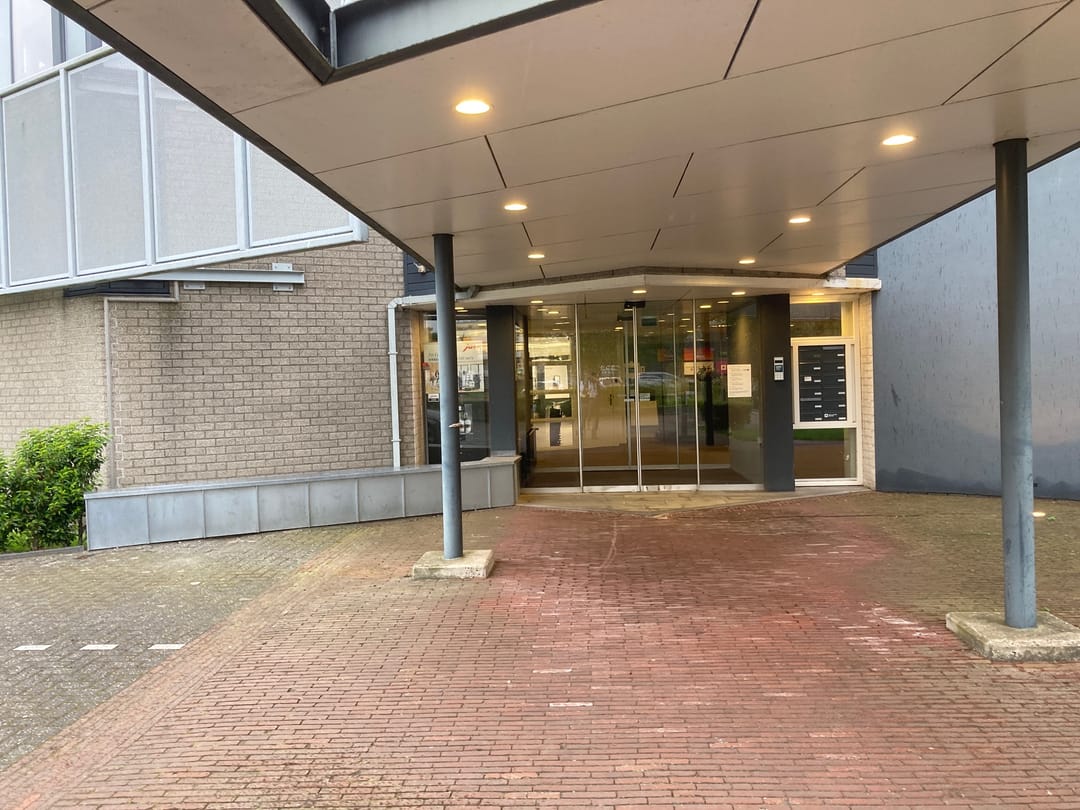 The office has many windows with a view of the main entrance and the surrounding greenery.
