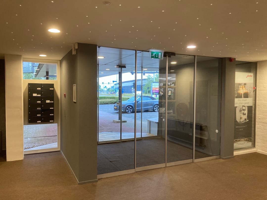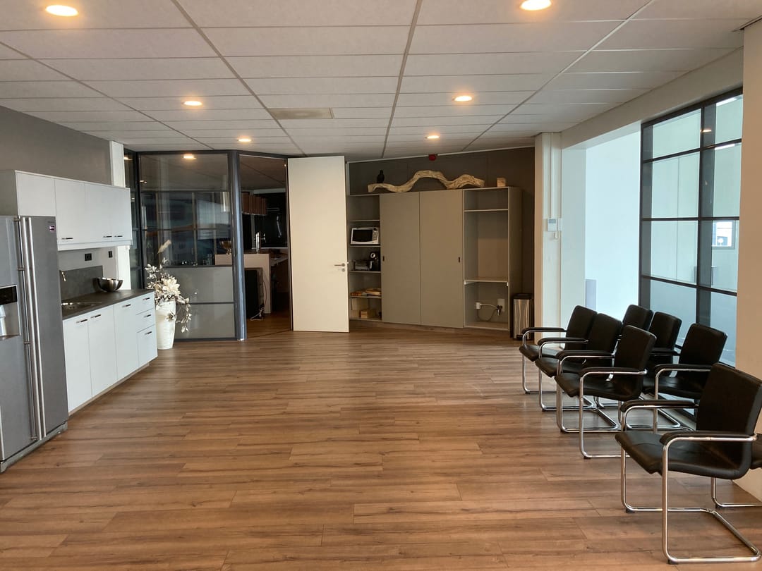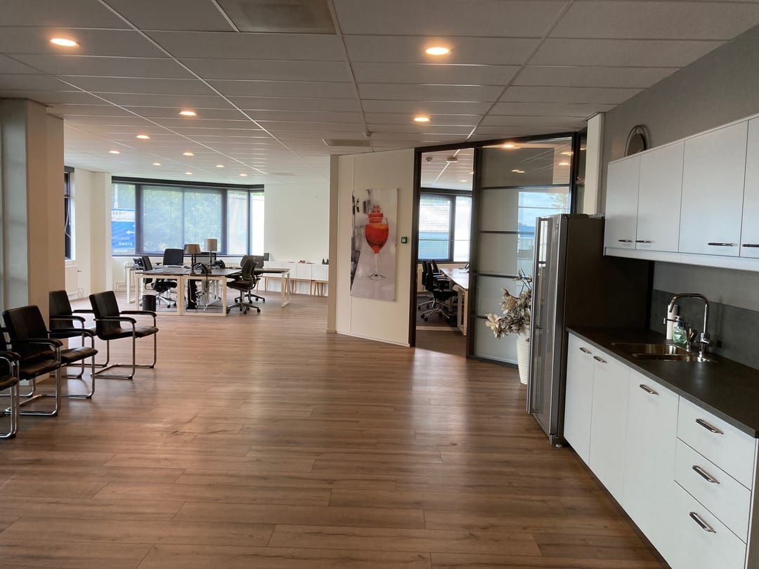 The office space is neatly finished with sleek walls, floor finishing (current construction), solid front door, modern suspended ceilings with LED lighting, presentationroom / bar, heating via central heating.
